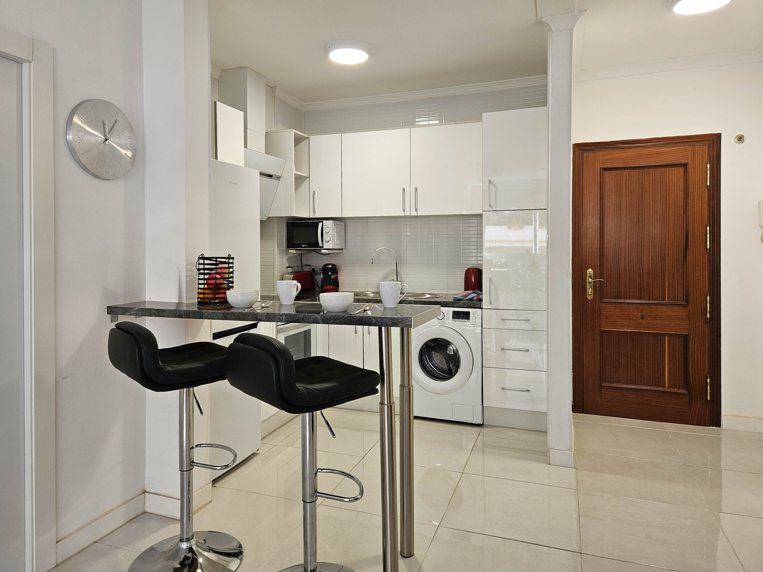 The well-equipped kitchen includes a breakfast bar with stools, ideal for casual dining.