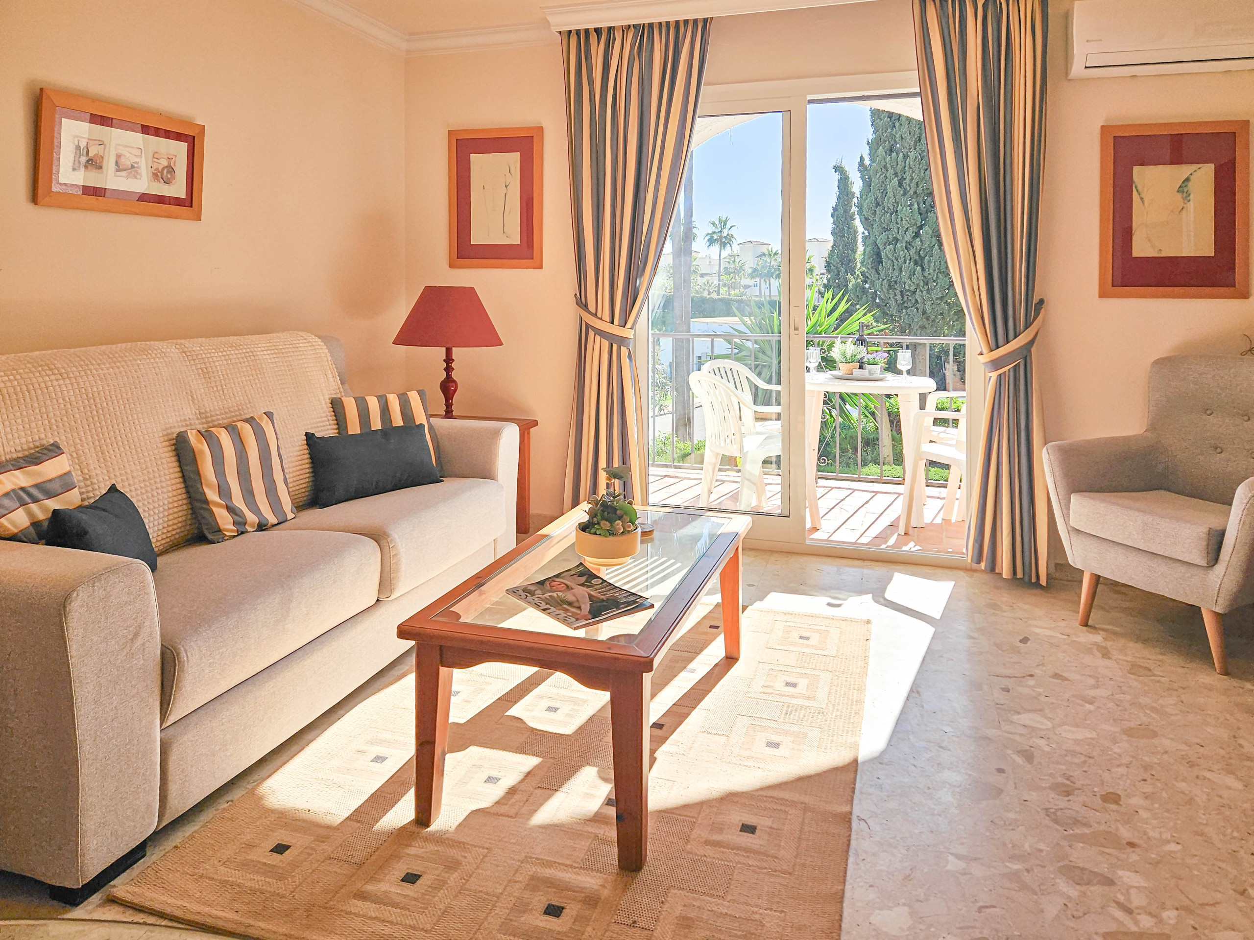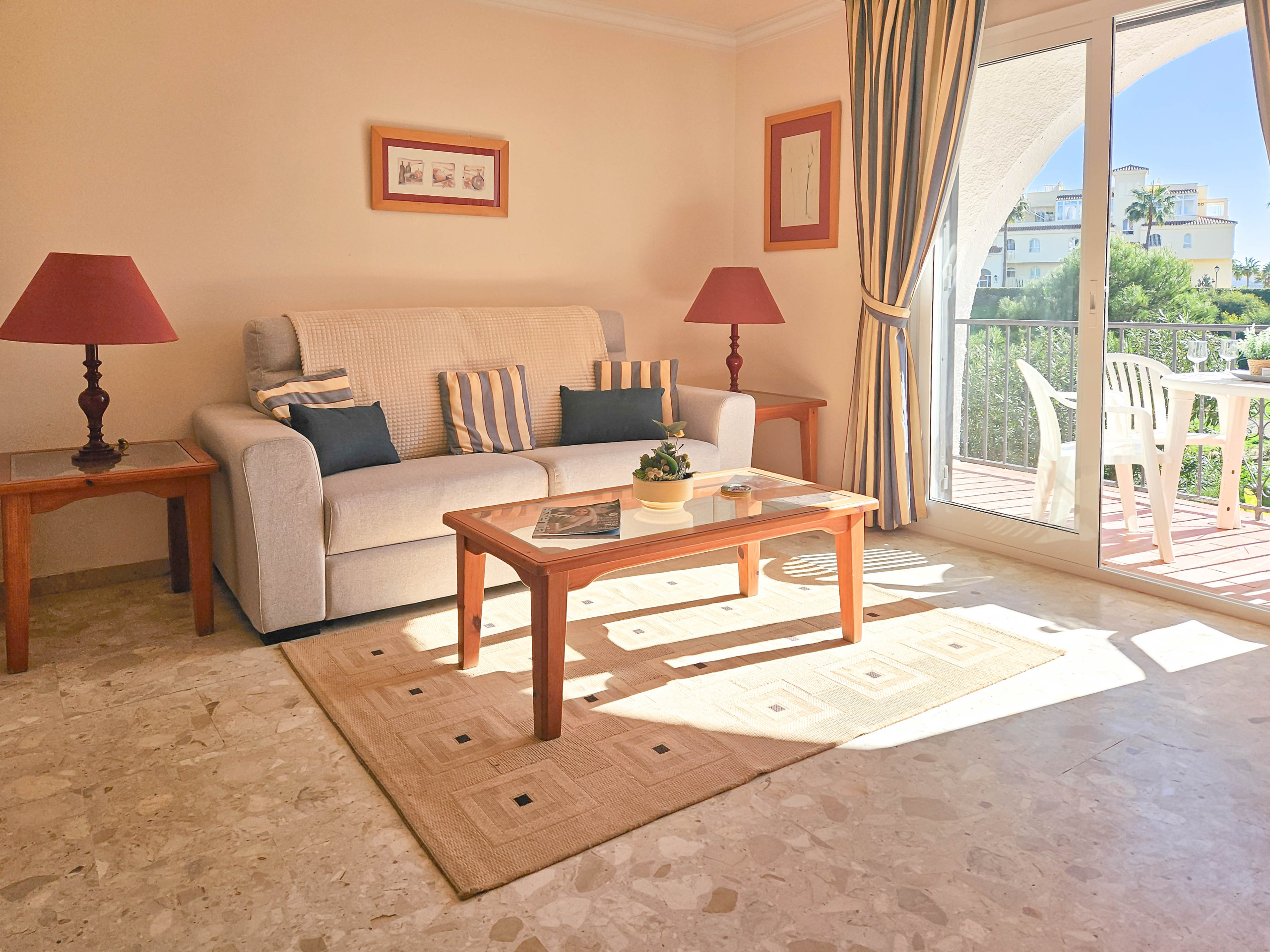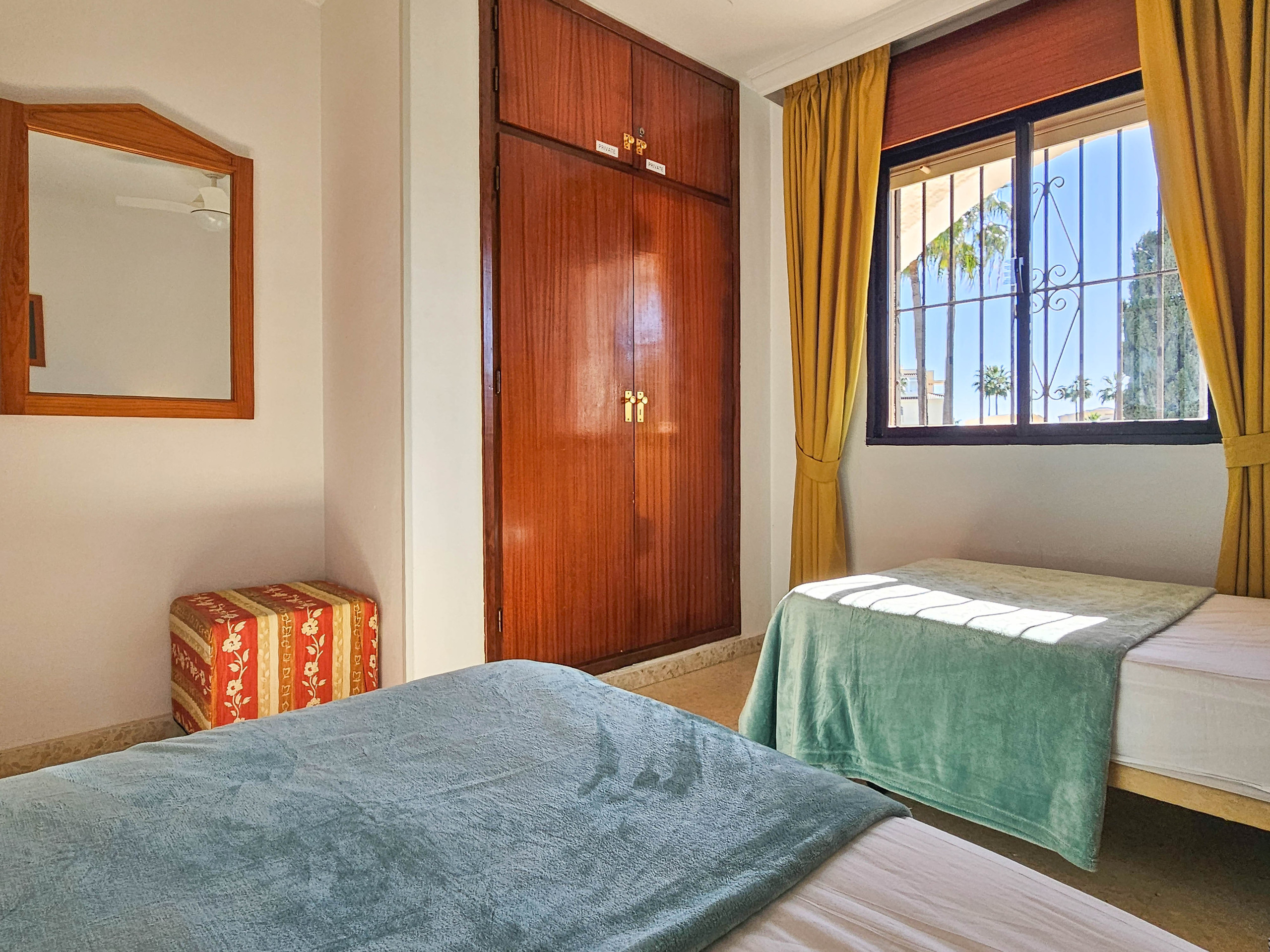 The master bedroom is furnished with a king size bed and the guest bedroom offers twin beds. Both bedrooms have fitted wardrobes and shutters. The apartment benefits from a family bathroom, fitted with a bath with a shower attachment and also a washing machine.