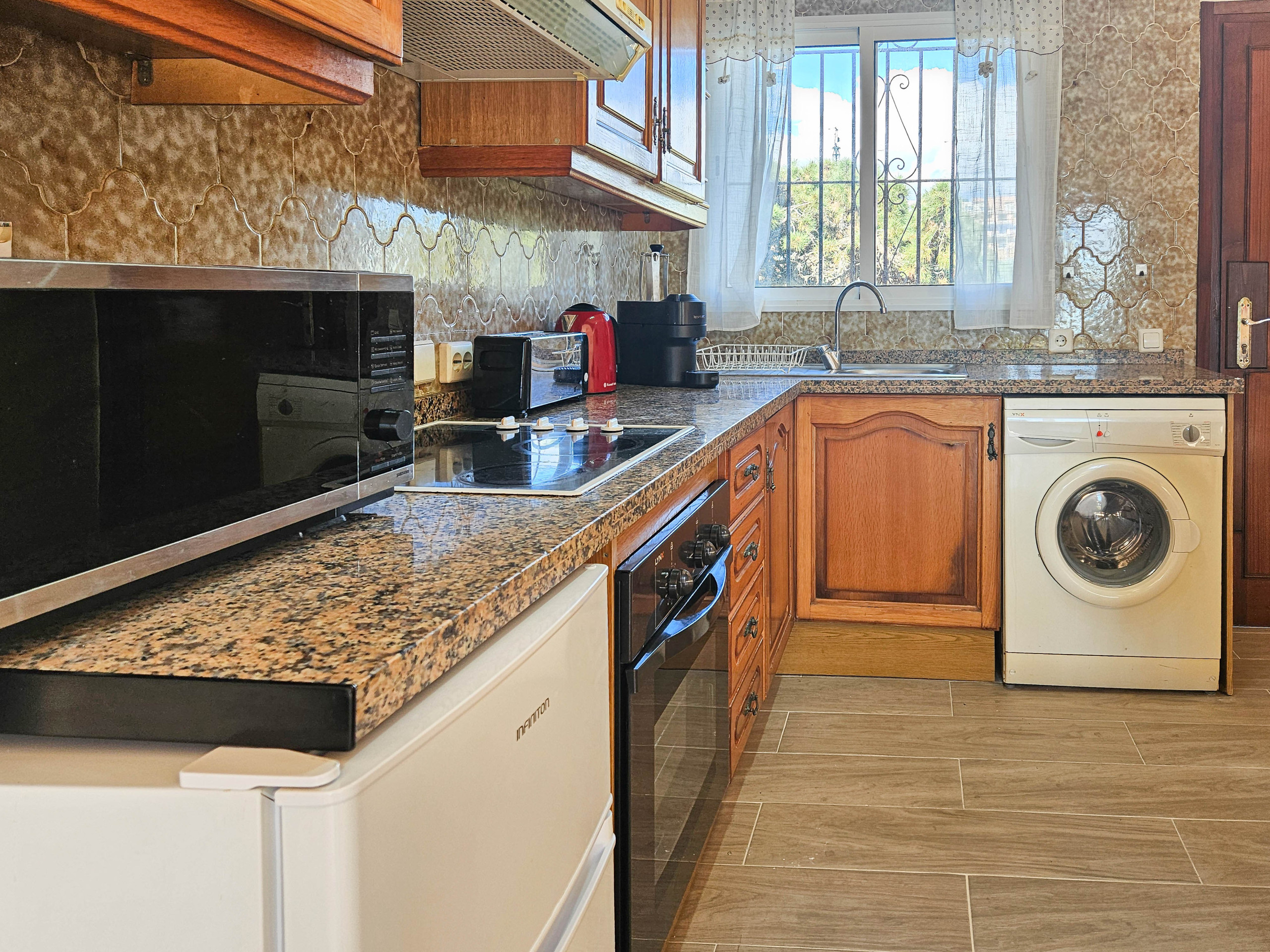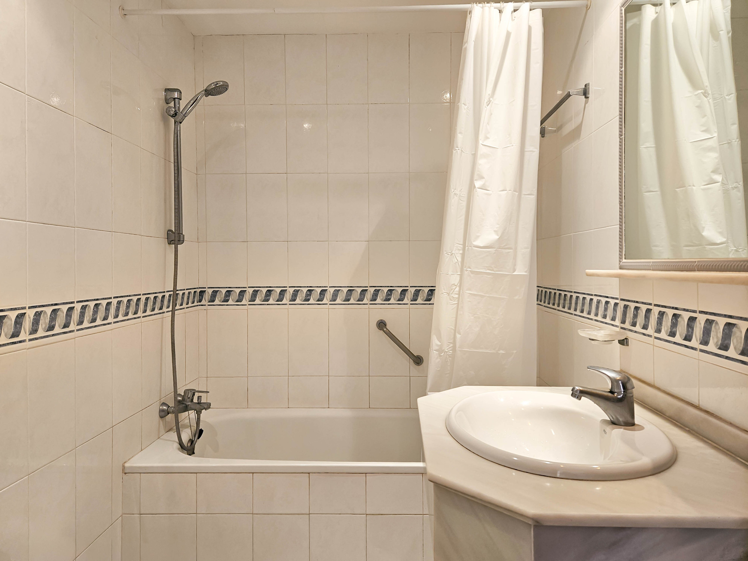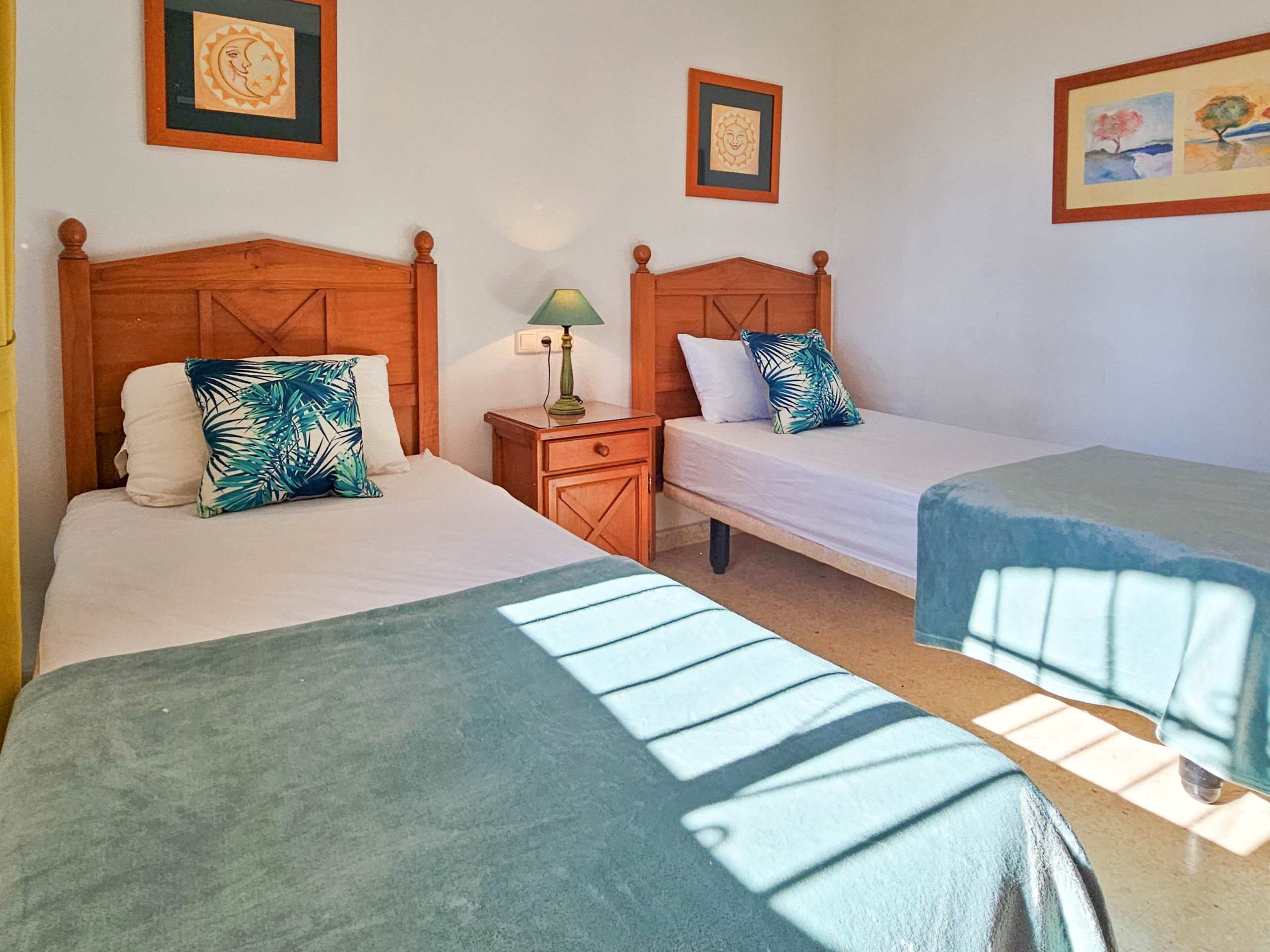The master bedroom is furnished with a king size bed and the guest bedroom offers twin beds. Both bedrooms have fitted wardrobes and shutters. The apartment benefits from a family bathroom, fitted with a bath with a shower attachment and also a washing machine.