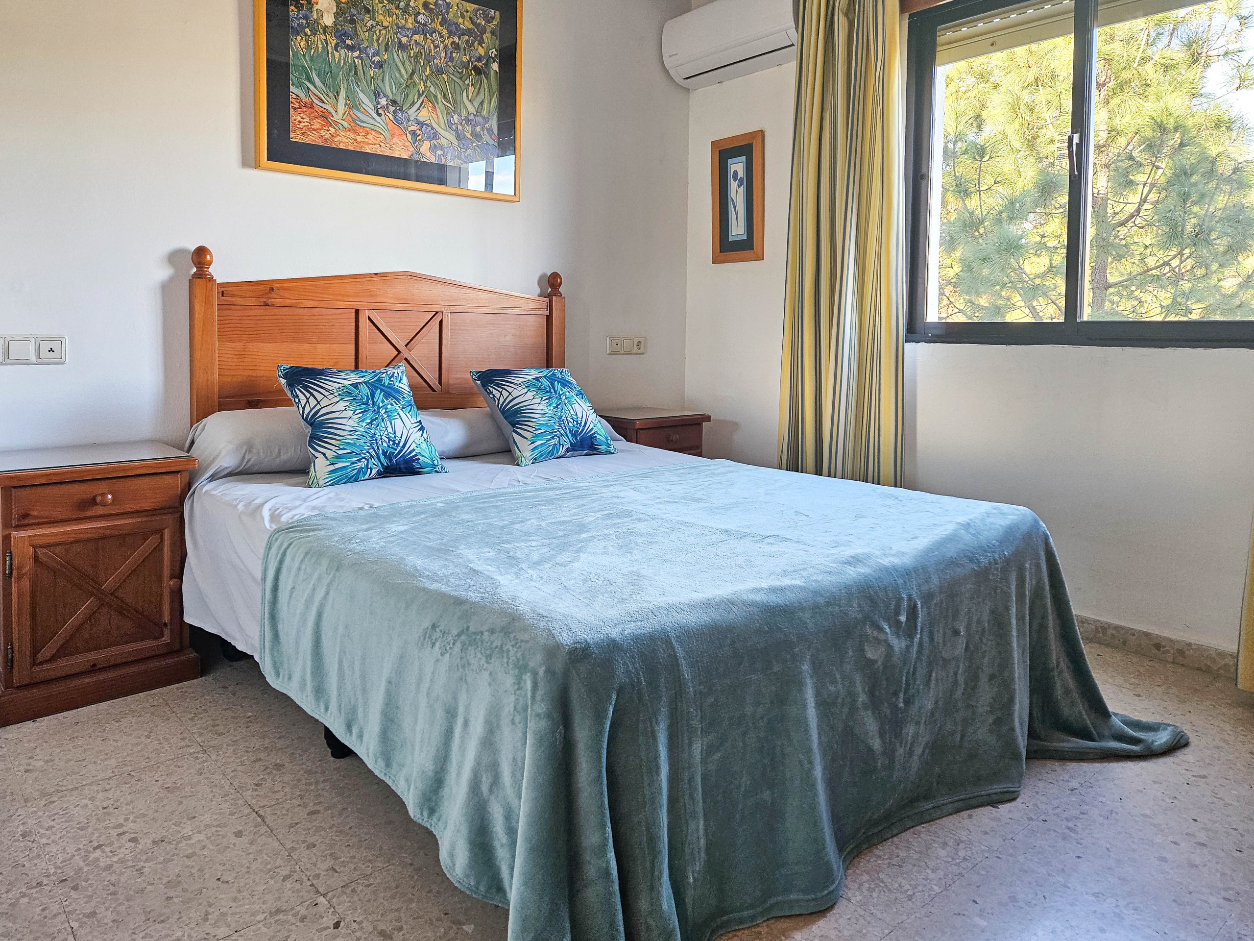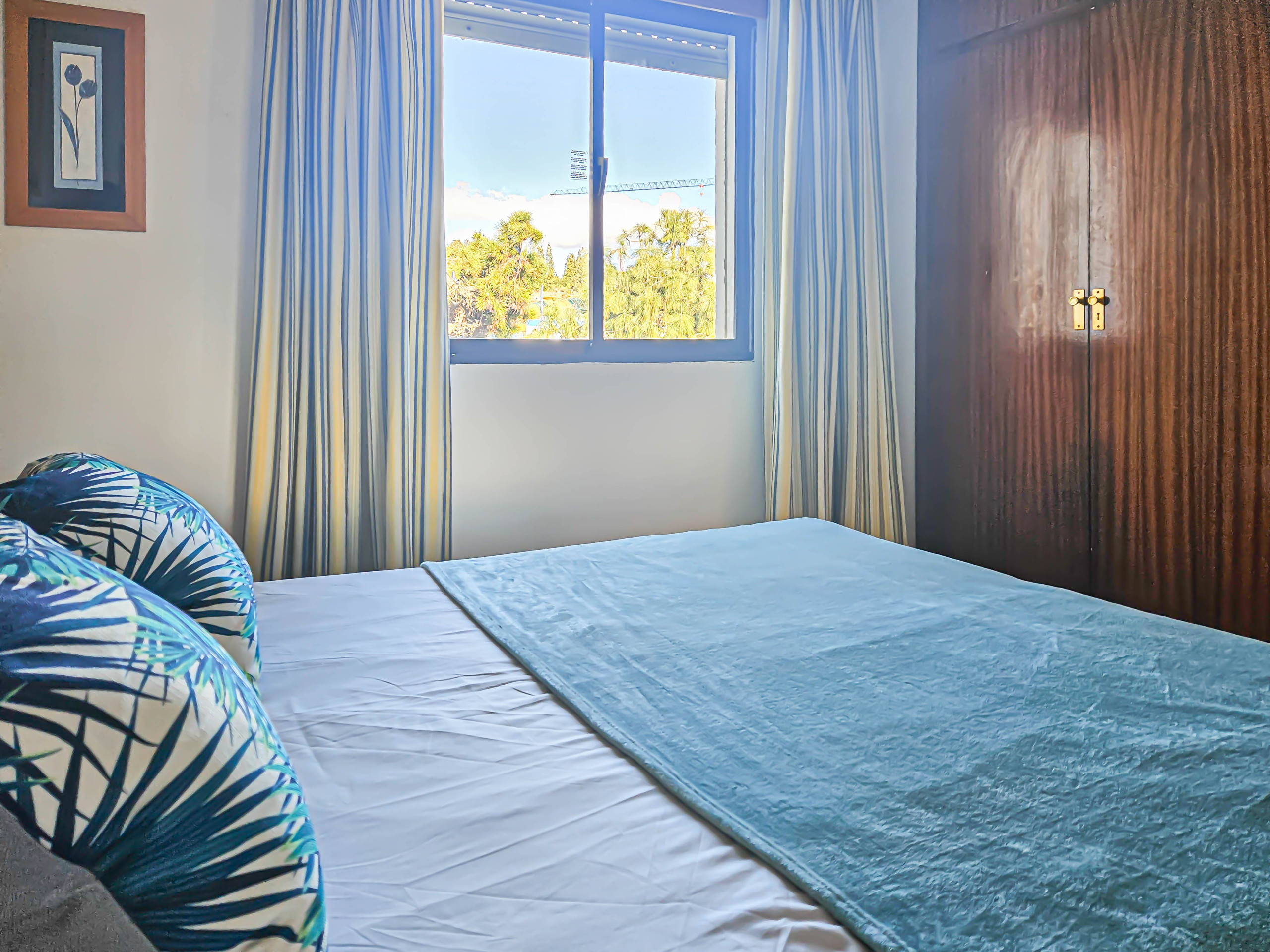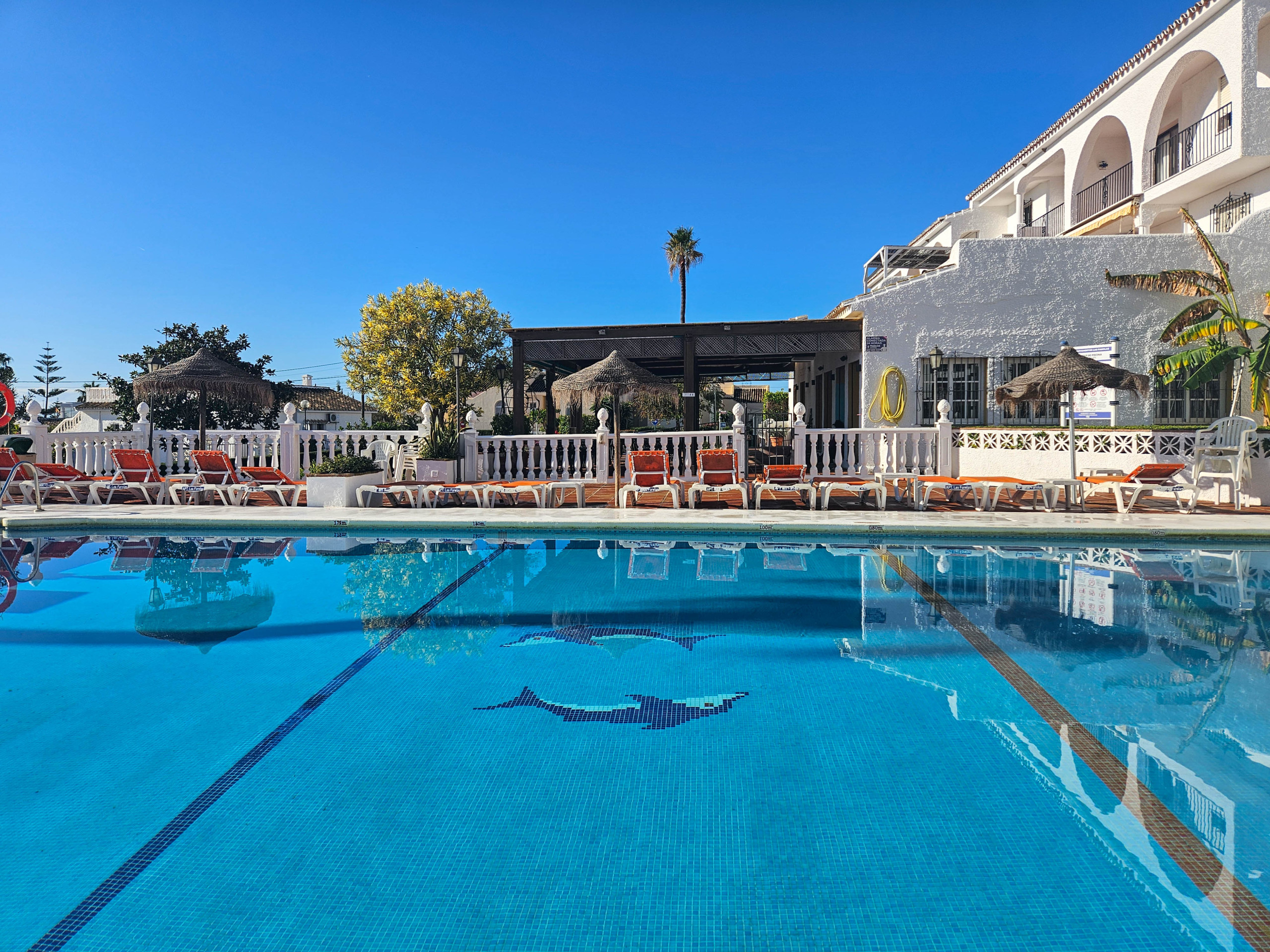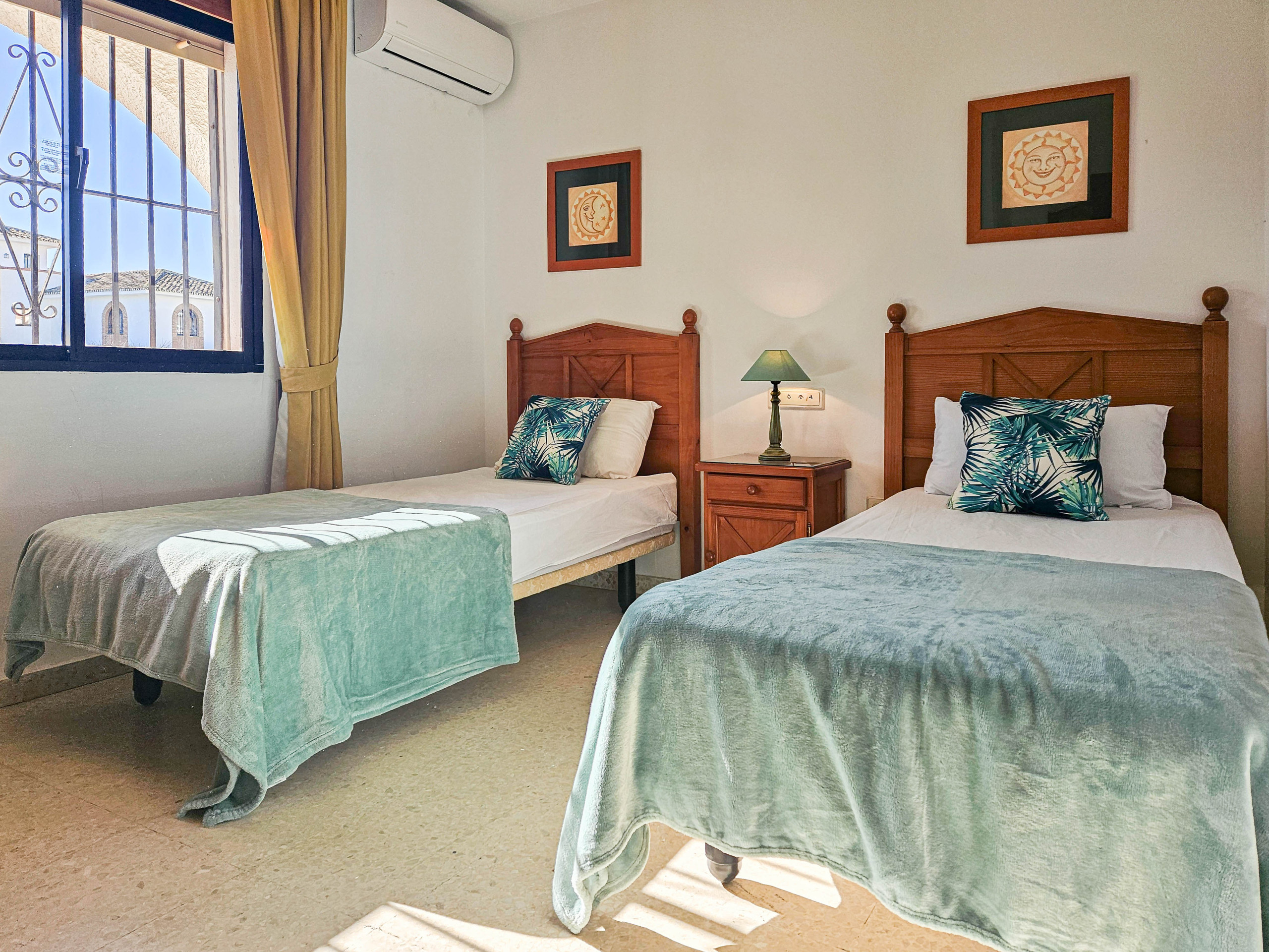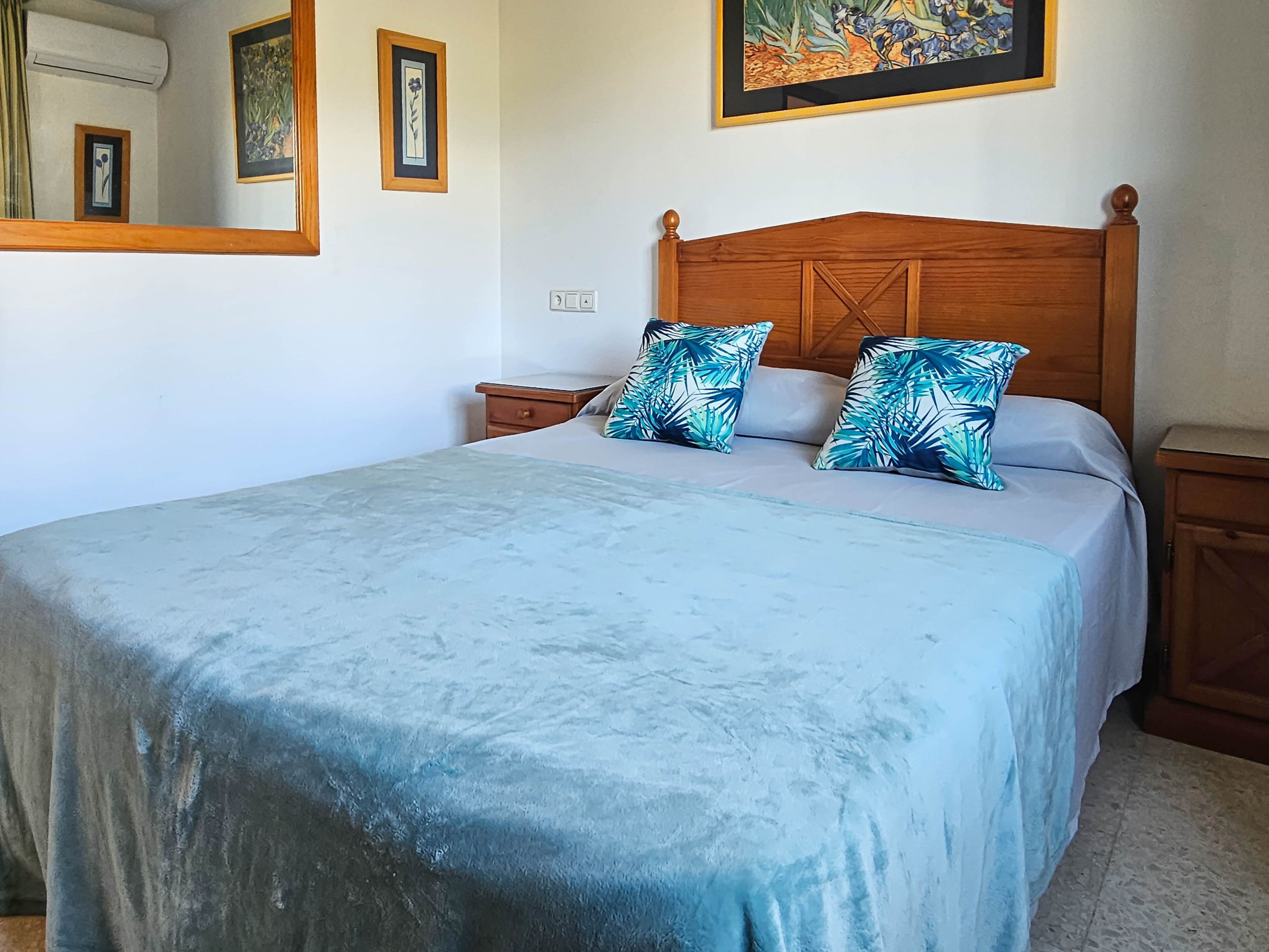 This two bedroom apartment is conveniently situated in the complex of Las Farolas, Mijas Costa. The complex offers lovely, well maintained communal gardens and swimming pool area, and is just 700m from the beach. El Chaparral Golf course is only 1km from the complex and there is a restaurant conveniently located 200m away. La Cala is just a few minutes dive away (3km) and is packed with culture, bars, restaurants, shop, banks great beaches etc. Fuengirola is just 3km in the other direction again with many shops, nightlife, castle and long stretches of beaches. The apartment is fitted with ceiling fans and aircon units in the lounge and bedrooms and free WIFI.