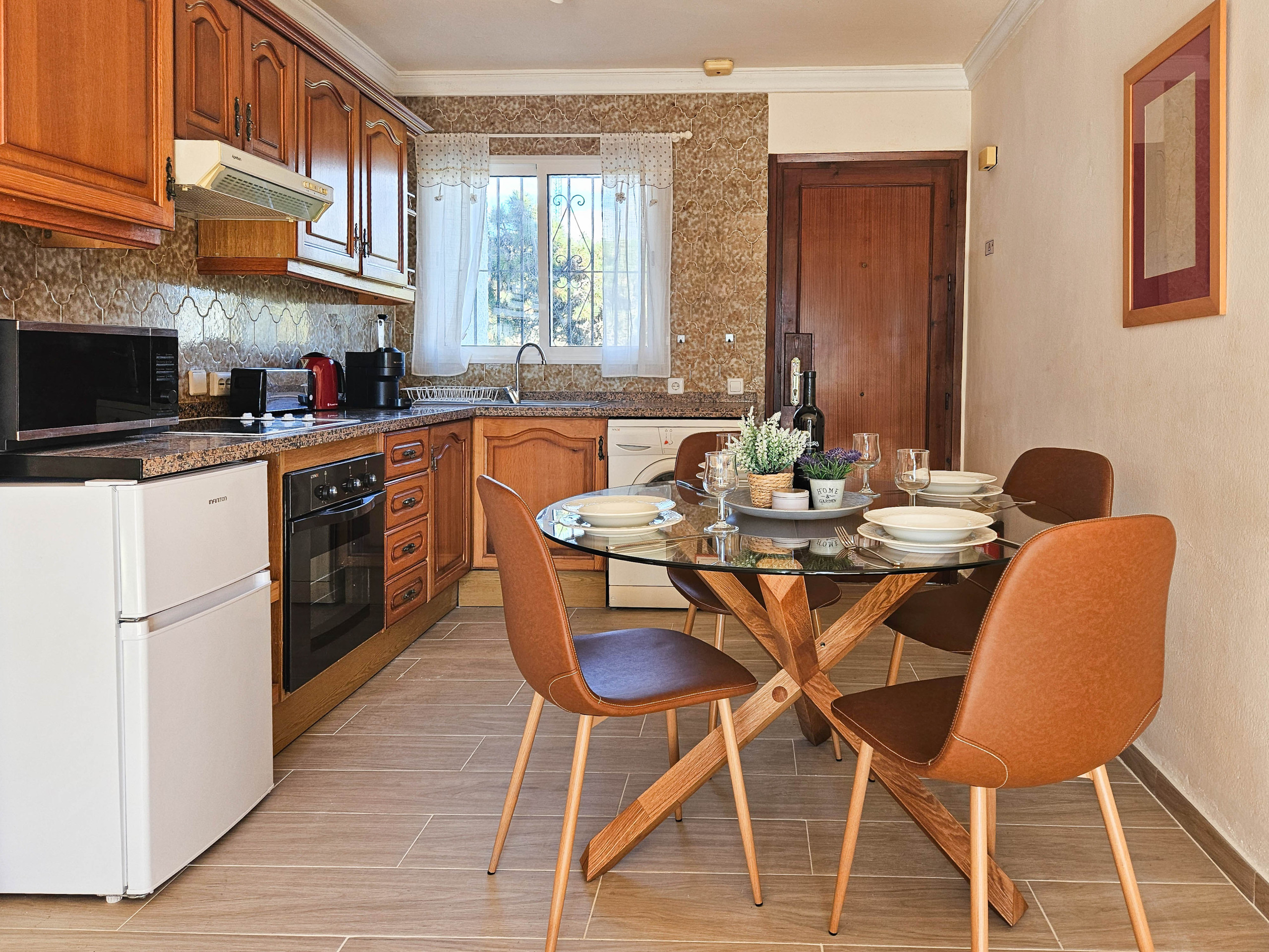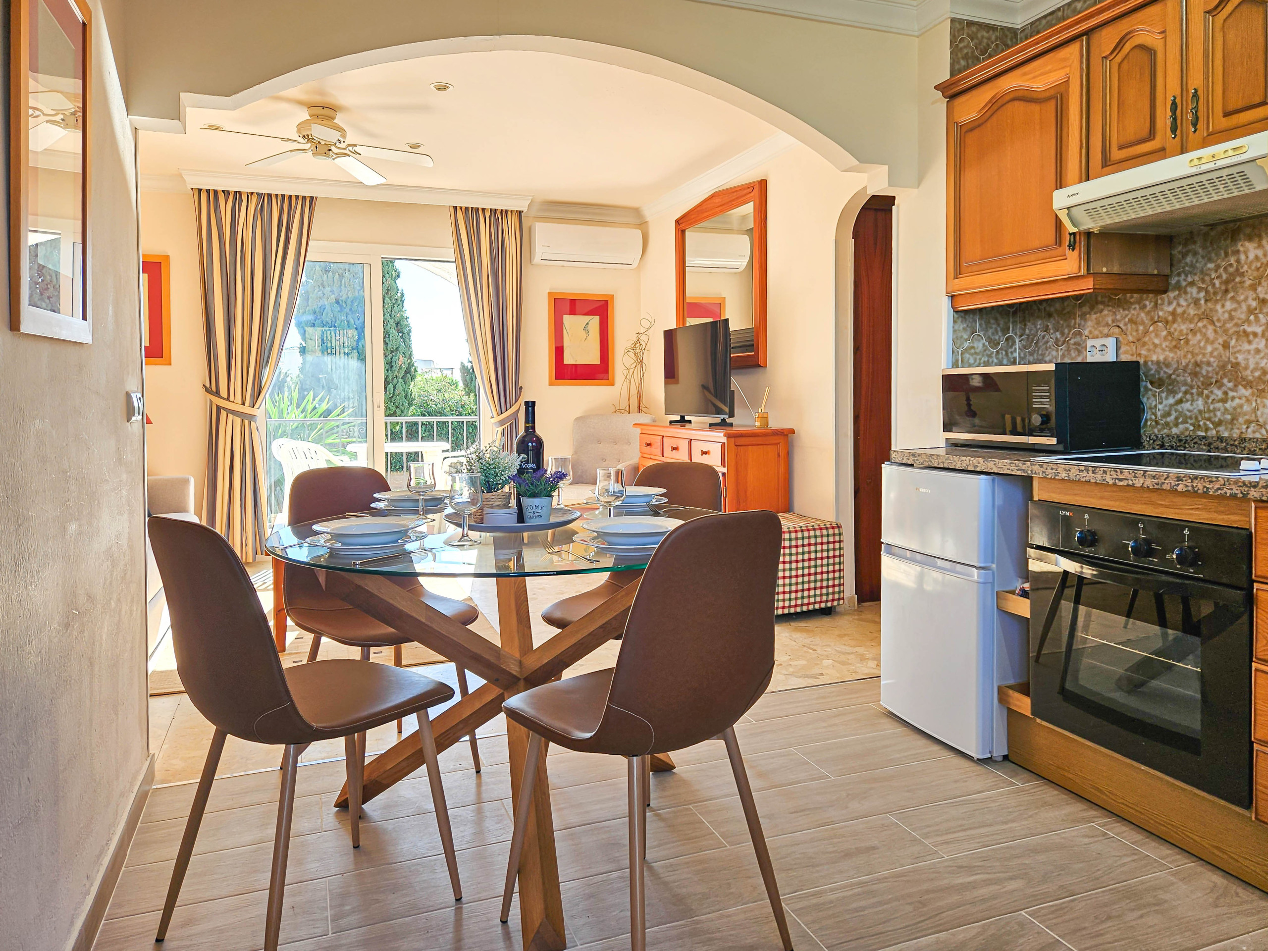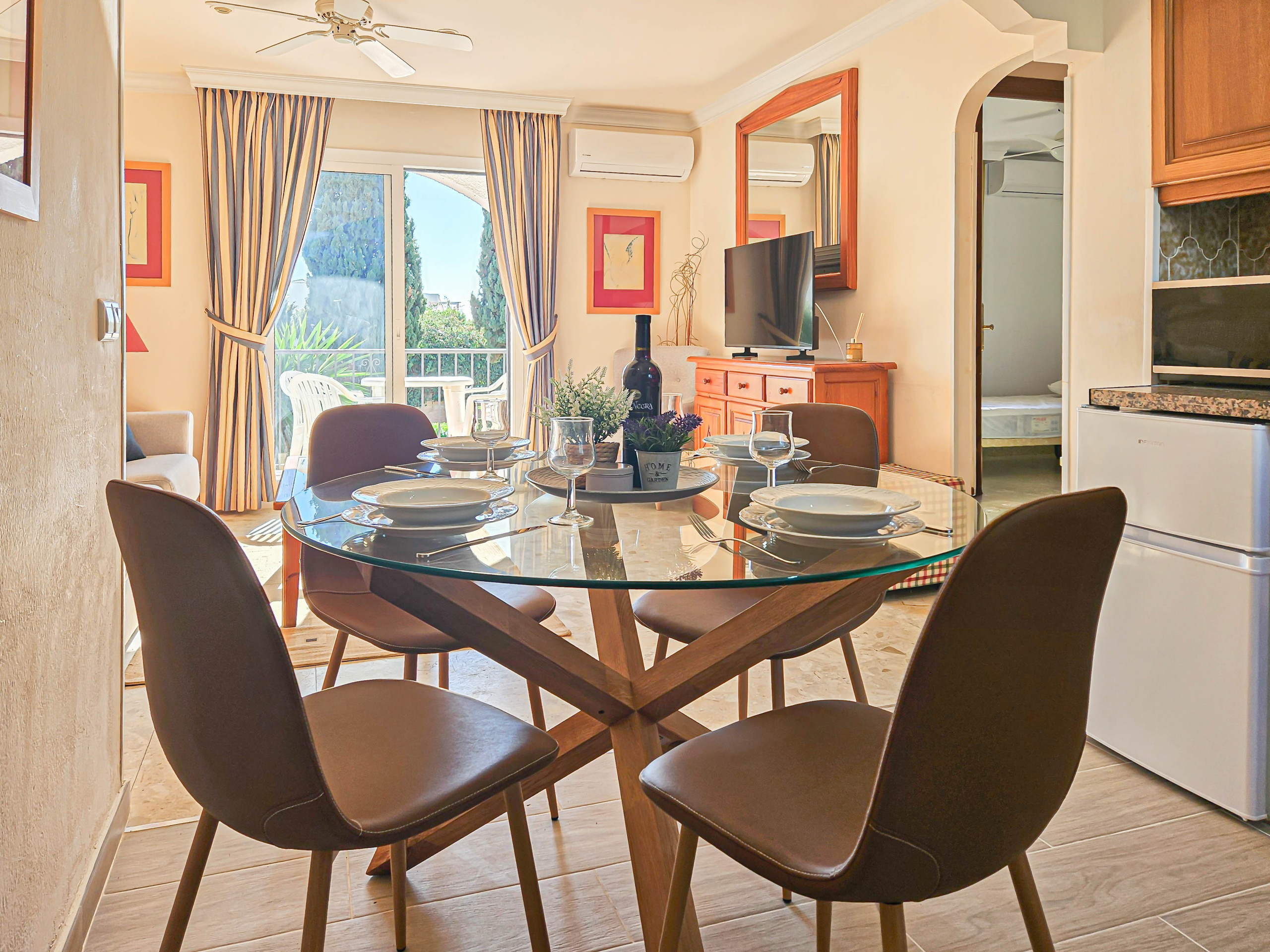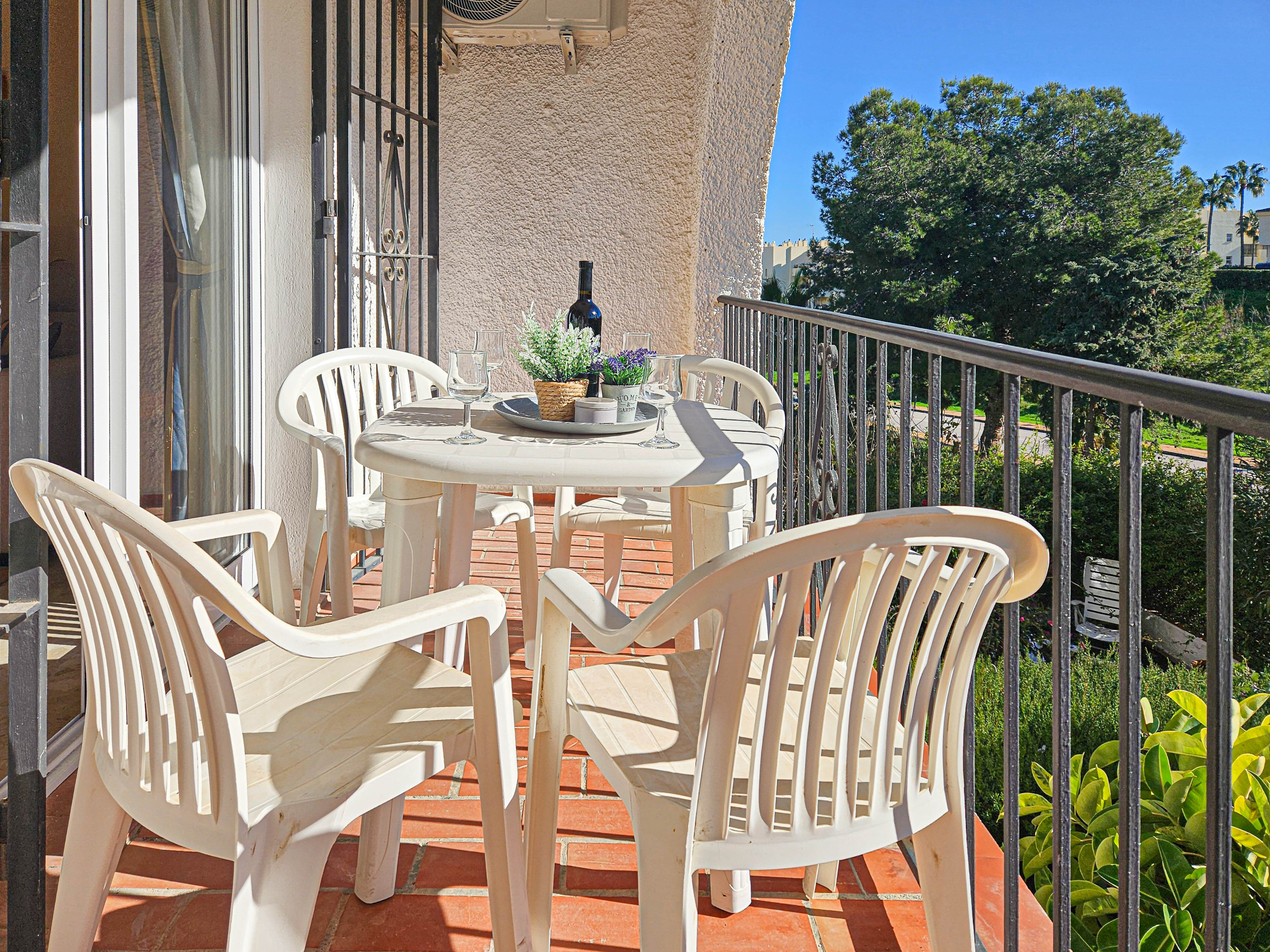 This south facing, first floor apartment is accessed via a flight of stairs and is arranged over one floor. The apartment consists of an open plan living area with a comfortable sofa, armchair and 43” smart TV. The lounge area leads out onto the small, south facing terrace which has beautiful garden views. The terrace is offers a dining seating area plus two chairs. The kitchen is equipped with a ceramic hob, oven, microwave, an under the counter fridge with an ice box, kettle, toaster, juicer, blender, capsule coffee machine and a washing machine. The dining area seats up to four people.