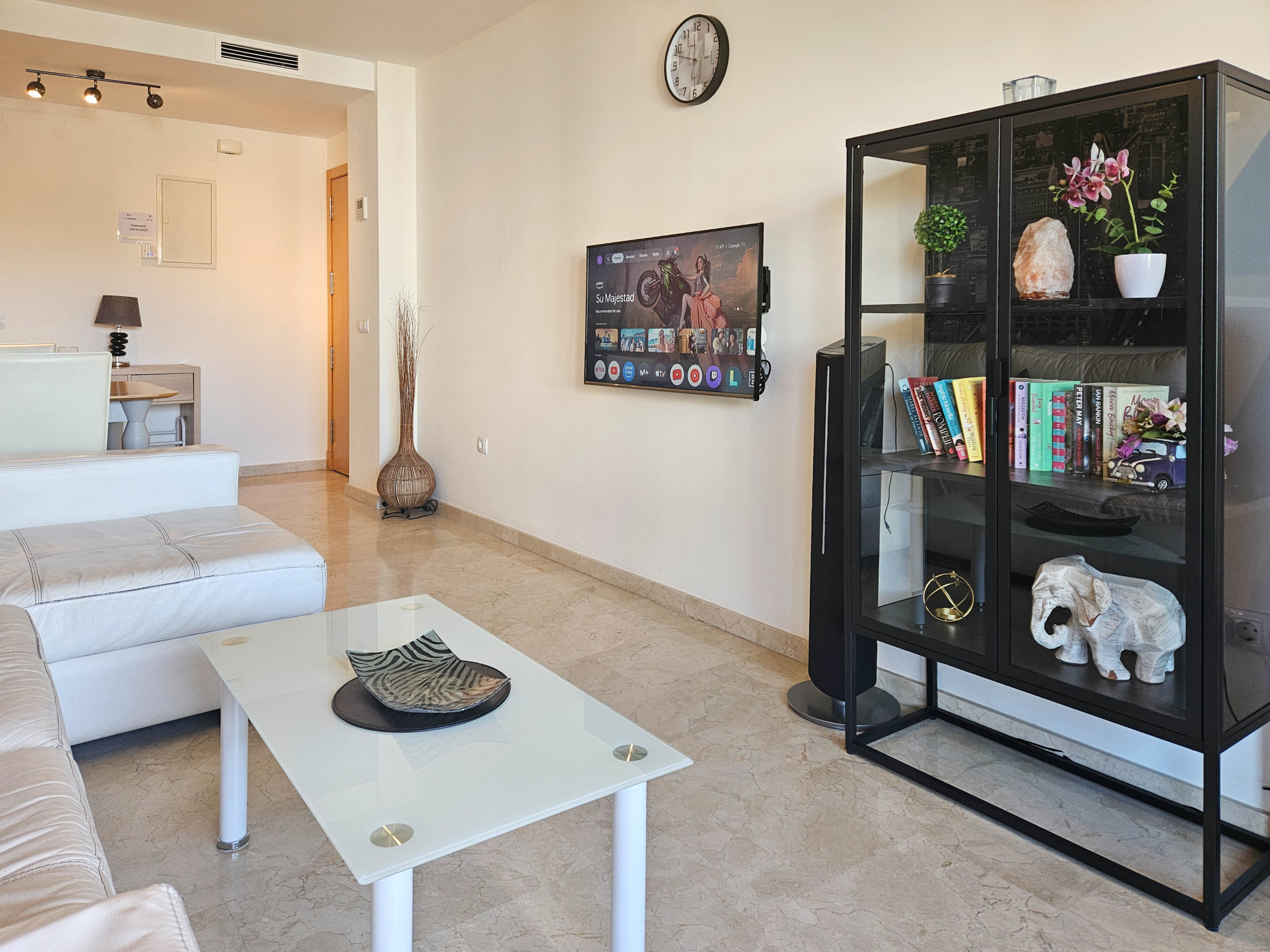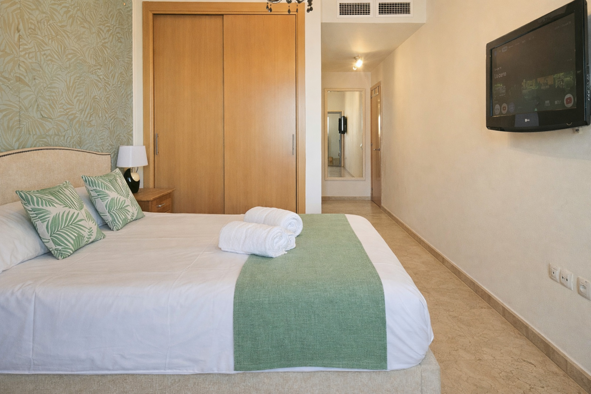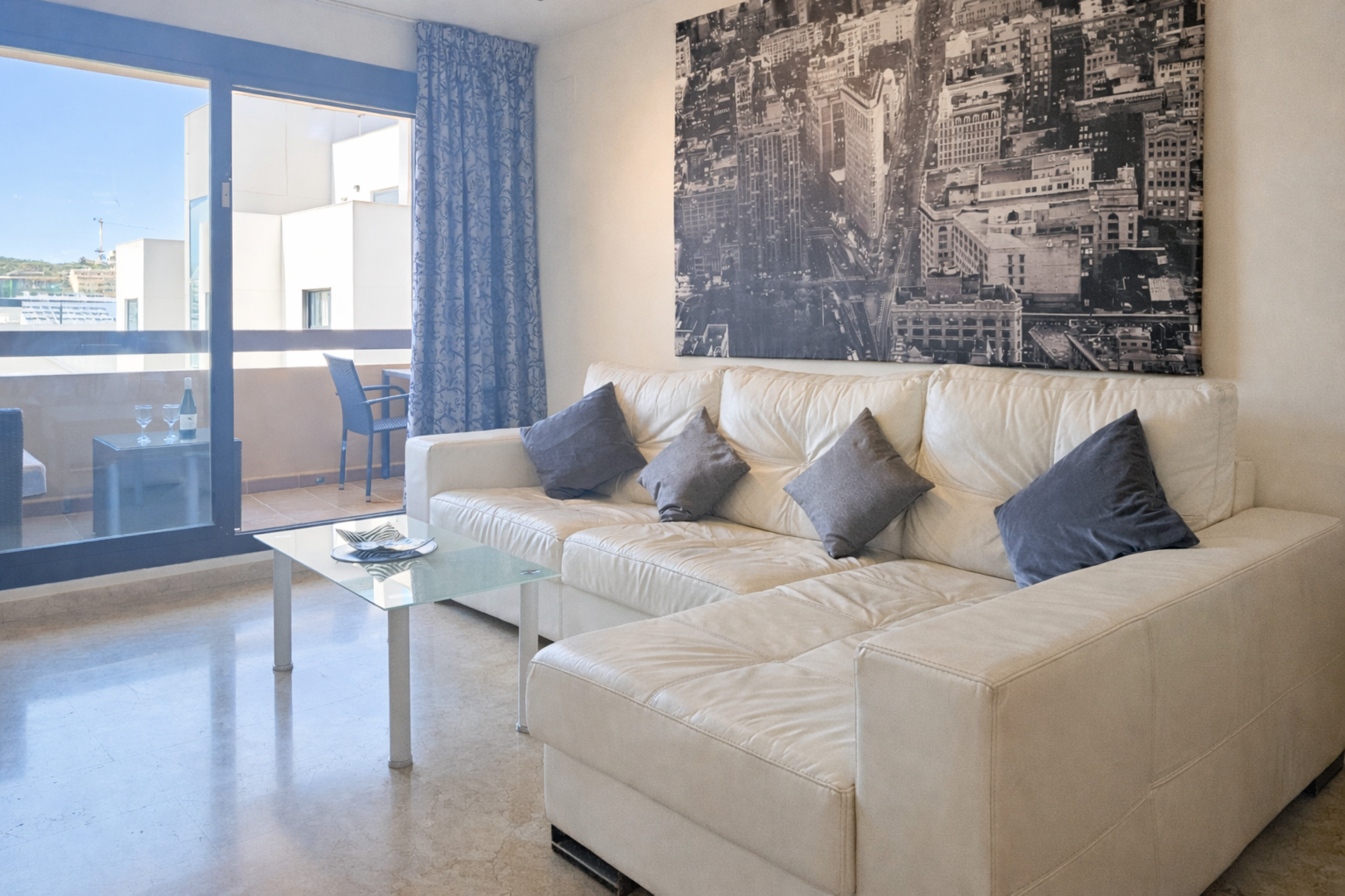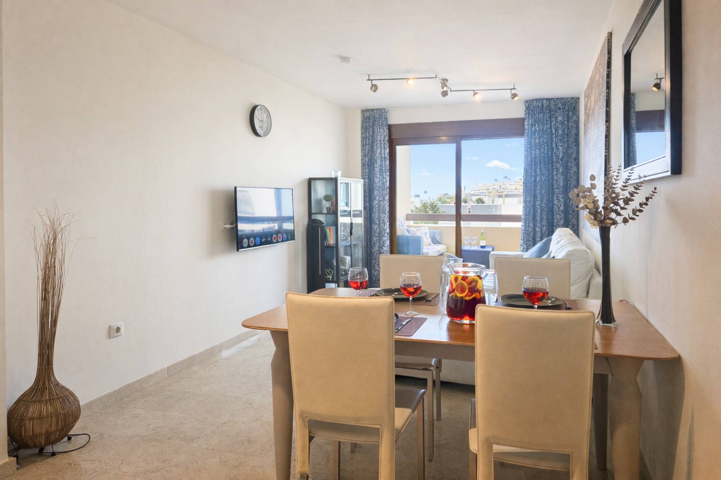 The apartment is located on the first floor and is arranged over one level. There is access to the apartment by lift. The open plan living space is furnished with a dining table and chairs and a lounge seating area with a large L shaped sofa and a 42¨TV, with use of Google TV. The lounge area leads out onto the terrace where a further lounge seating area can be enjoyed. The separate kitchen is fully equipped.