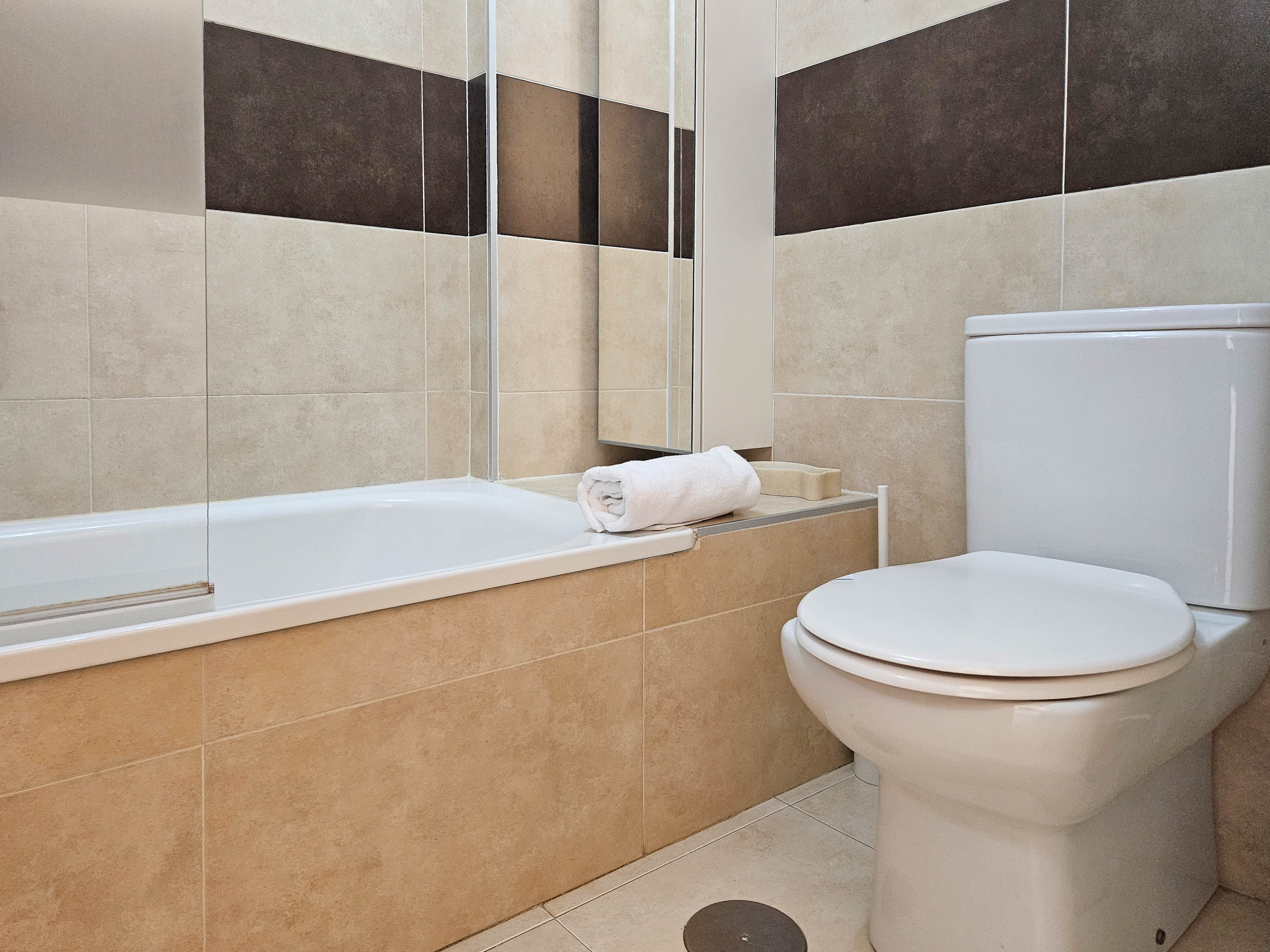 The two bedrooms are of equal size, with the master bedroom furnished with a king size bed and fitted wardrobes. The second bedroom benefits from two single beds and built in wardrobes. The shared bathroom is fully fitted with a shower over the bath and built in hair dryer.