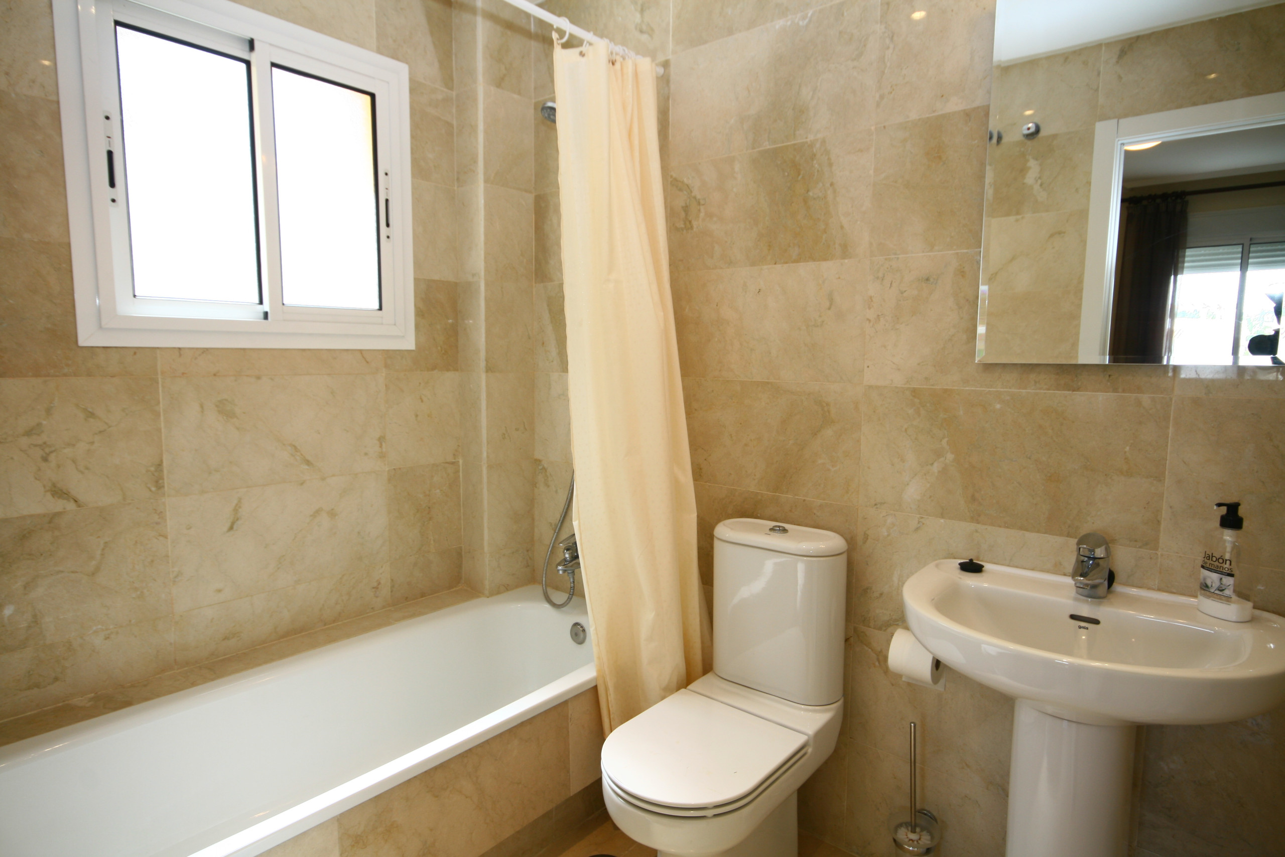 The master bedroom is fitted with a double bed and has a large fitted wardrobe with sliding doors. The guest bedroom is fitted with 2 single beds and also enjoys a fitted wardrobe with sliding doors. Both the bedrooms are fitted with hot and cold A/C and use the stylish and modern bathroom fitted with a large walk in shower.