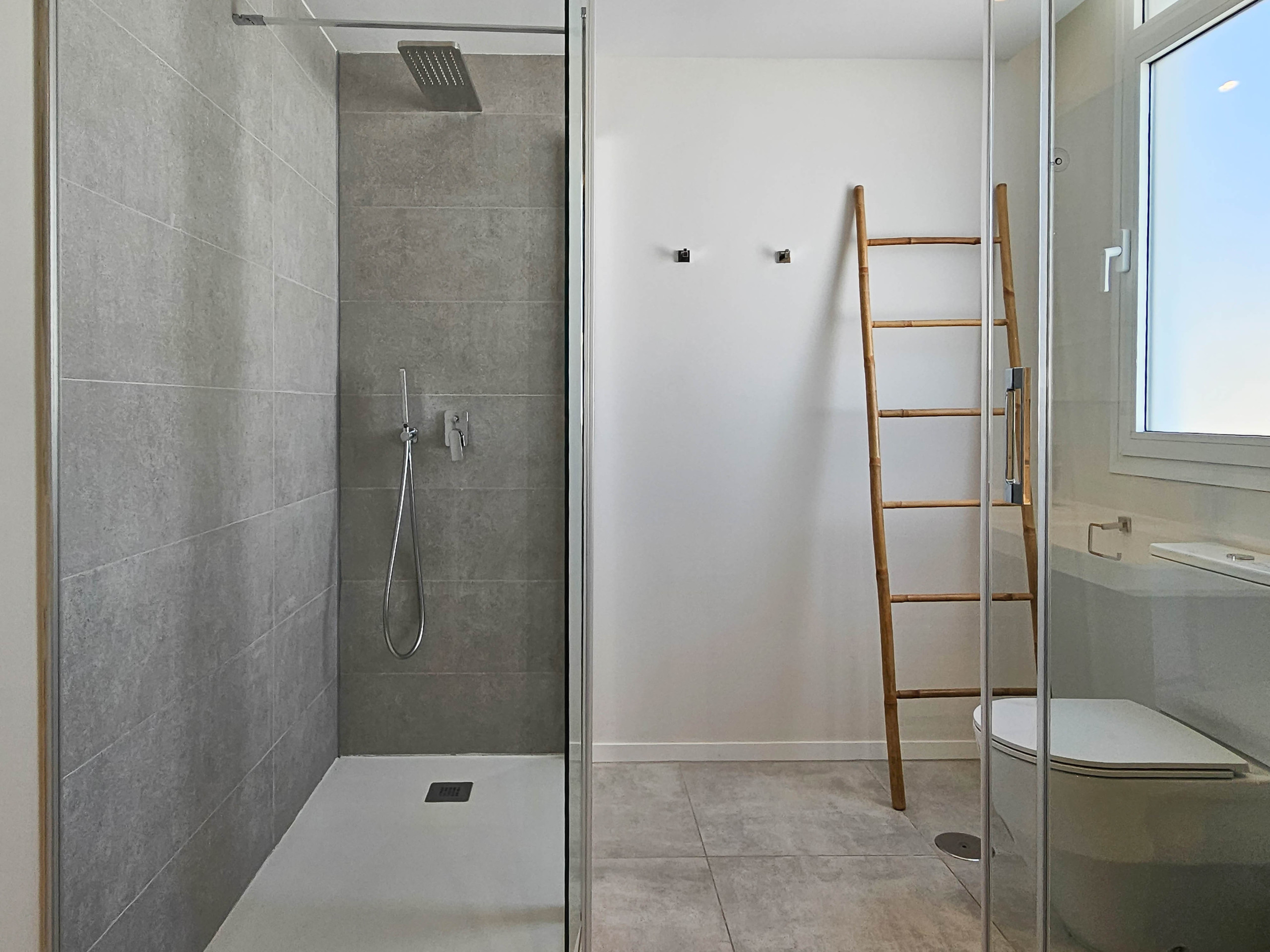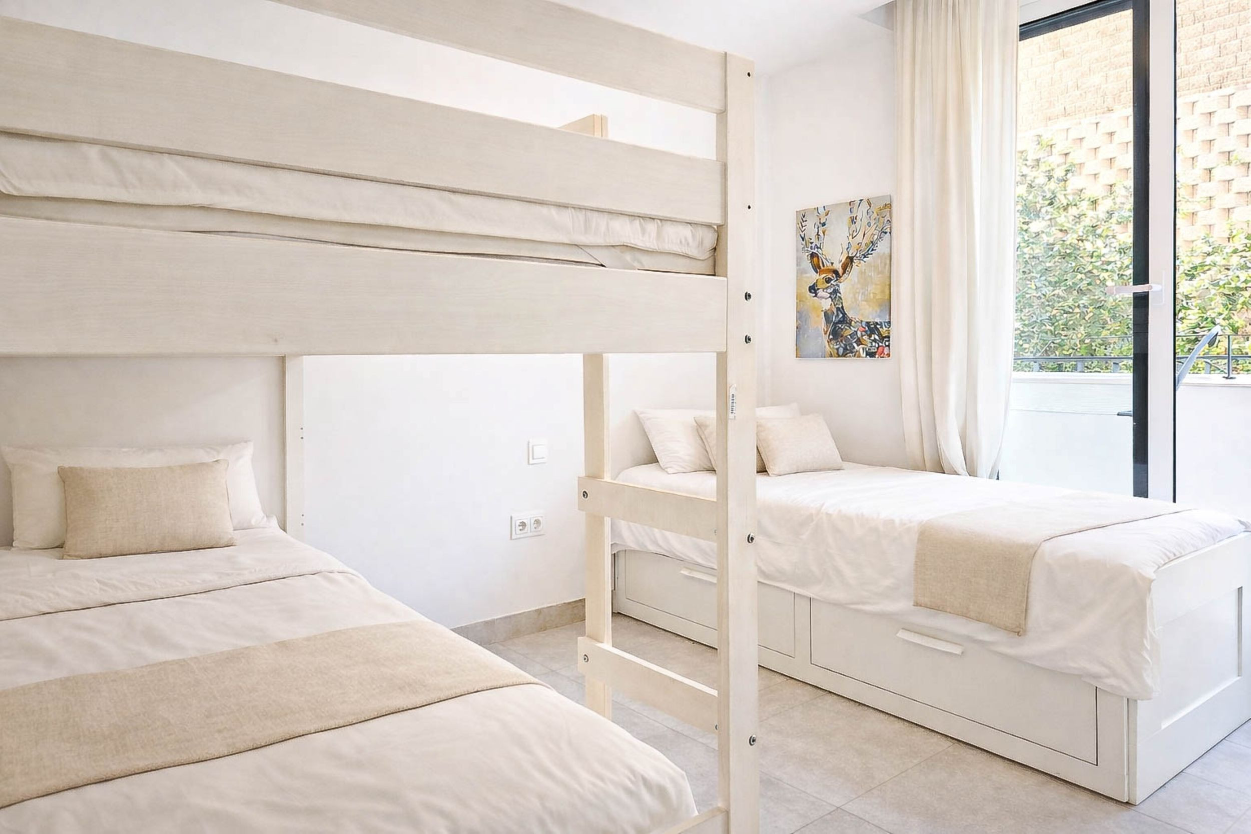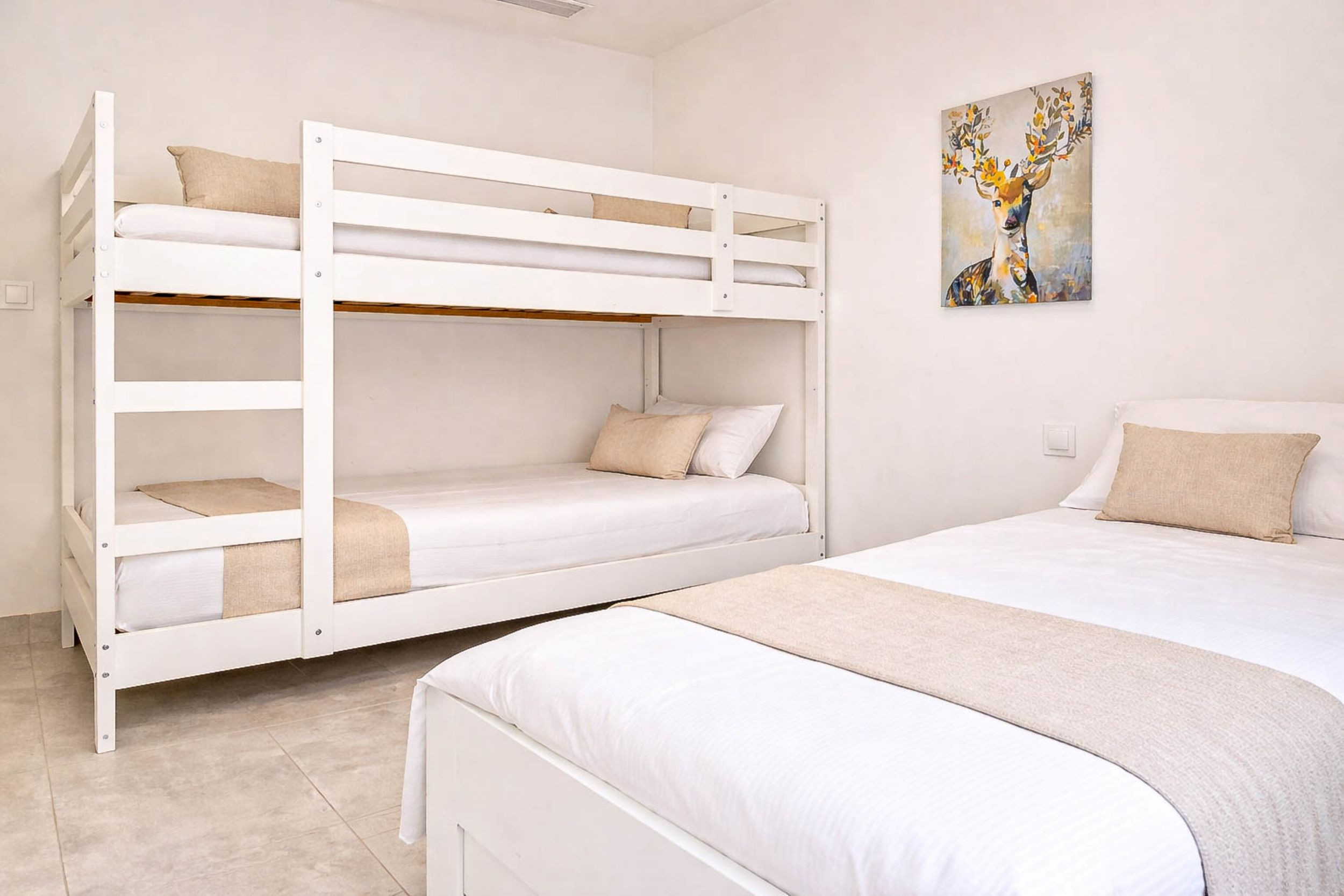 The master bedroom is furnished with a super king-size bed and includes an ensuite shower room and walk-in wardrobe. It also has direct access to the main terrace. The second bedroom also features a super king-size bed and built-in wardrobes. The third guest bedroom offers flexible sleeping arrangements with a bunk bed and an additional single bed. The guest bedrooms have access to a separate bedroom terrace as well as a shared guest shower room.