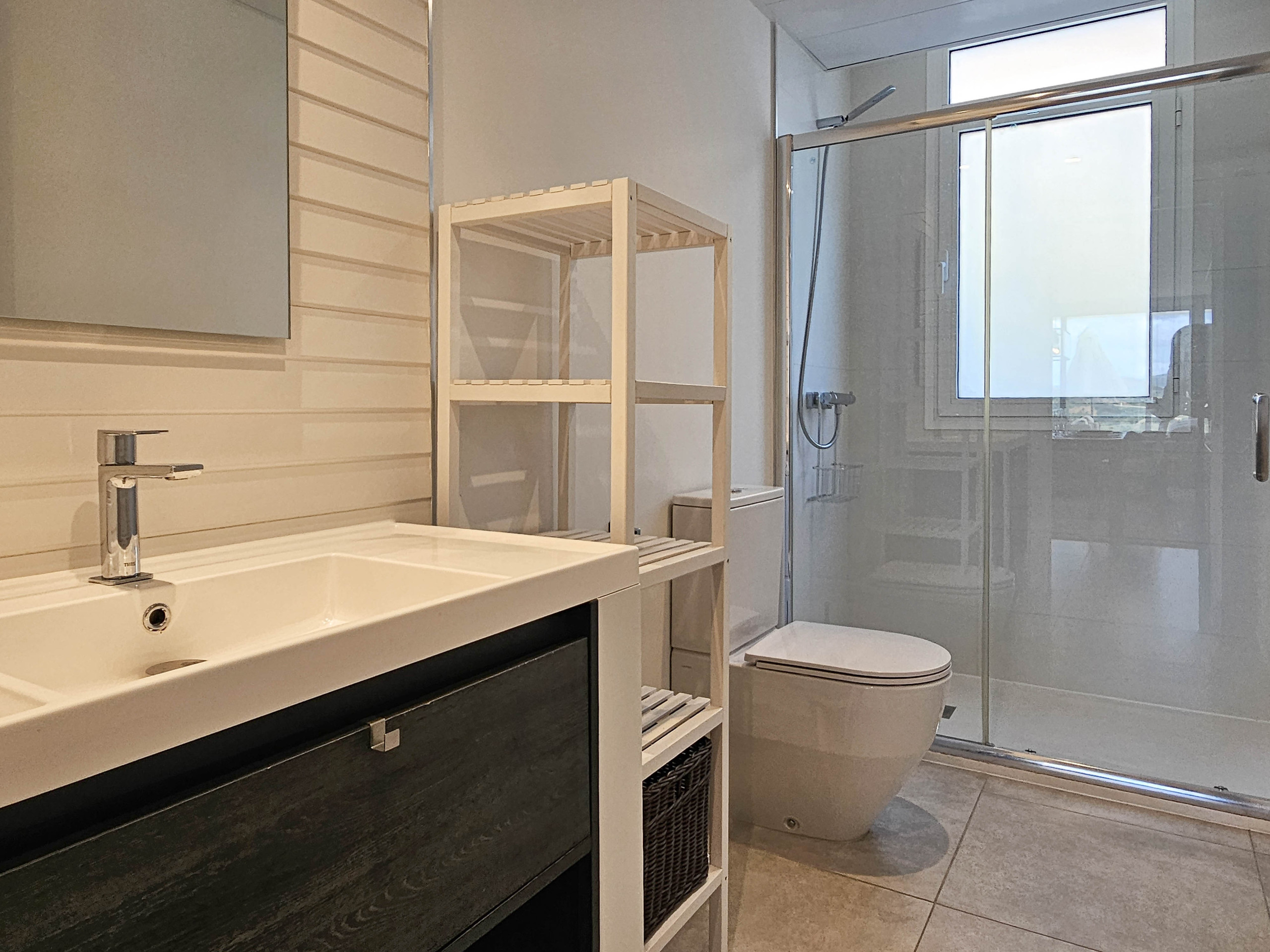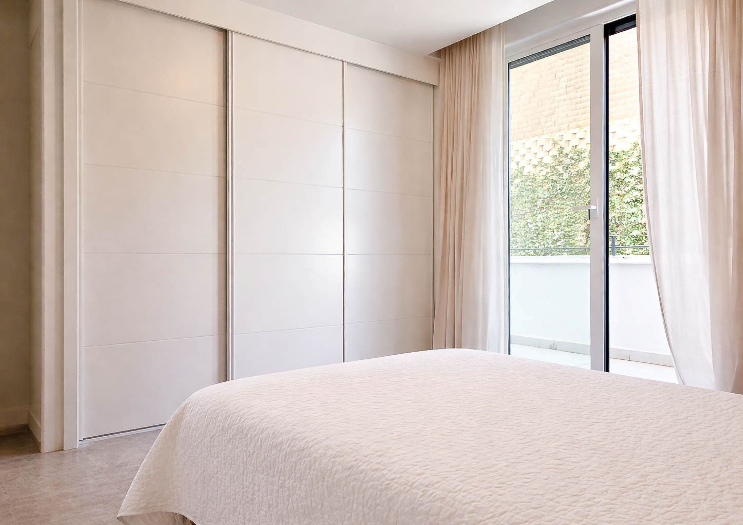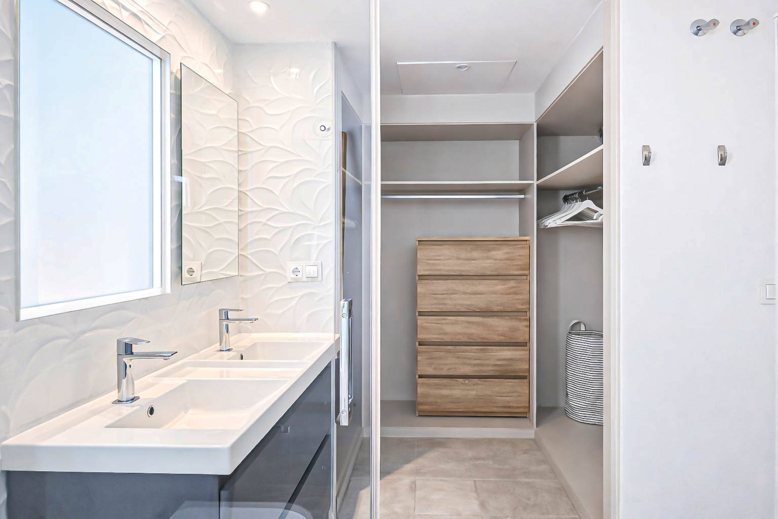 The master bedroom is furnished with a double bed and a large fitted wardrobe with sliding doors. The guest bedroom offers two single beds and also features fitted wardrobes with sliding doors. Both bedrooms are fitted with hot and cold air conditioning and share a stylish, modern bathroom with a large walk-in shower.