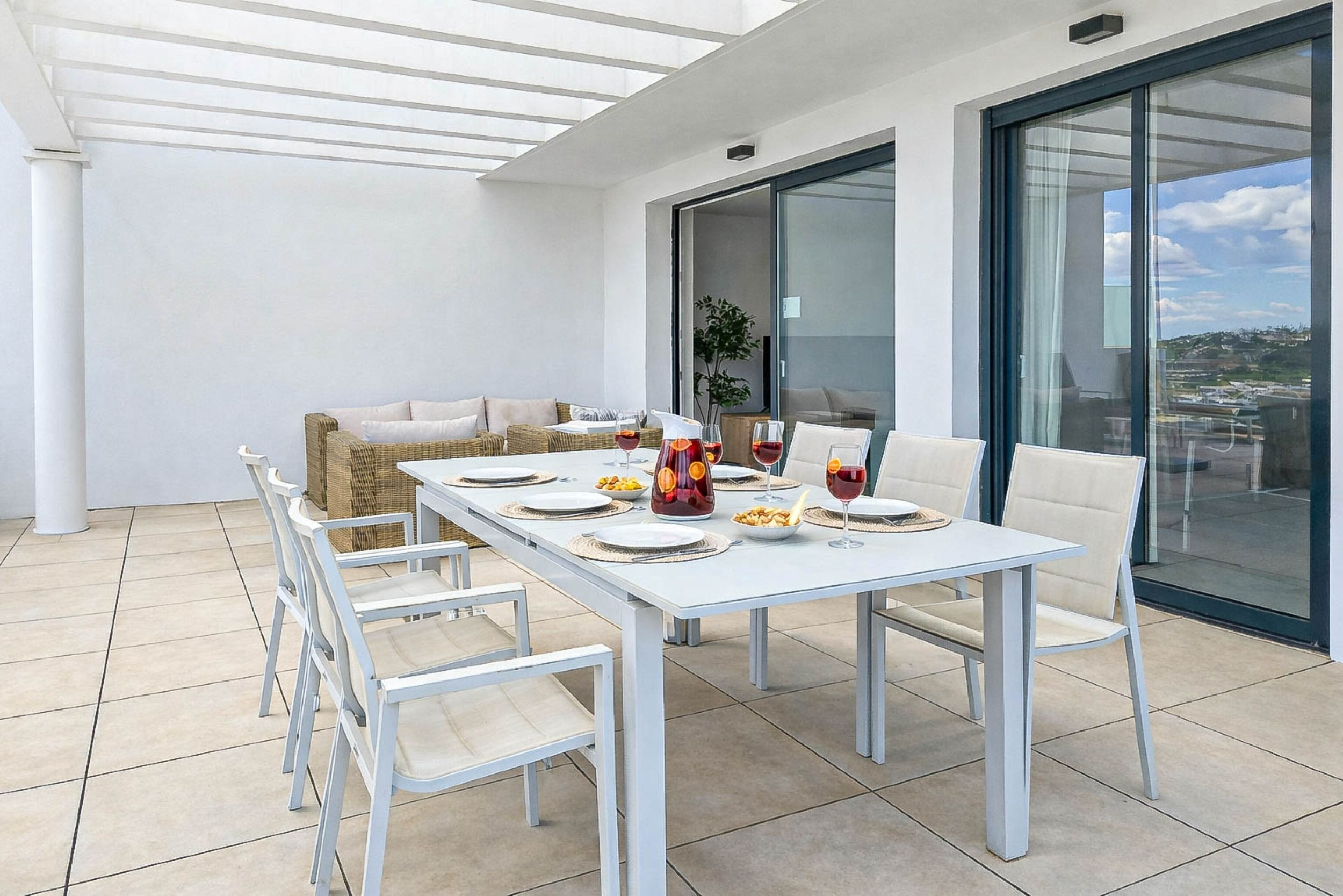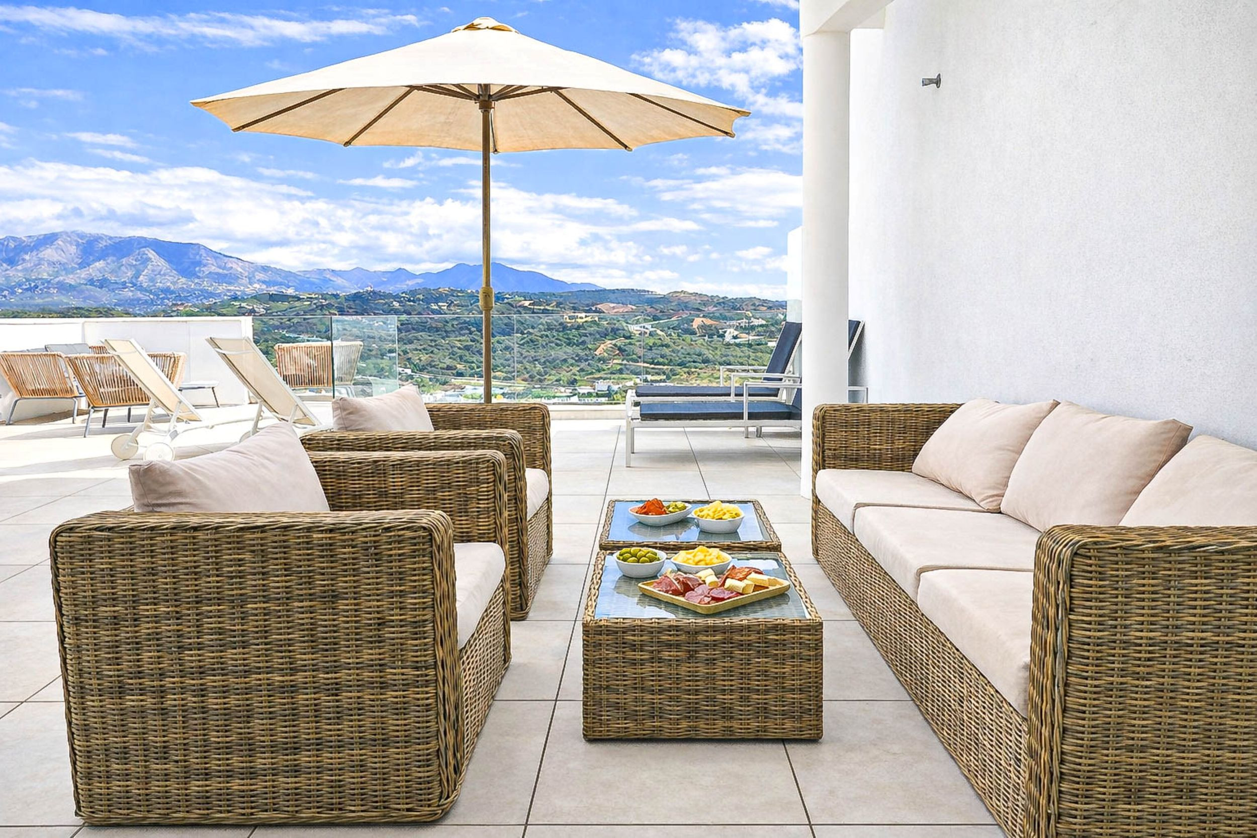 The open-plan living area features a well-equipped kitchen, a spacious lounge with an L-shaped sofa and a 56-inch smart TV, and a dining area that seats up to six people. From the living room you can access a large terrace, where you can enjoy beautiful mountain views and partial sea views. The terrace is furnished with a dining area, two comfortable lounge seating areas, sun loungers, and a parasol, making it ideal for relaxing or dining outdoors.