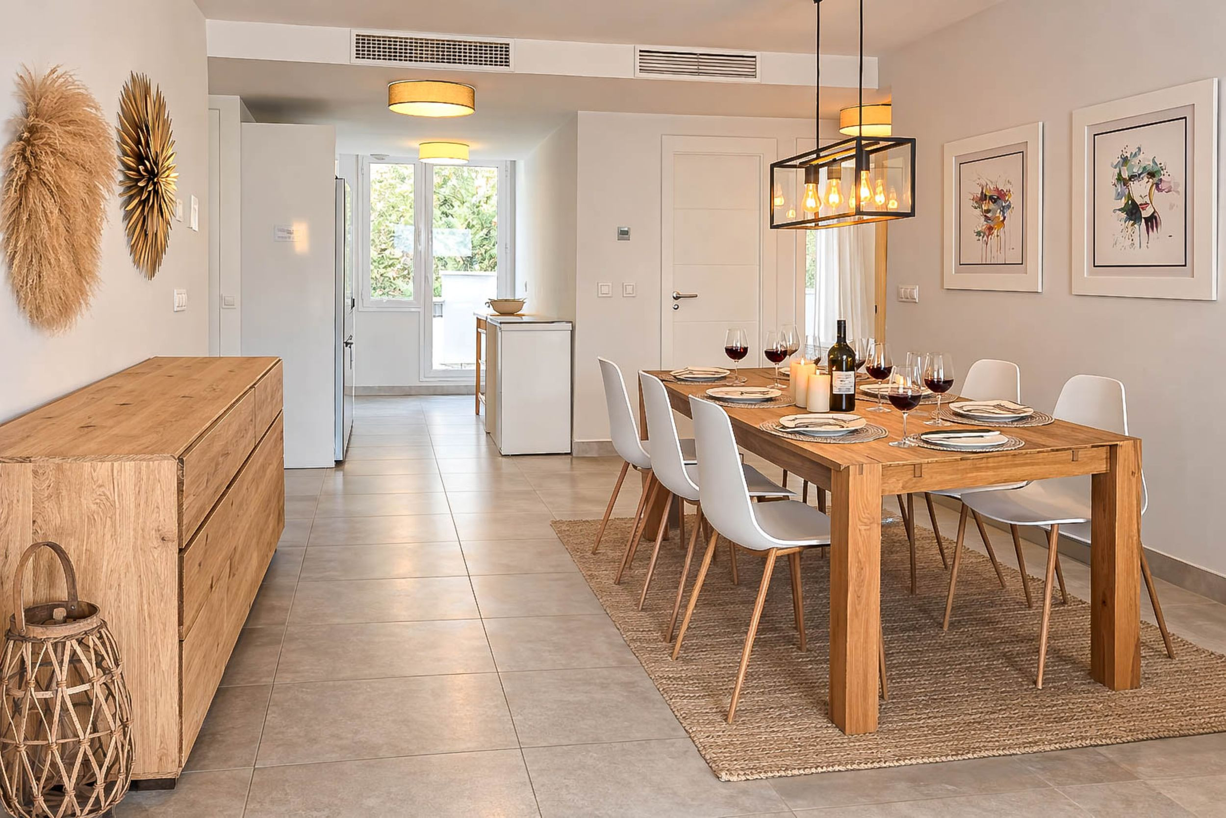 The sun room is light and airy, furnished with two comfortable sofas and a coffee table, and enjoys peaceful views over the communal garden—an ideal spot to relax at any time of day. The lounge/dining area is furnished with a dining table and chairs and benefits from hot and cold air conditioning, a large TV, and free WiFi, ensuring comfort year-round.