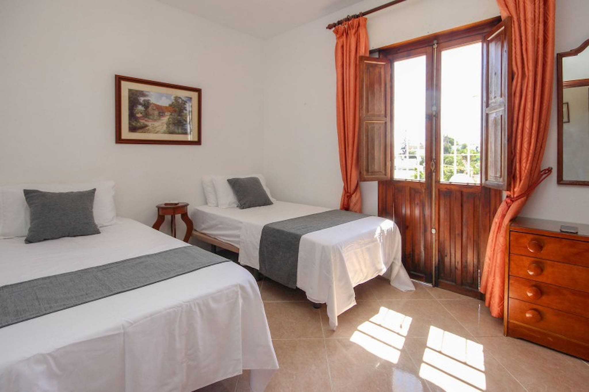The bedroom is furnished with a king size bed and fitted wardrobes. There is an ensuite bathroom, fitted with a bath with a shower attachment and a bidet. The bedroom has direct access to the terrace.