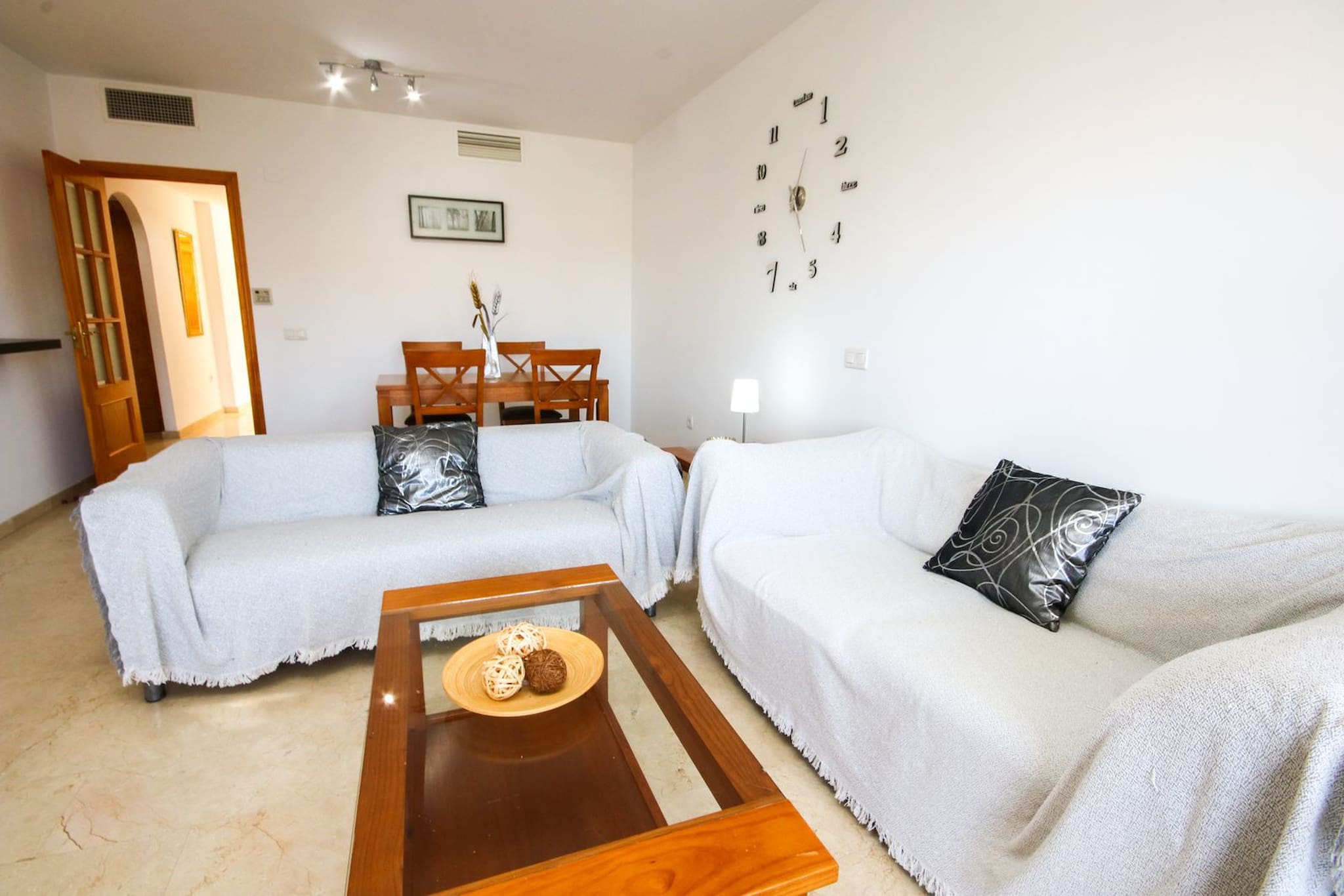 This charming two bedroom apartment is located in the Colinas del Mar complex in Riviera del Sol. Set back in the hills of Riviera, the apartment enjoys uninterrupted sea views. The secure gated complex offers two communal pools, one with a separate children's pool and a tennis court. There is also an open carpark. The beach and a selection of restaurants, bars and shops are all within a 1km distance. Miraflores Golf Club is under 2km away. The apartment offers hot & cold vented aircon throughout and free WIFI.