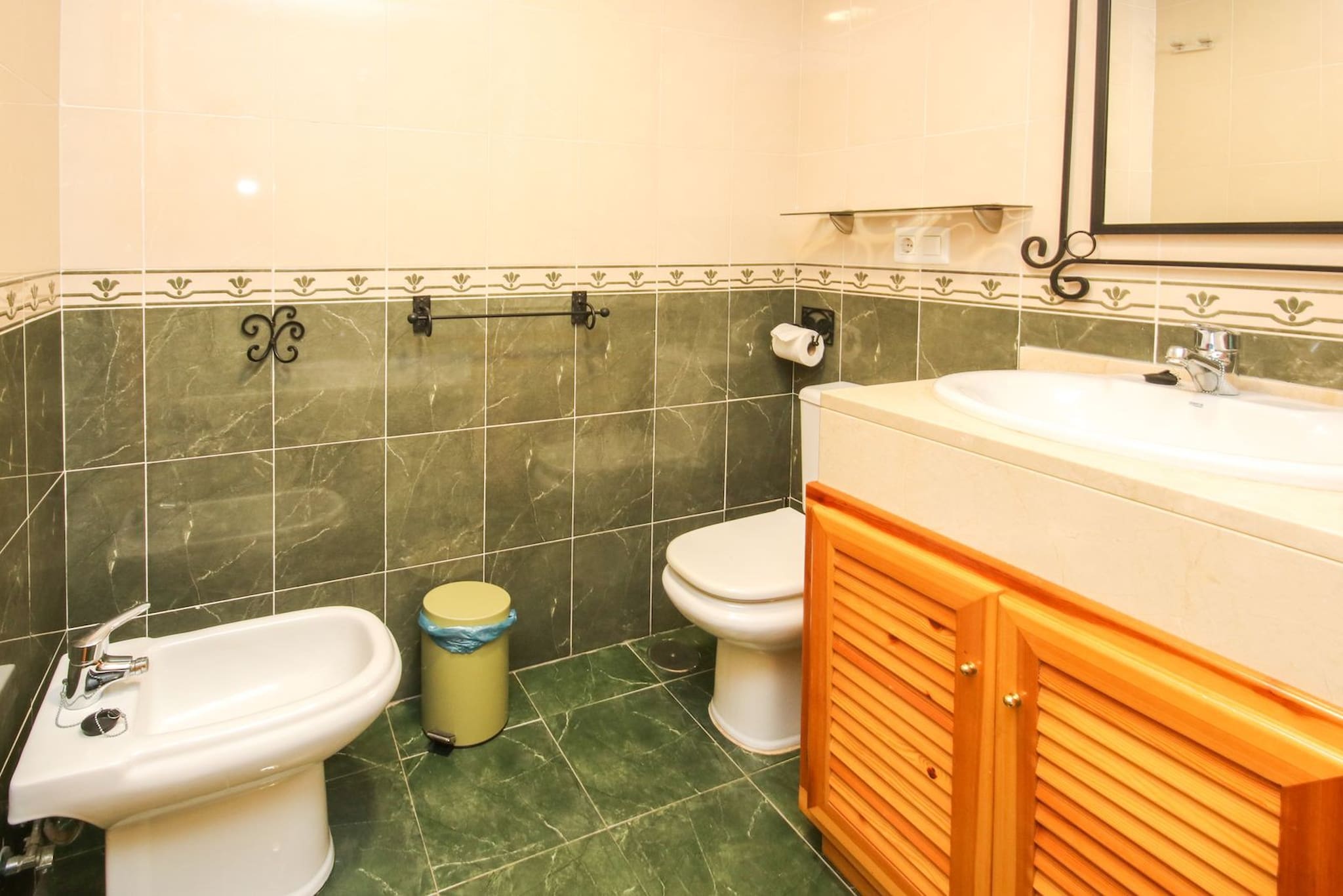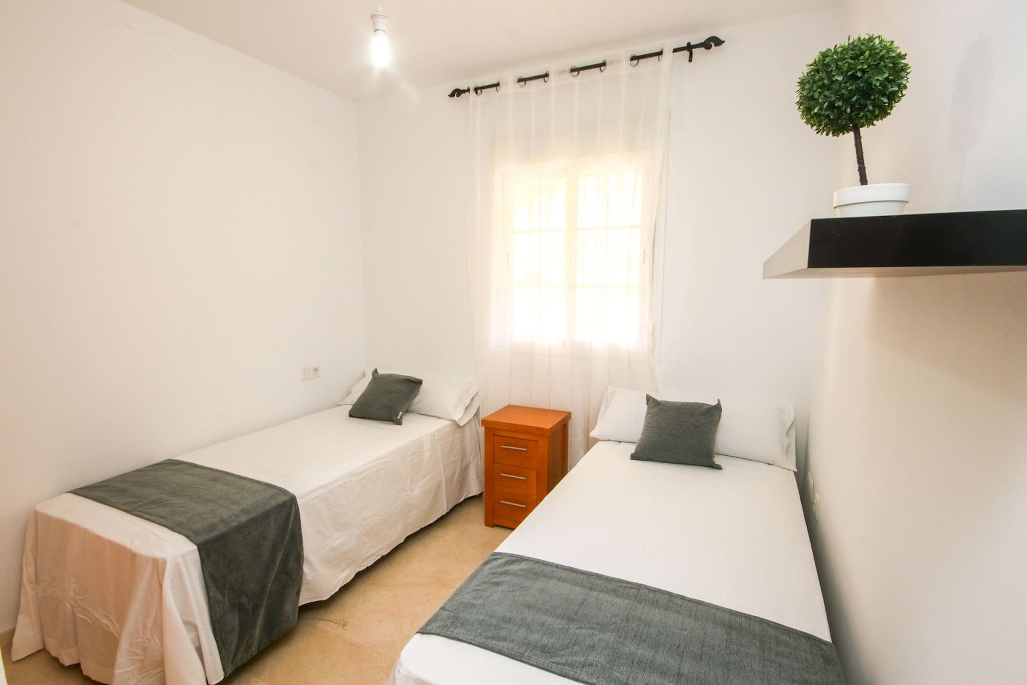The master bedroom has a king size bed, fitted wardrobes and en suite bathroom with a shower fitting over the bath. This bedroom also has access to the terrace. The guest bedroom has 2 singles beds, fitted wardrobes and access to the guest shower room.