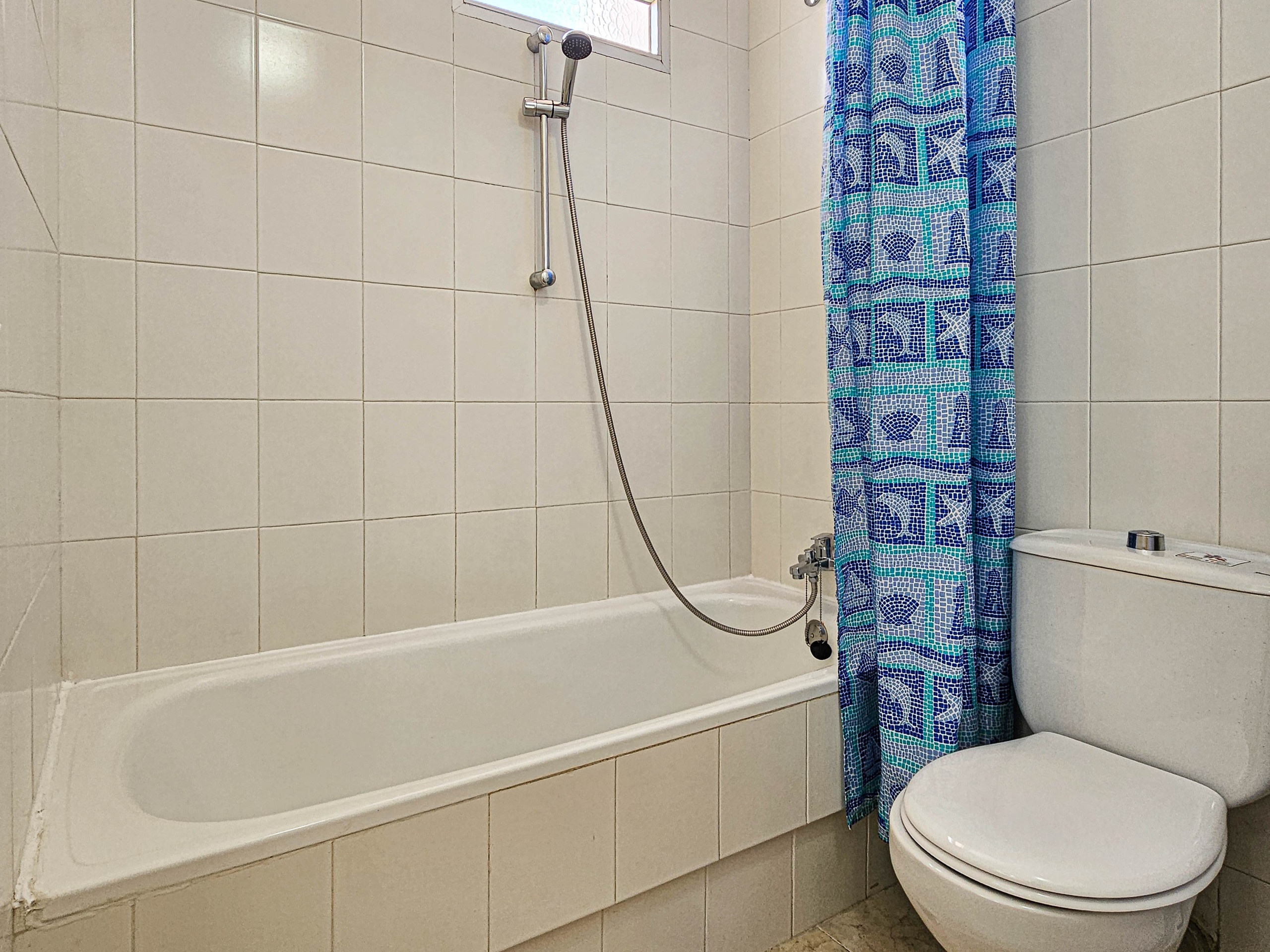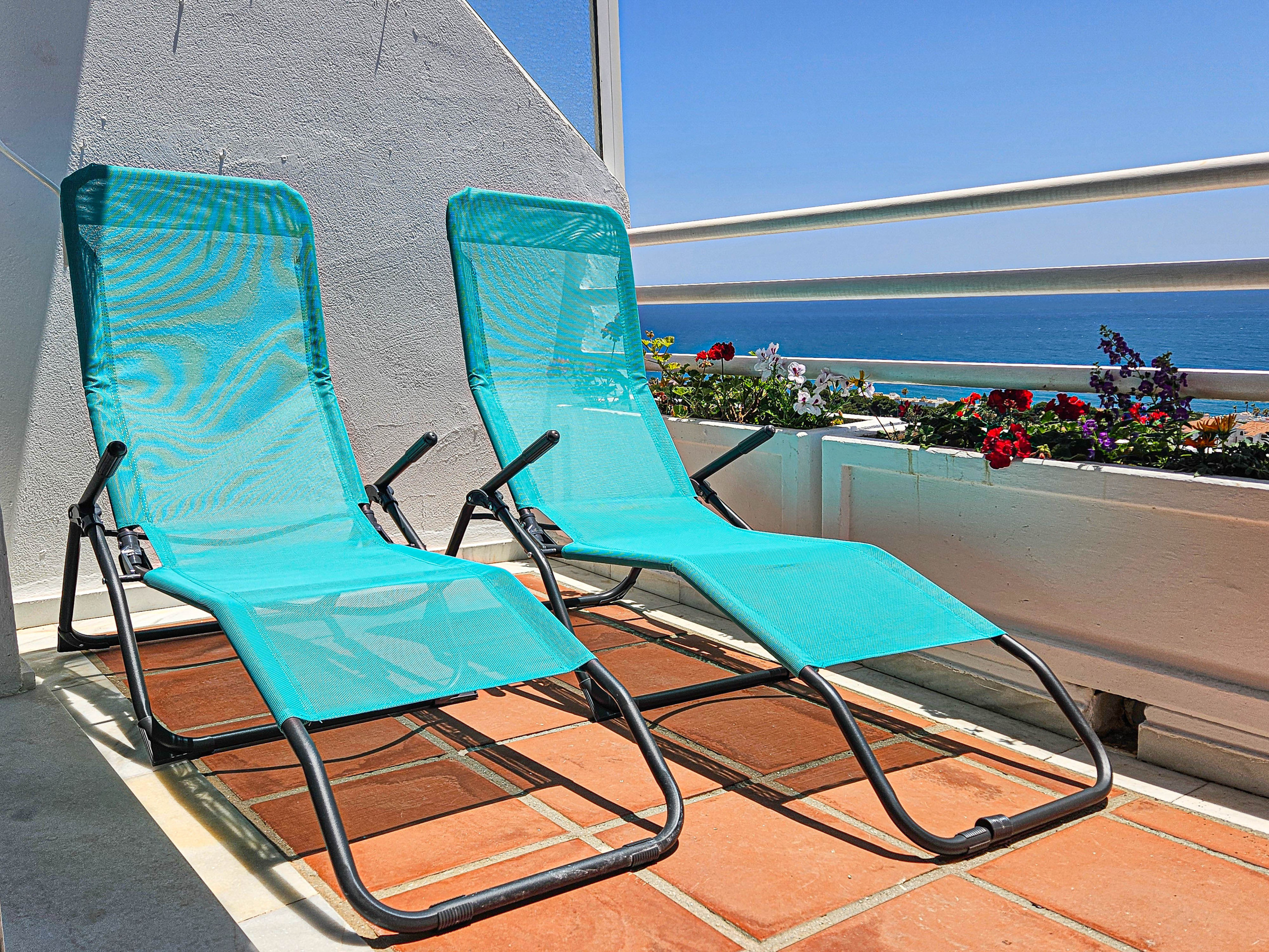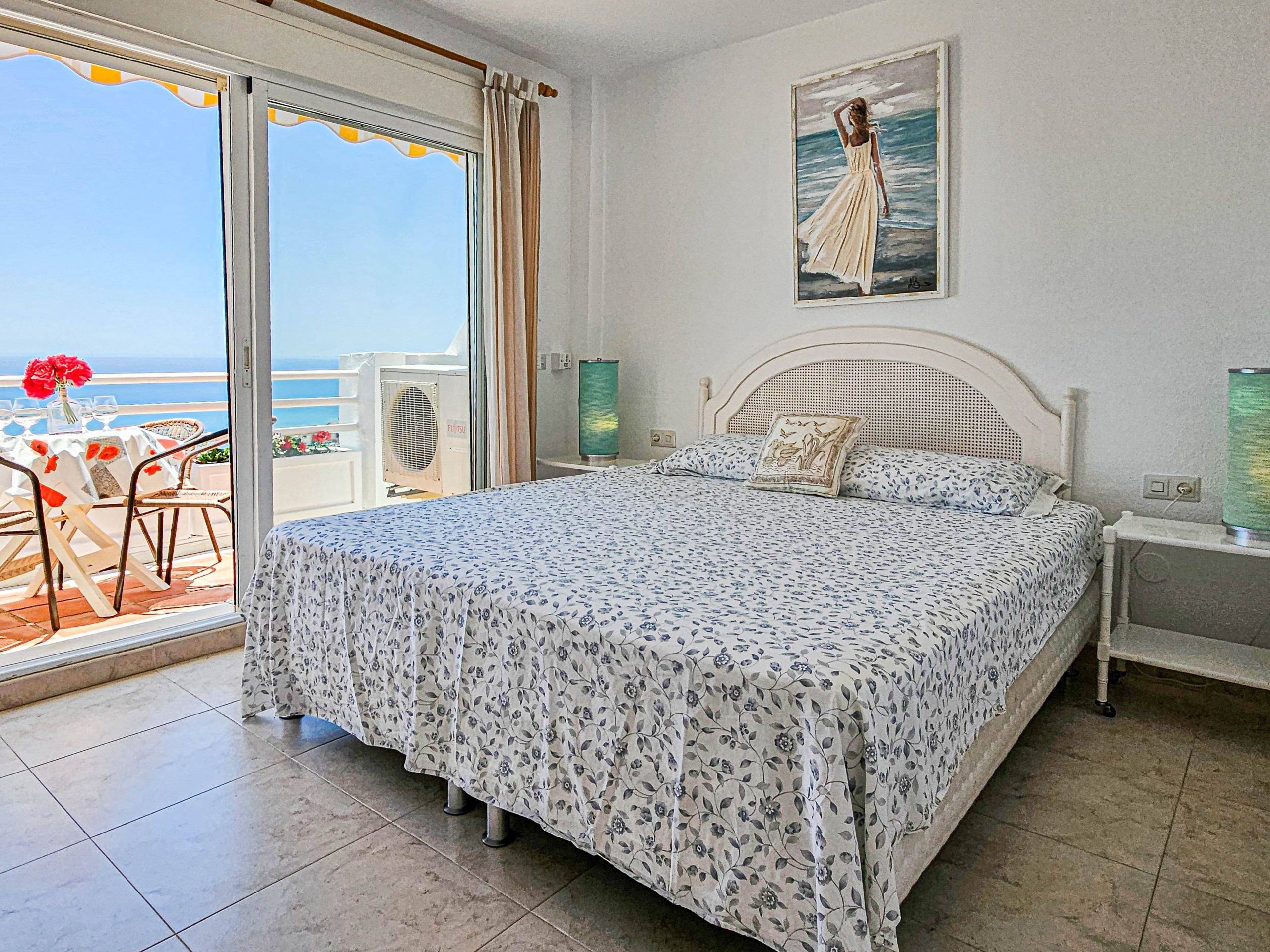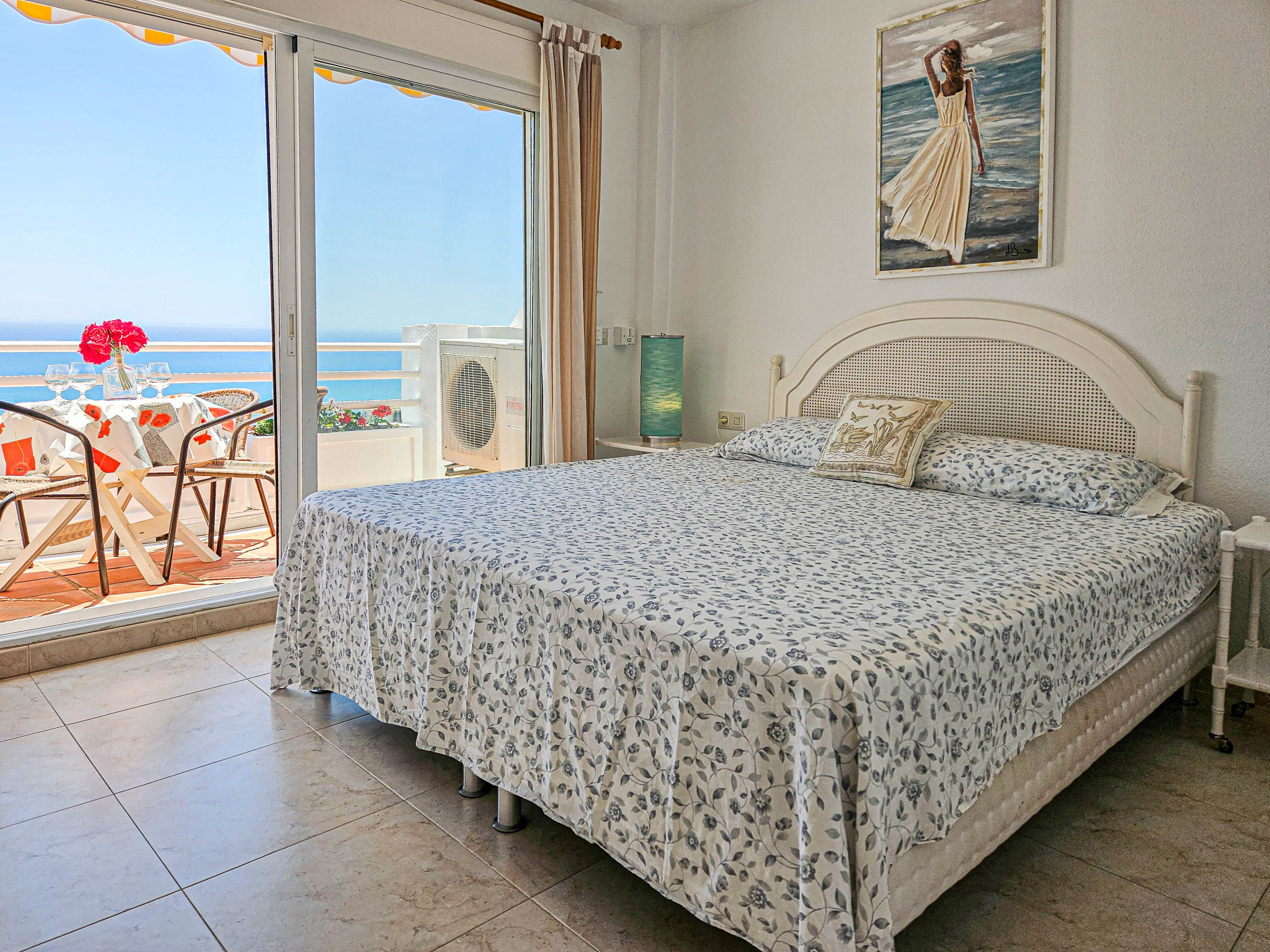 Take the stairs up to the bedrooms, bathroom and terrace. The master bedroom is furnished with a super king size bed and fitted wardrobes. Access the private terrace and enjoy the dining seating area, or reclining sun lounger chairs while you take in the stunning sea views. The guest bedroom offers twin beds and a large wardrobe. The apartment benefits from a family bathroom, where you will also find the washing machine. The bathroom is fitted with a bath with a shower attachment.