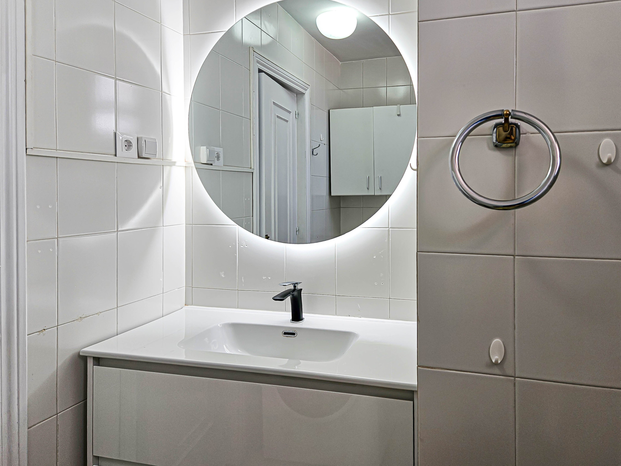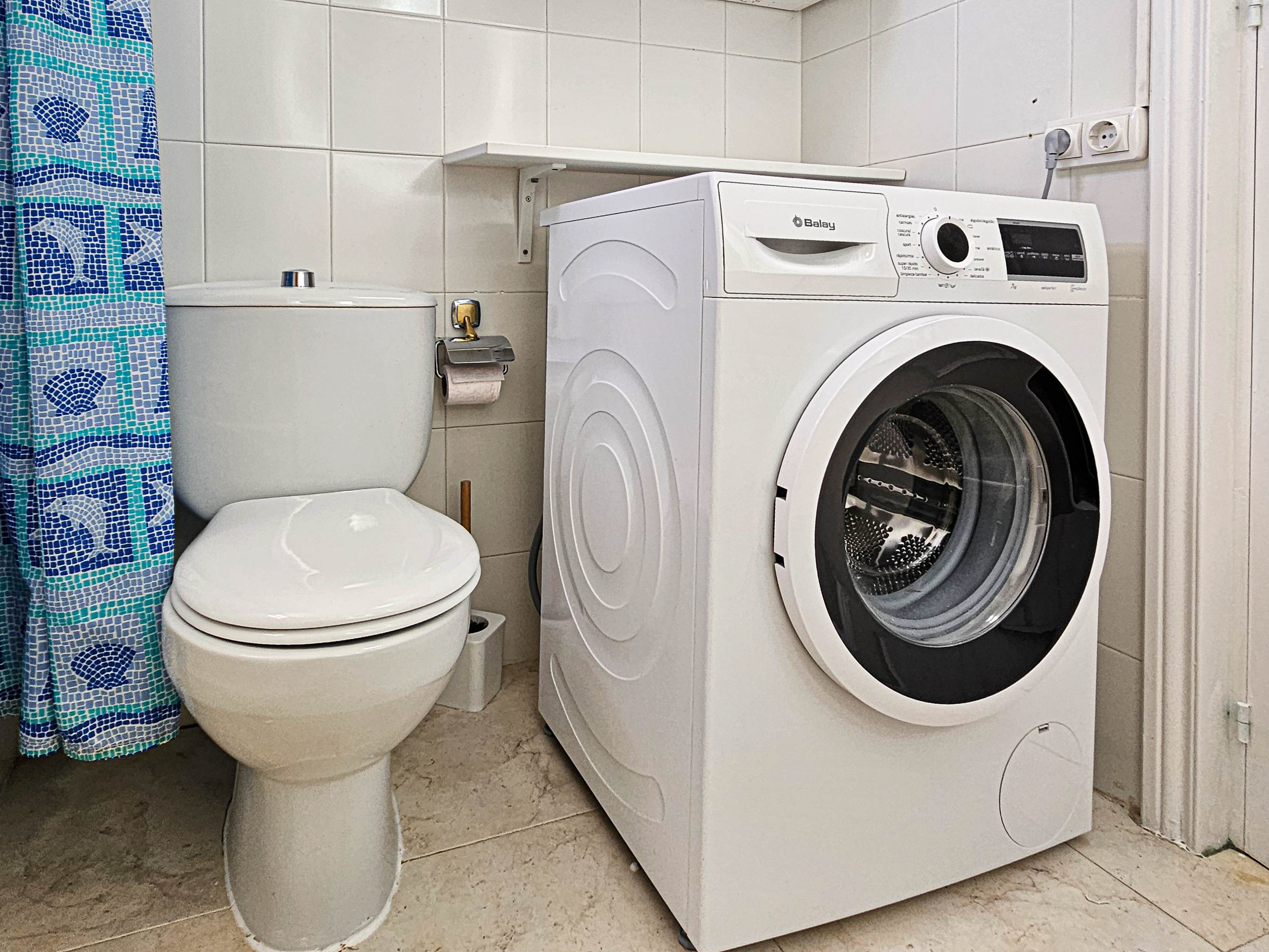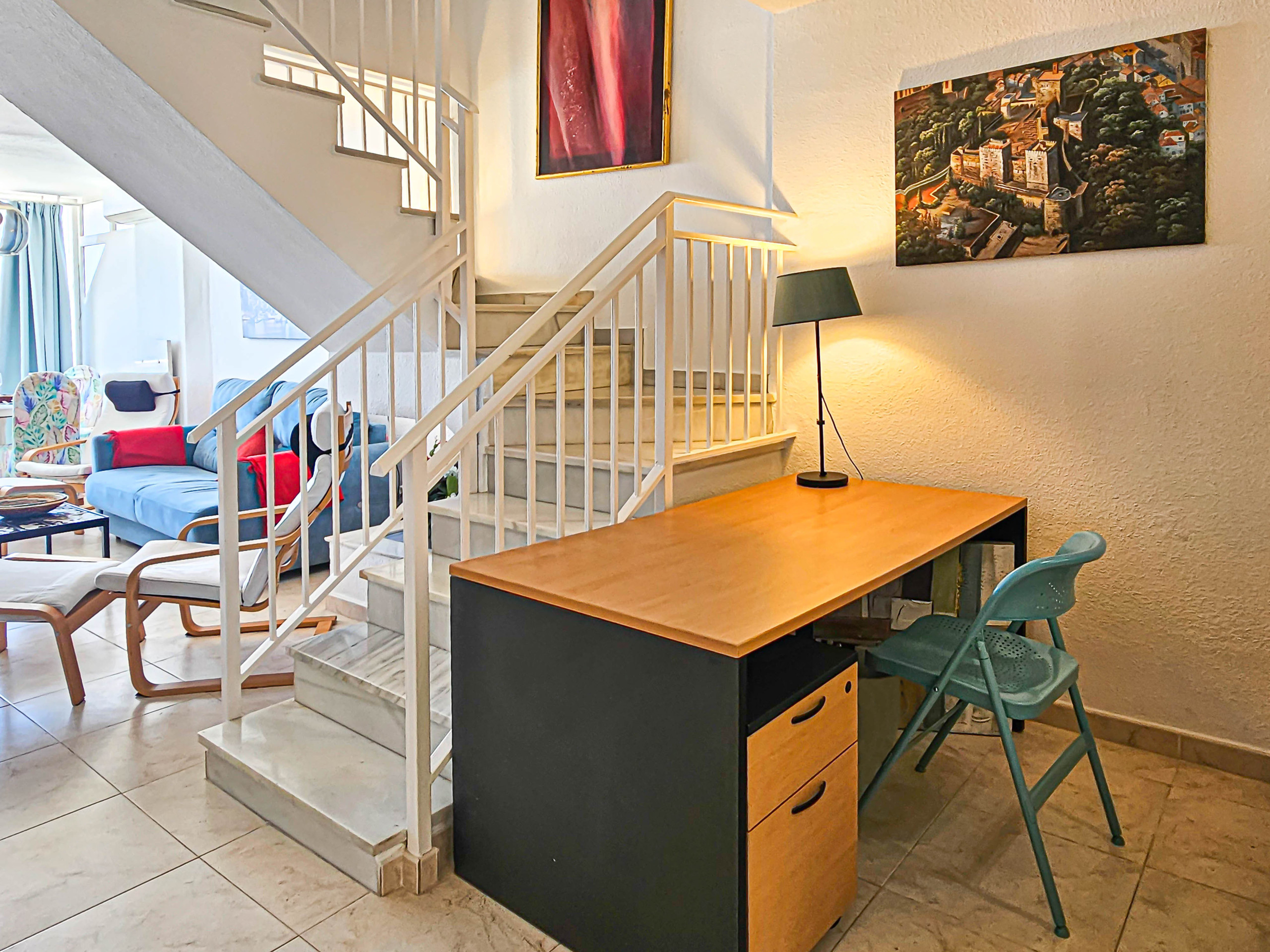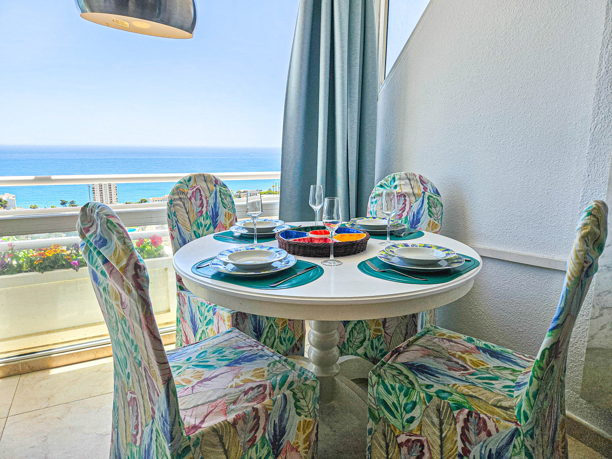 Take the stairs up to the bedrooms, bathroom and terrace. The master bedroom is furnished with a super king size bed and fitted wardrobes. Access the private terrace and enjoy the dining seating area, or reclining sun lounger chairs while you take in the stunning sea views. The guest bedroom offers twin beds and a large wardrobe. The apartment benefits from a family bathroom, where you will also find the washing machine. The bathroom is fitted with a bath with a shower attachment.