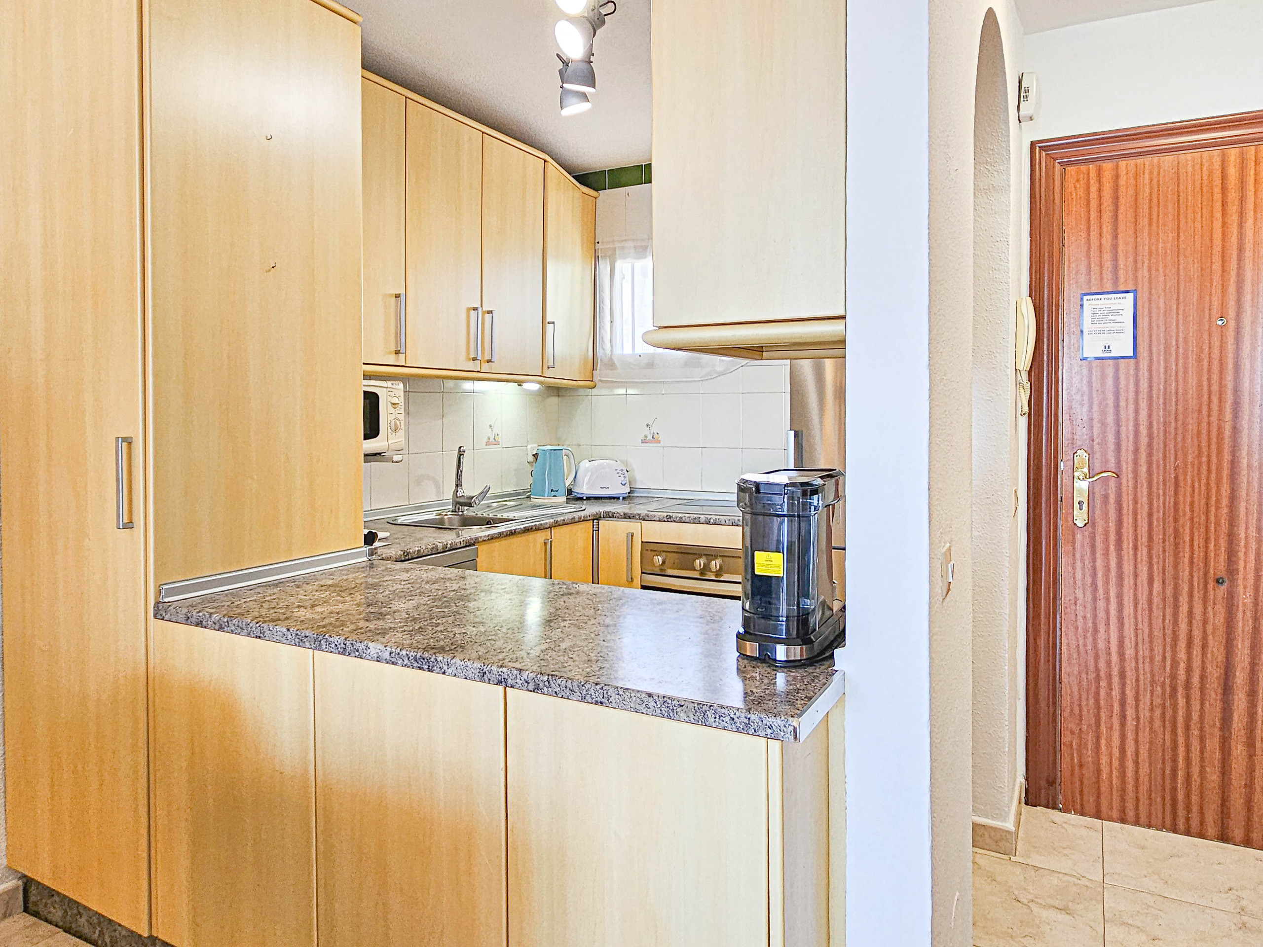 This spacious apartment is located on the third floor, with access by lift and is arranged over one floor. There is a separate, fully equipped kitchen and the open plan living space offers a dining seating area and an L shaped sofa that opens out to make a double bed, to sleep two people. There is also a 50¨smart TV and sound bar. There is access onto the wrap around from the lounge and dining areas. Here you can enjoy views of the pool while you relax in the lounge or dining seating areas. There are deck chairs, a built in charcoal BBQ and an awning for those hotter days.