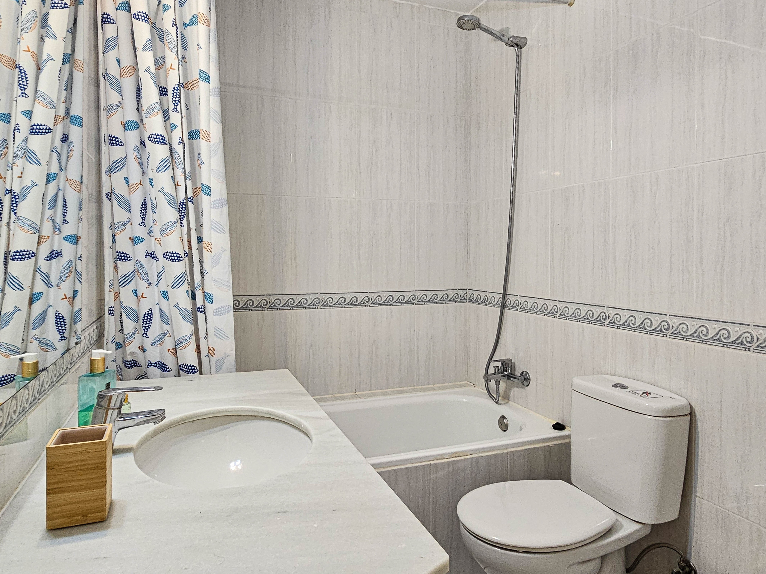 The master bedroom is furnished with a king size bed and the guest bedroom offers twin beds. Both bedrooms have fitted wardrobes and shutters. The apartment benefits from a family bathroom, fitted with a bath with a shower attachment and also a washing machine.