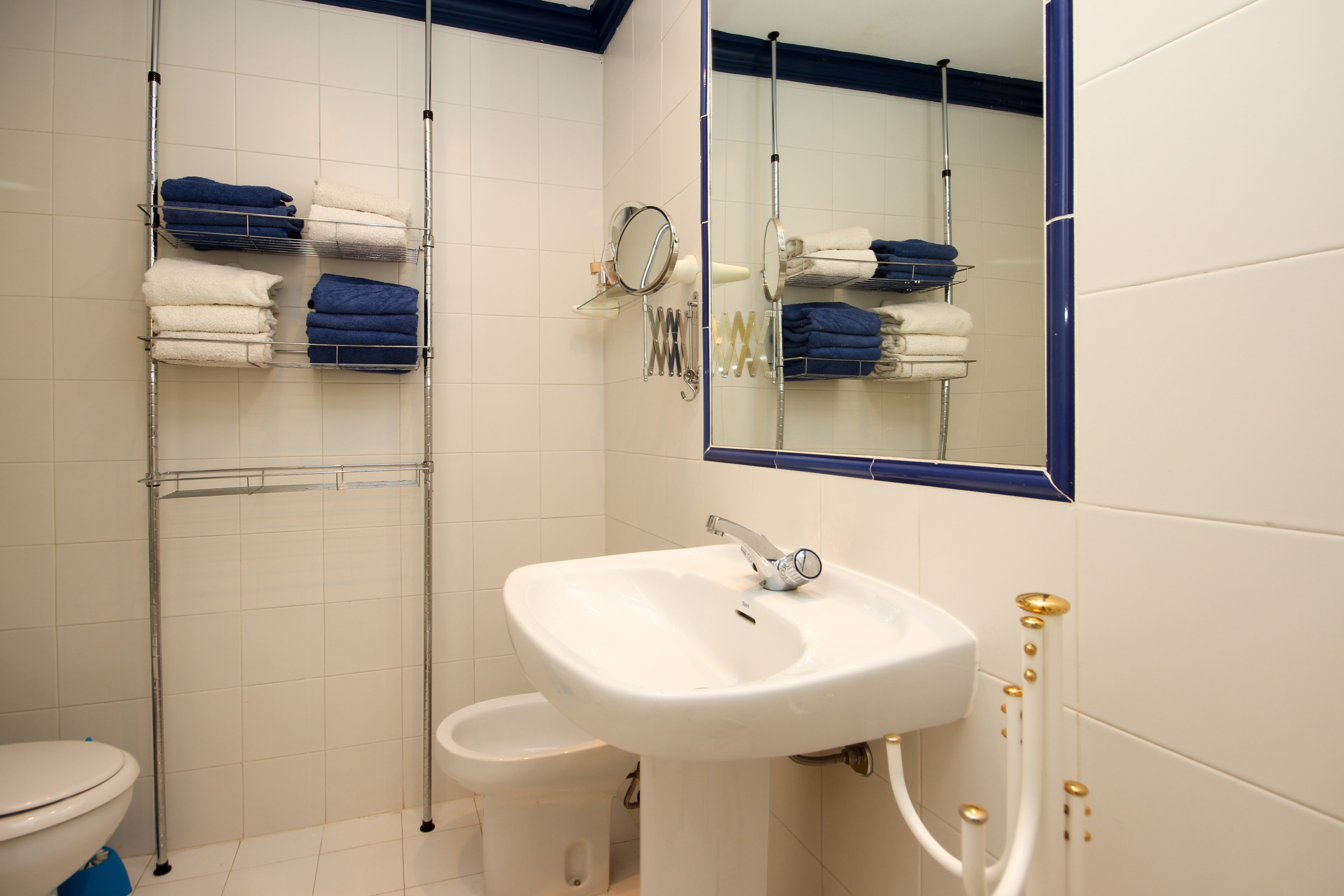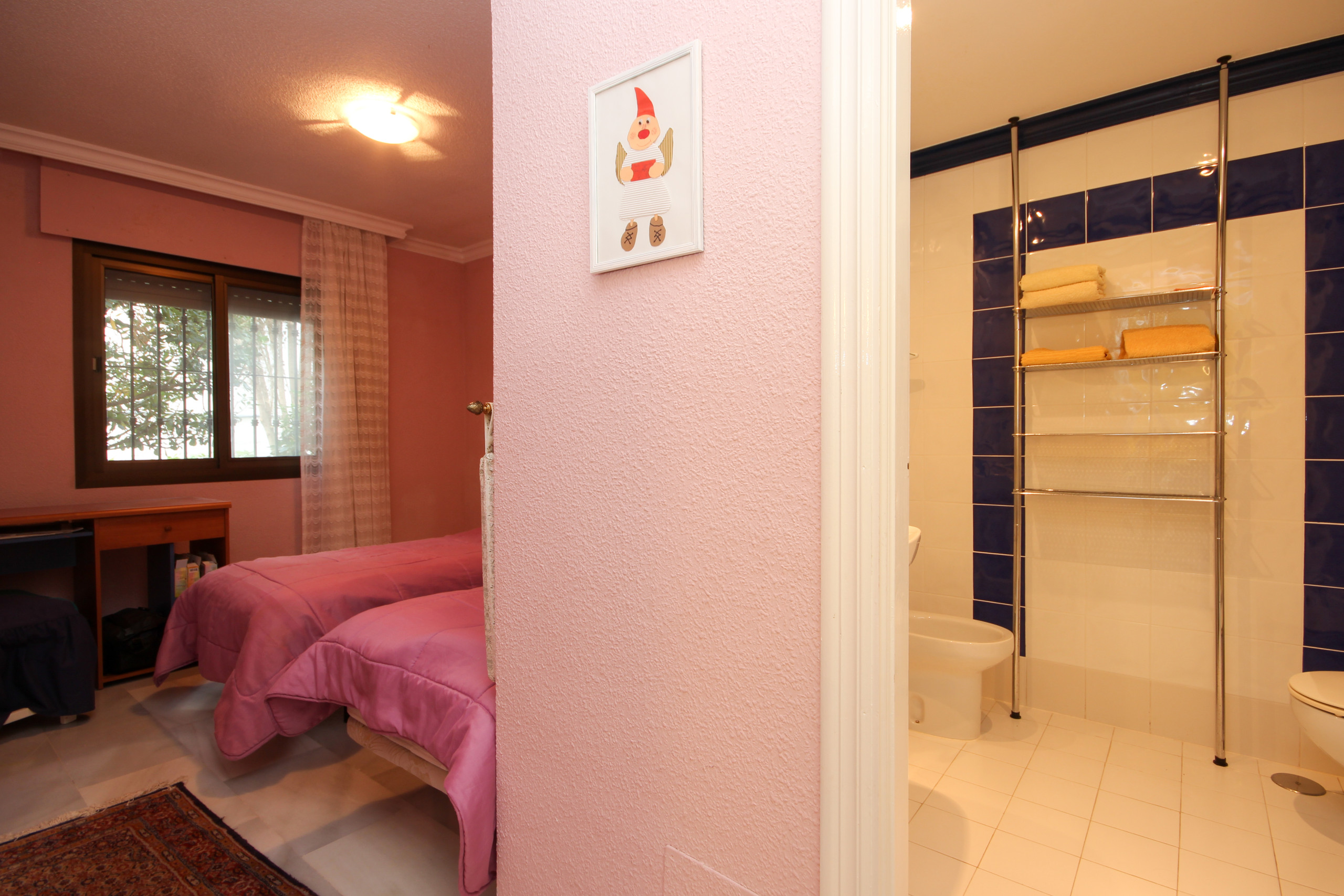 The apartment has two bedrooms both furnished with twin beds, and fitted wardrobes. Both bedrooms have their own bathroom offering a bath with a shower within.