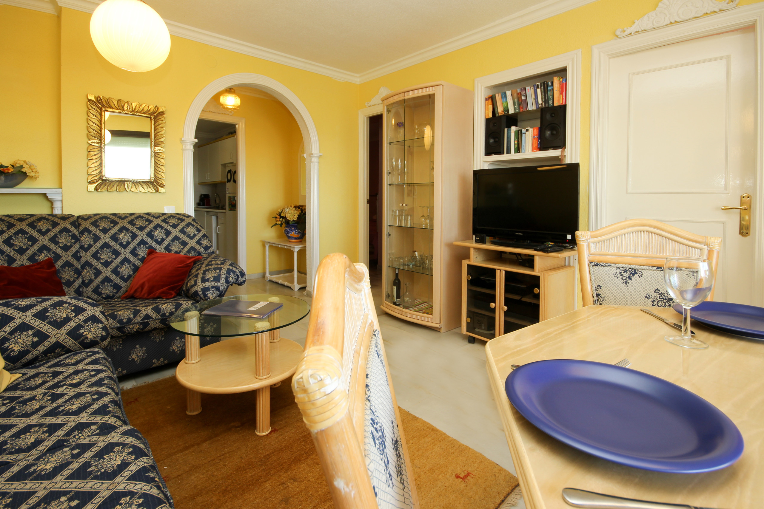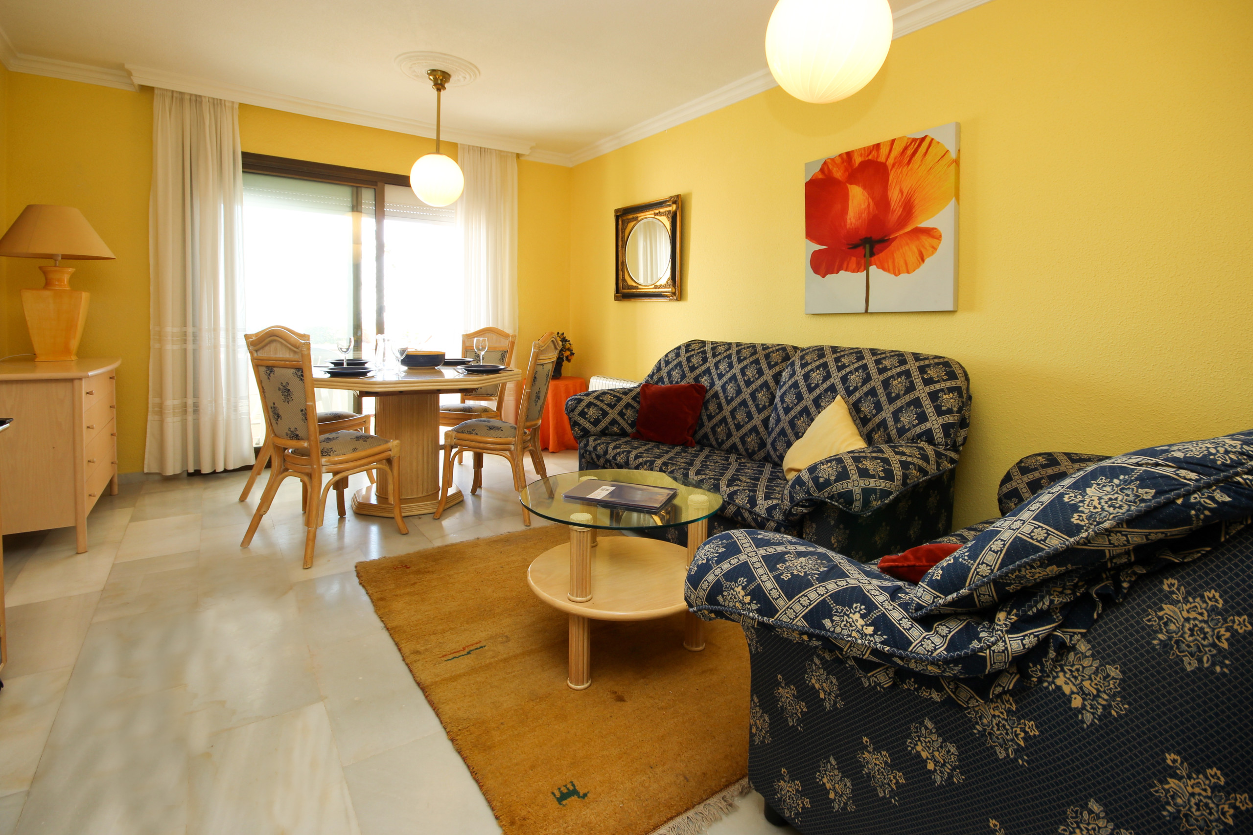 To your right is the lounge/dining area which is furnished with two settees, a small coffee table, a cabinet, a dining table with four chairs and a sideboard. The dining area opens on to a covered terrace which has wonderful views across the area to the Mediterranean Sea.