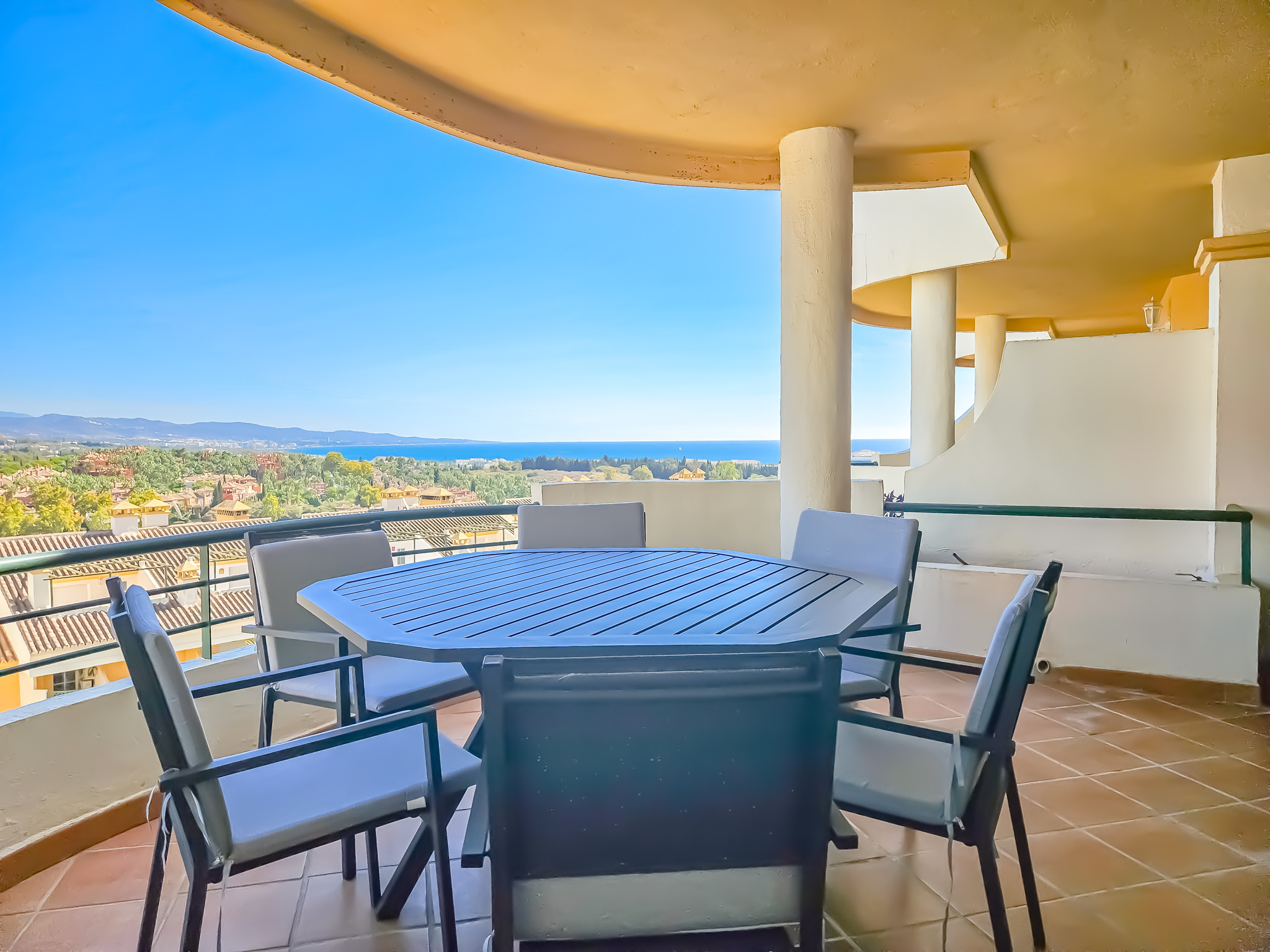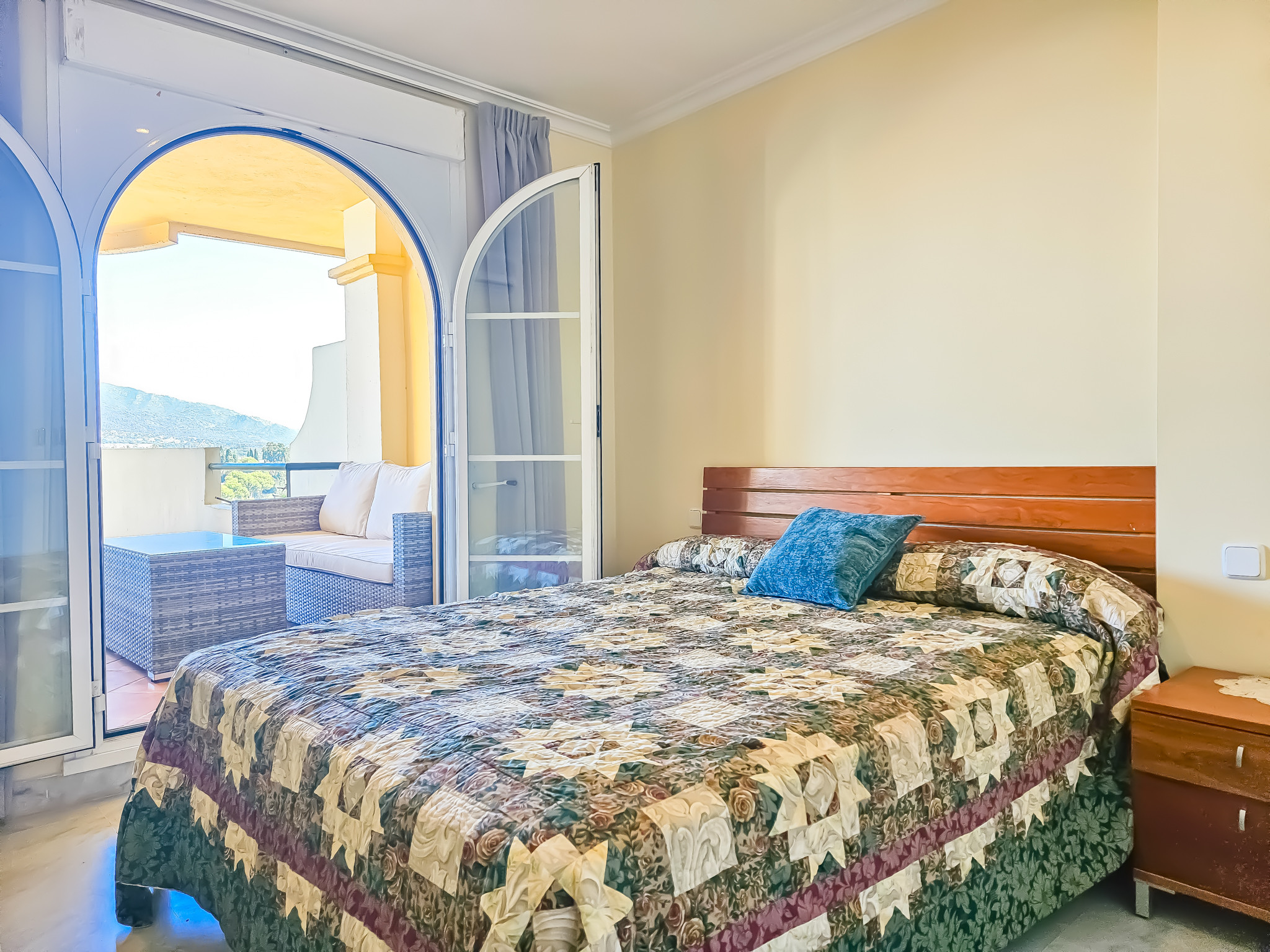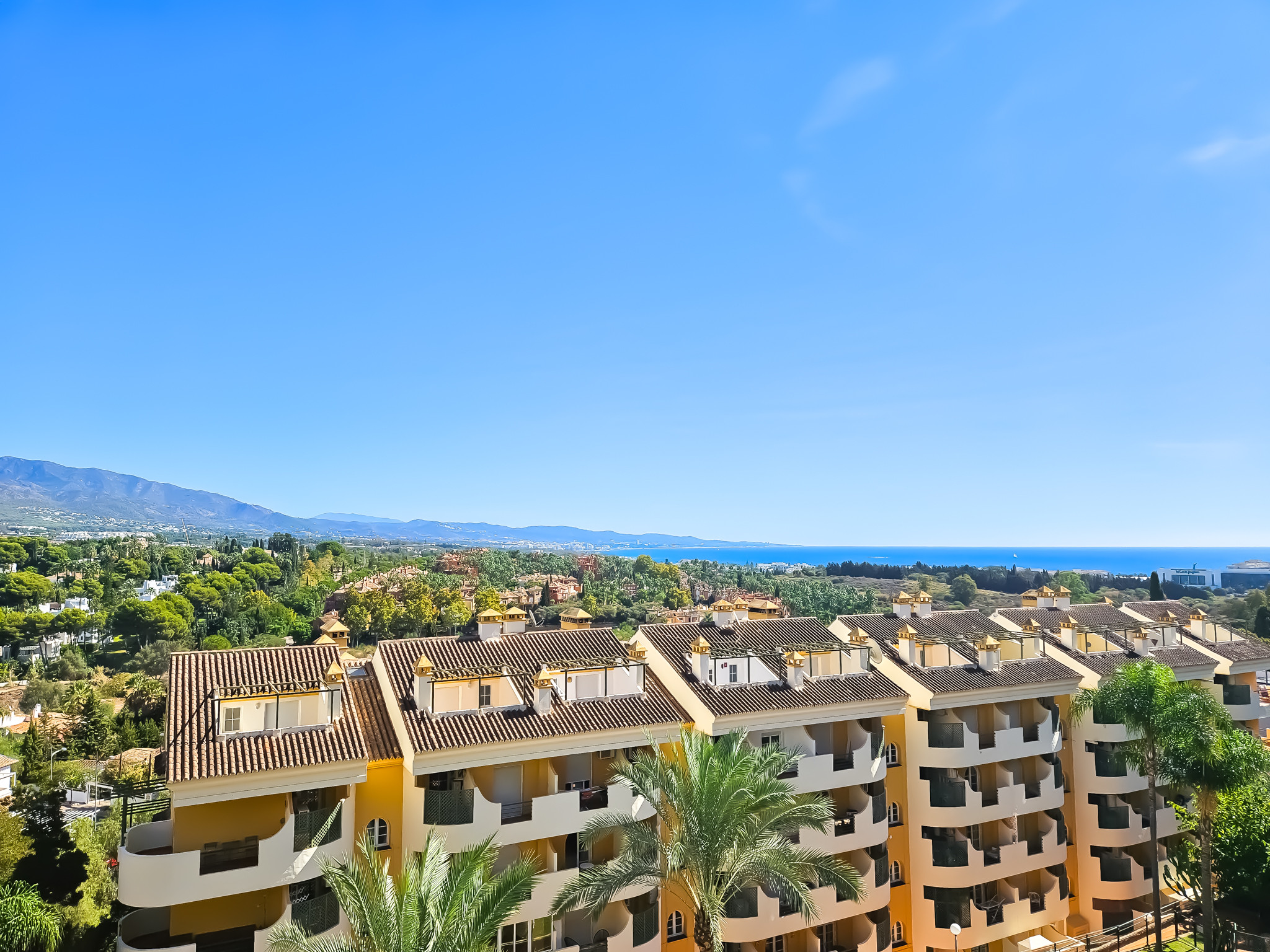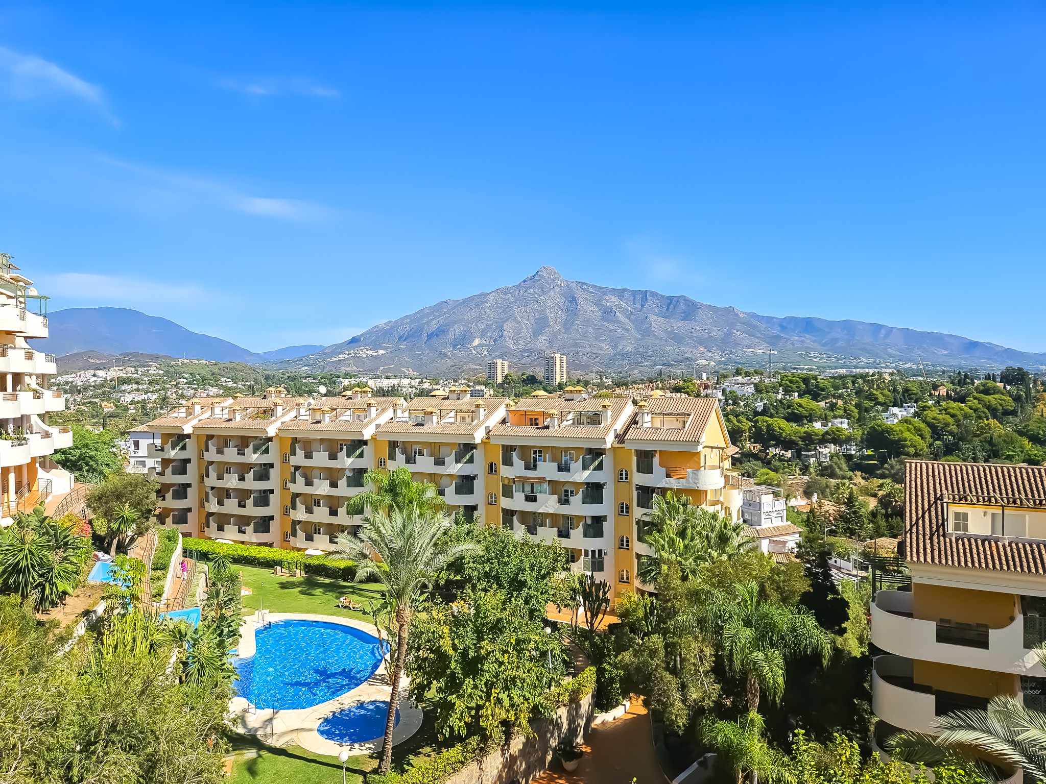 This two bedroom apartment is located in the Senorio de Aloha complex in Nueva Andalucia, The secure gated complex offers access to three communal pools, all with a waterfall and separate kids pools. The apartment benefits from a parking space in the underground parking. Stunning views can be enjoyed over the pools, mountain and the sea. The lounge and bedrooms have aircon units.