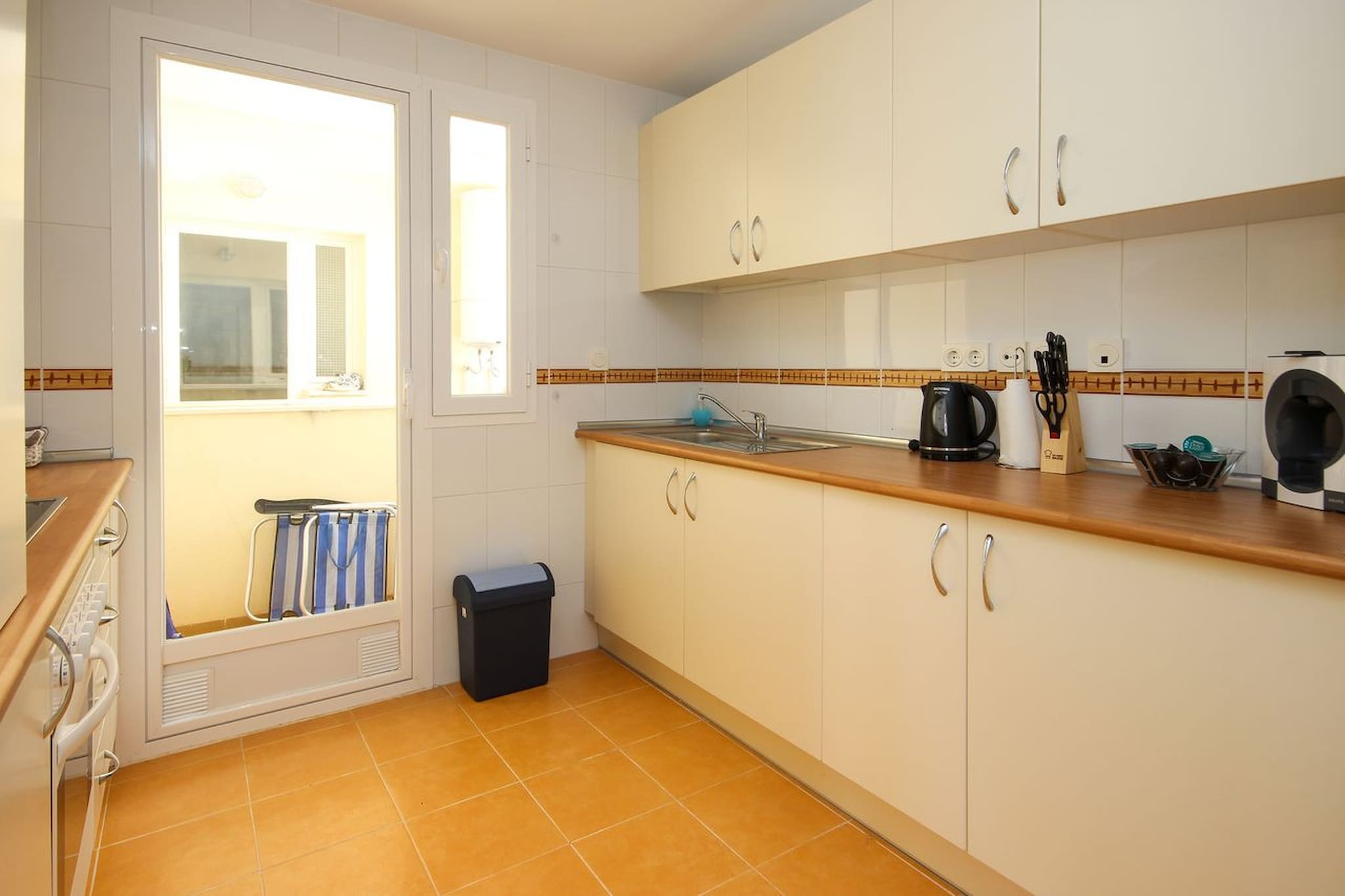 The apartment has a fully equipped kitchen and a small utility area with a washing machine and across the entrance hall is a lounge/dining room with a dining table and 6 chairs, a large L shaped sofa with adjustable head rests and a large smart TV.