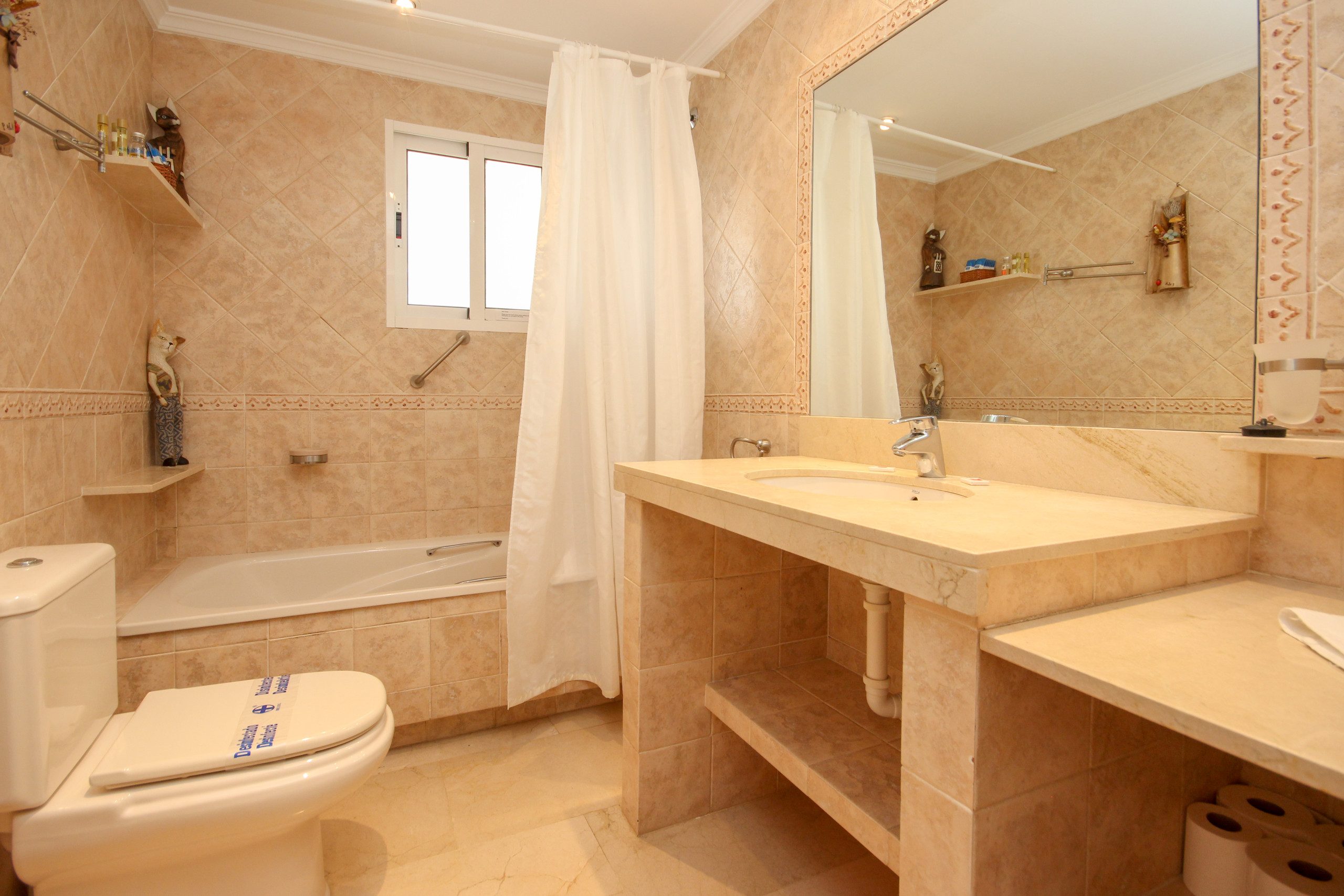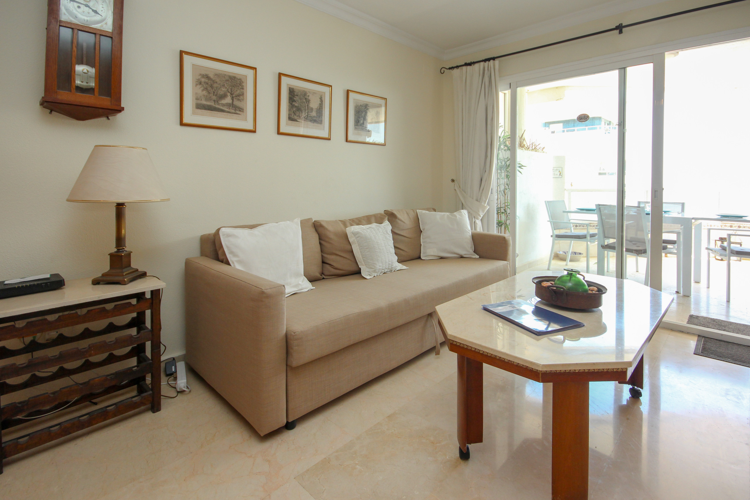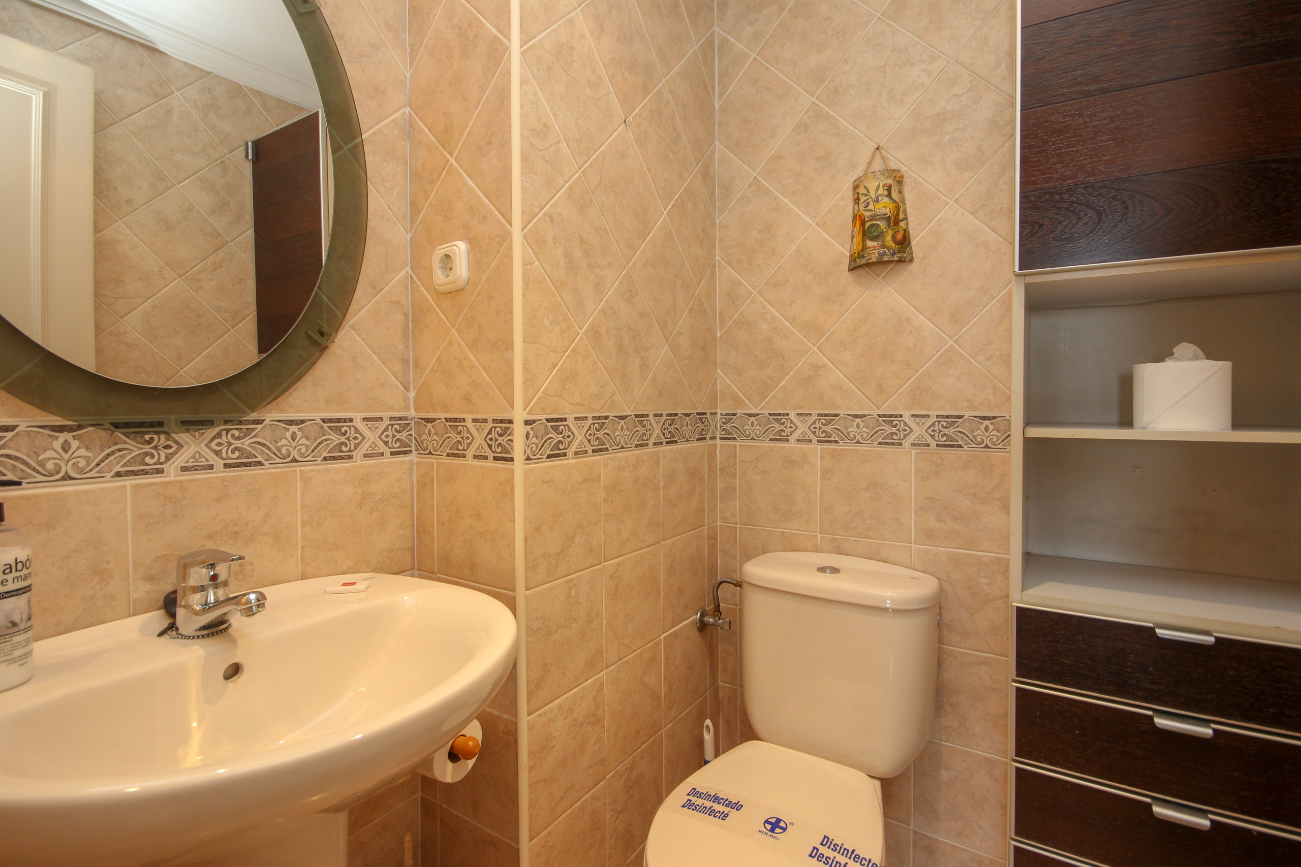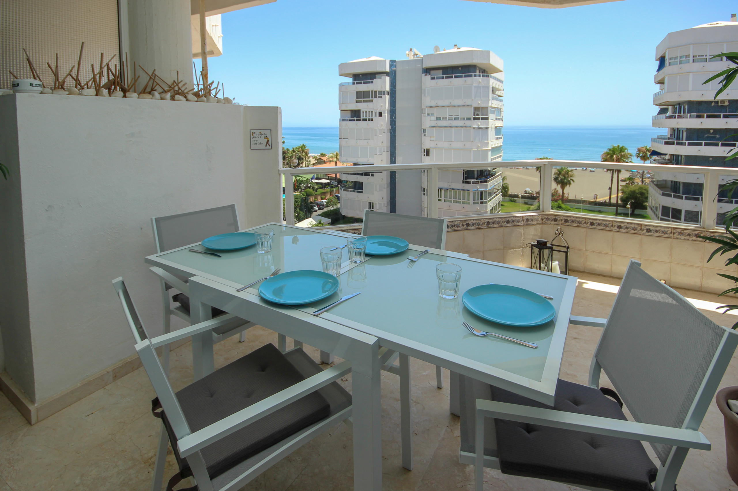 The apartment is located on the 5th floor accessed by lift from the parking. The living area is arranged over one floor and consists of a spacious lounge/diner furnished with dining table and chairs, a double sofa bed and a TV for viewing DVDs and videos. The DVD also works as a CD. The wrap around terrace is accessed through the lounge and bedroom and offers wonderful views over the complex pool to the beach and sea. There is a separate fully equipped kitchen which has access to the utility terrace. As well as the full bathroom there is a guest toilet. The lounge is fitted with an A/C unit. The apartment offers free WiFi.