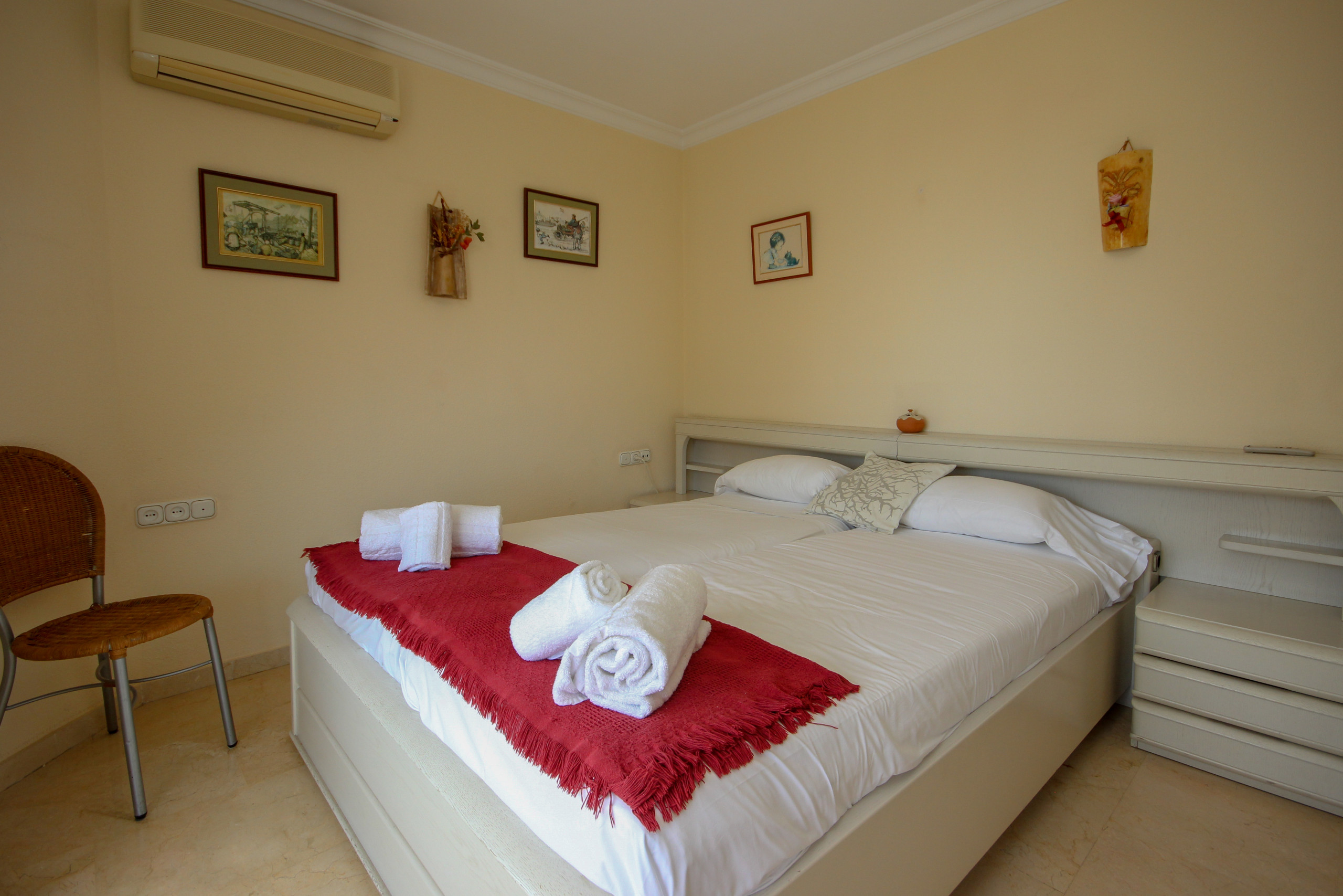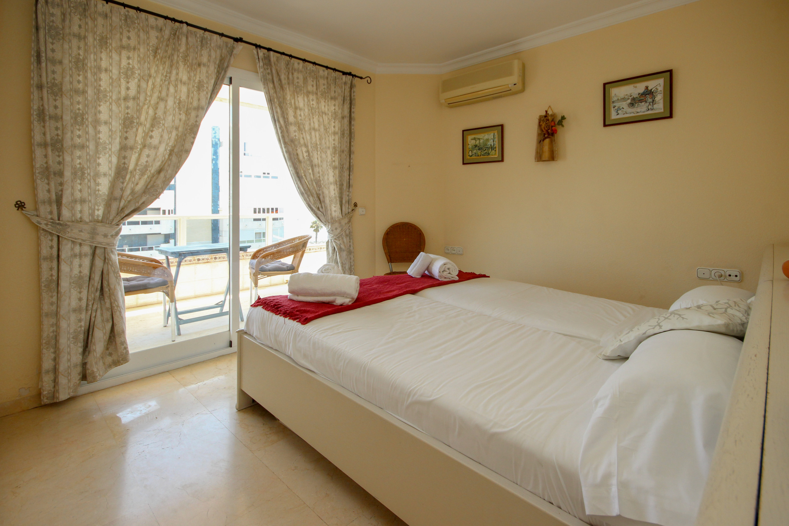 The bedroom is furnished with a double bed frame fitted with 2 single mattresses, an A/C unit and has access to the terrace.
