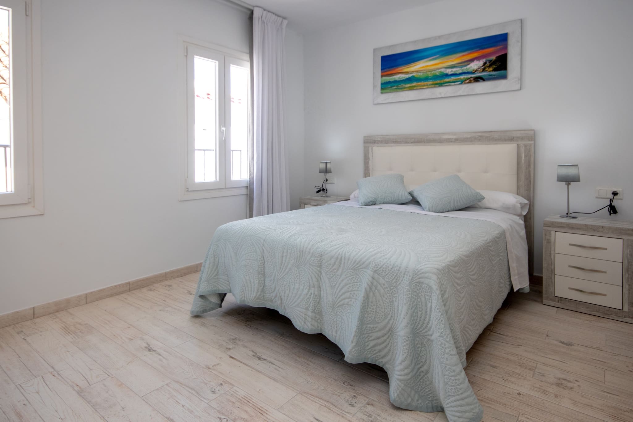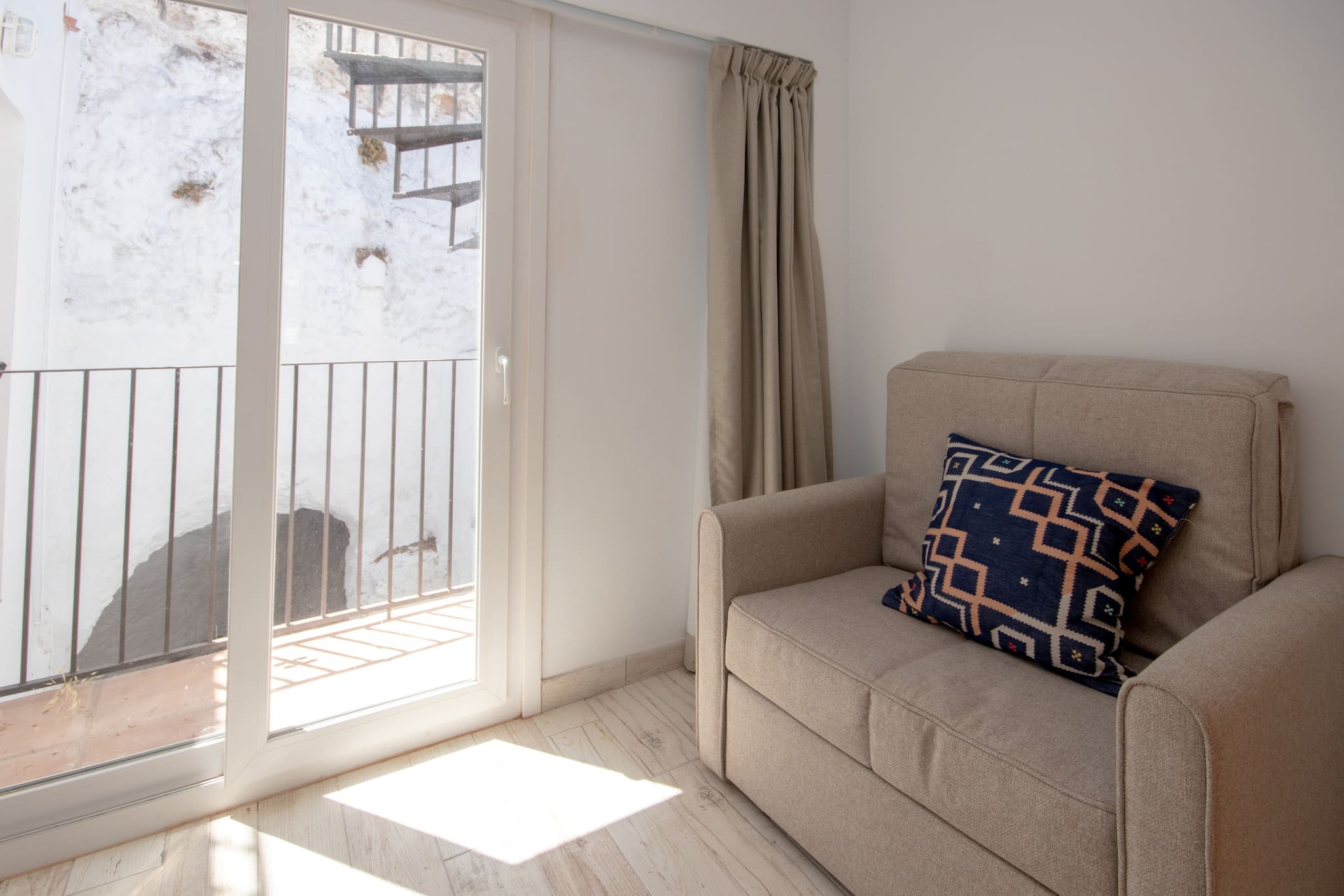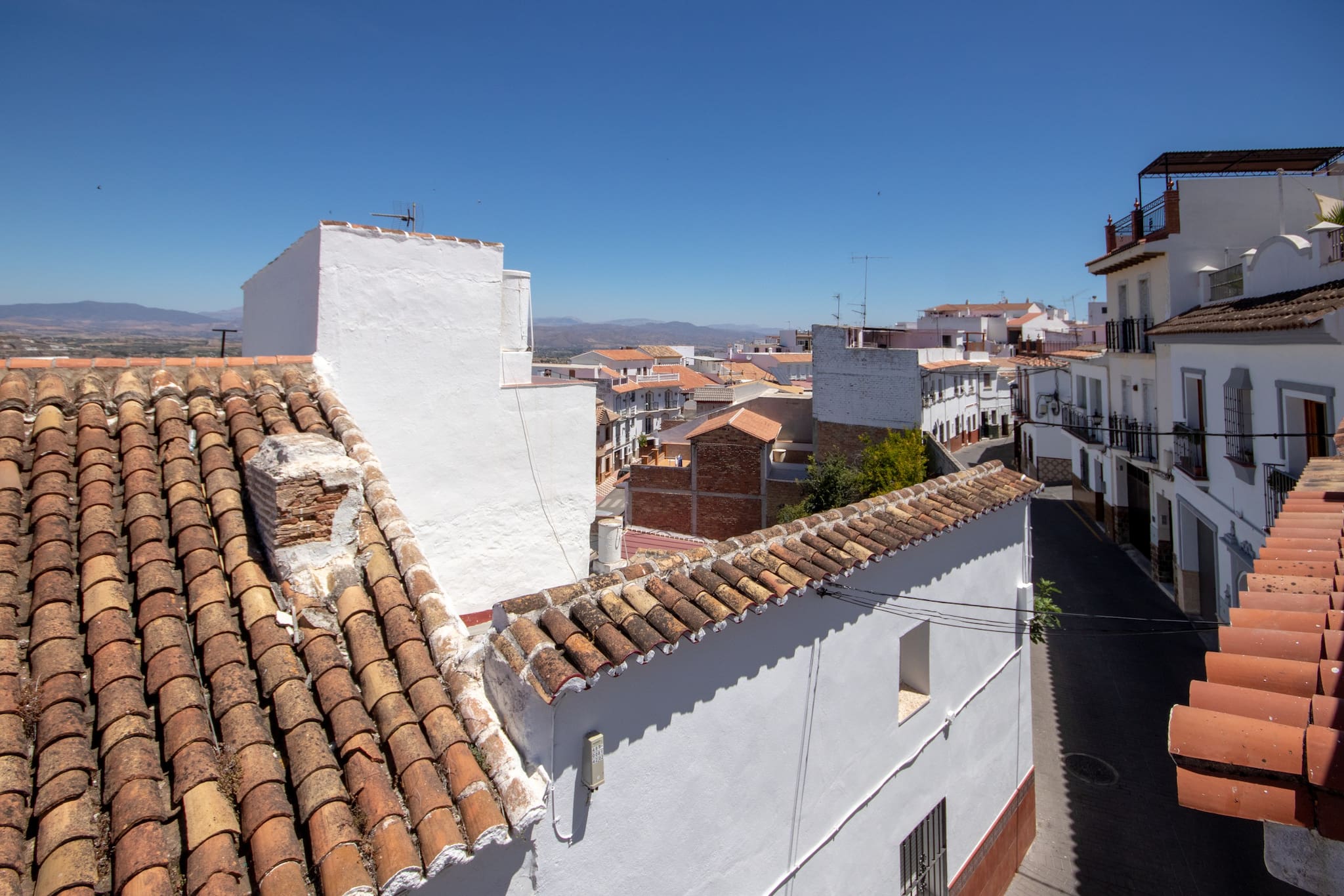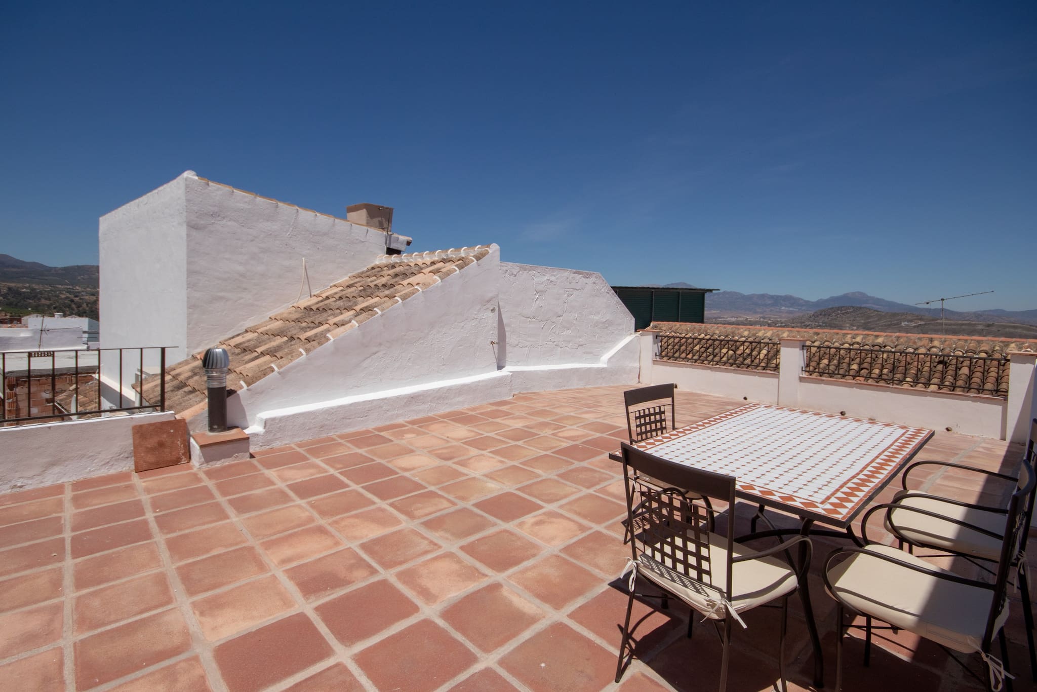 Take the stairs to the upper floor and the bedrooms. The spacious master bedroom is fitted with a king size bed and enjoys an en suite shower room. The guest bedroom is furnished with 2 single beds that store one underneath the other. This bedroom has use of the guest bathroom fitted with a bath and overhead shower fitting. There is a small Annex room furnished with a single armchair bed that is suitable for a child. Through this Annex room you have access via a spiral staircase to the roof terrace. This terrace is furnished with a dining table and chairs and offers wonderful views of the roof tops to the beautiful Alhaurin mountains.