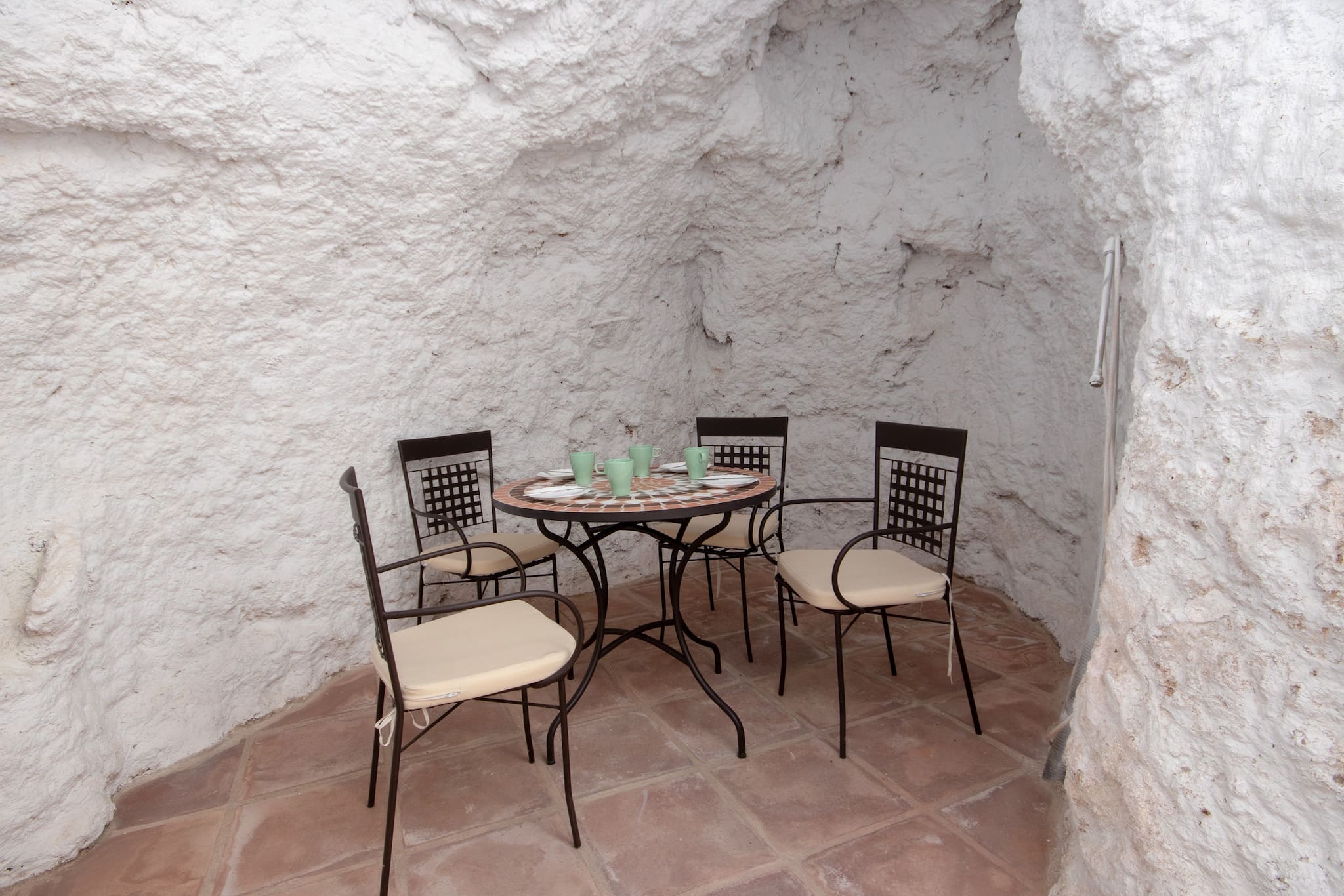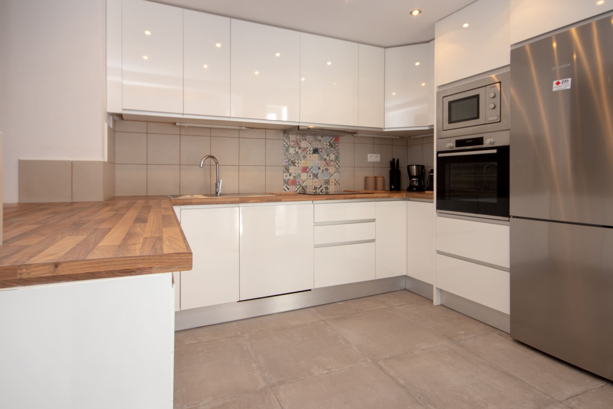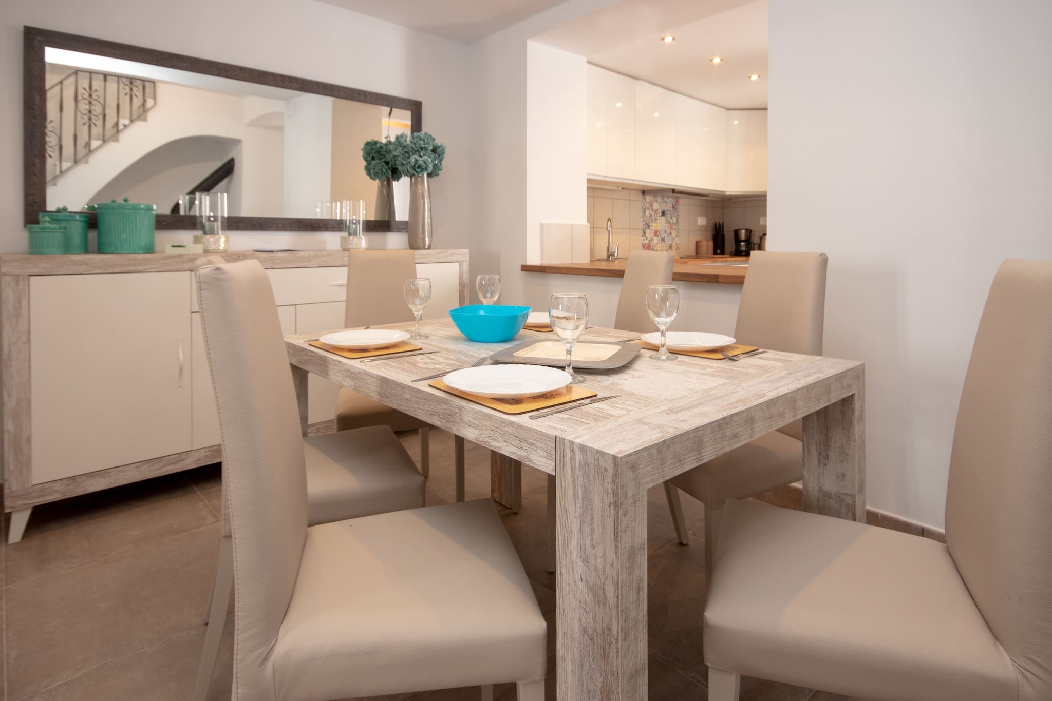 Enter the property into the lounge area and be greeted by the light and modern style interior. The lounge is furnished with a sofa, 2 arm chairs and a TV. This room is fitted with an A/C unit. Follow through the room to the dining area fitted with a dining table and 6 dining chairs. The modern and fully equipped kitchen benefits from a semi-open plan style with a convenient hatch through to the dining area. From here you gain access to the lovely patio and cave area. This floor also offers a guest WC.