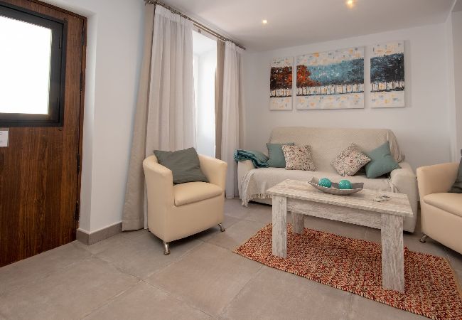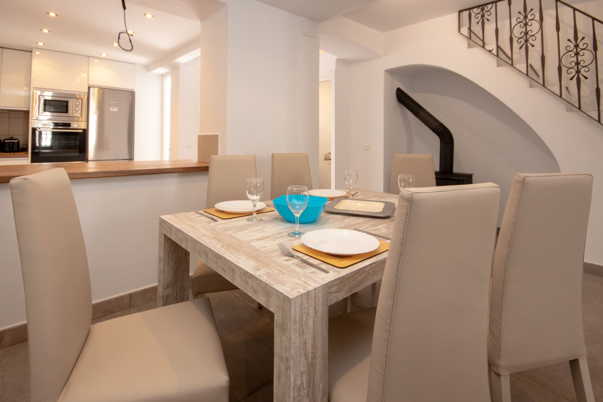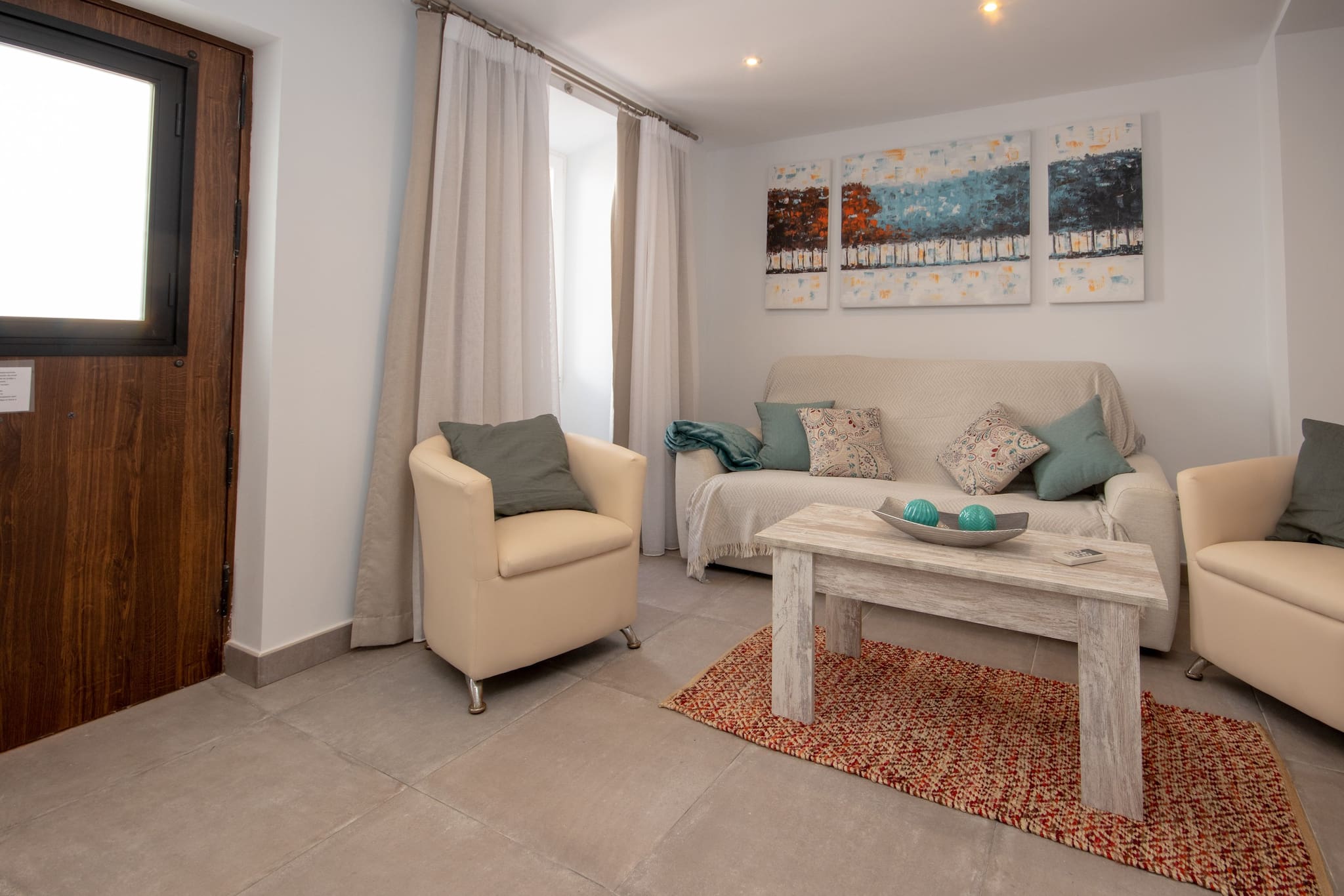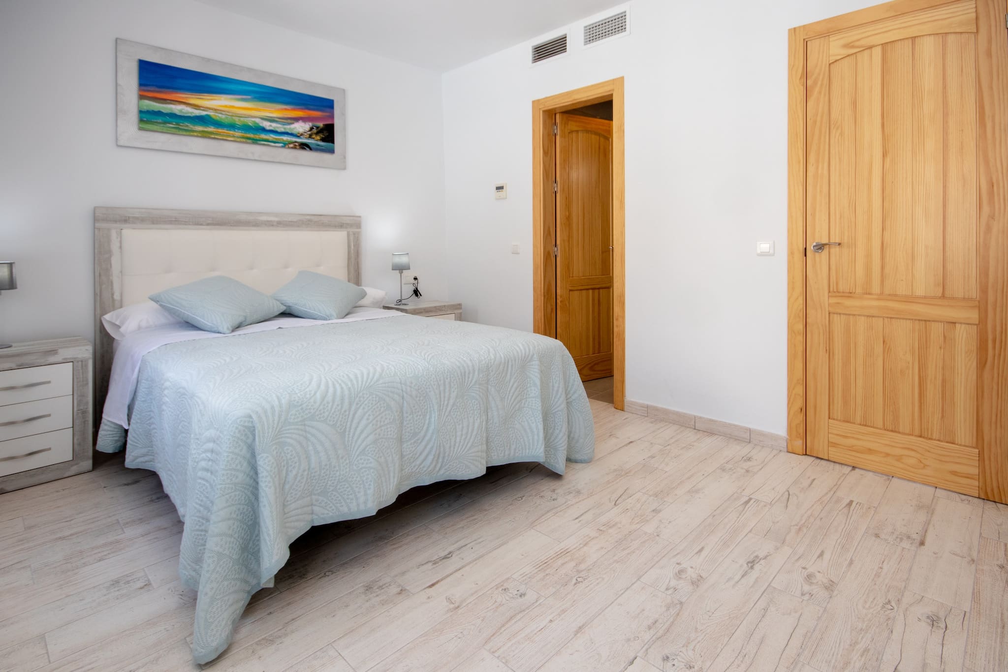Enter the property into the lounge area and be greeted by the light and modern style interior. The lounge is furnished with a sofa, 2 arm chairs and a TV. This room is fitted with an A/C unit. Follow through the room to the dining area fitted with a dining table and 6 dining chairs. The modern and fully equipped kitchen benefits from a semi-open plan style with a convenient hatch through to the dining area. From here you gain access to the lovely patio and cave area. This floor also offers a guest WC.