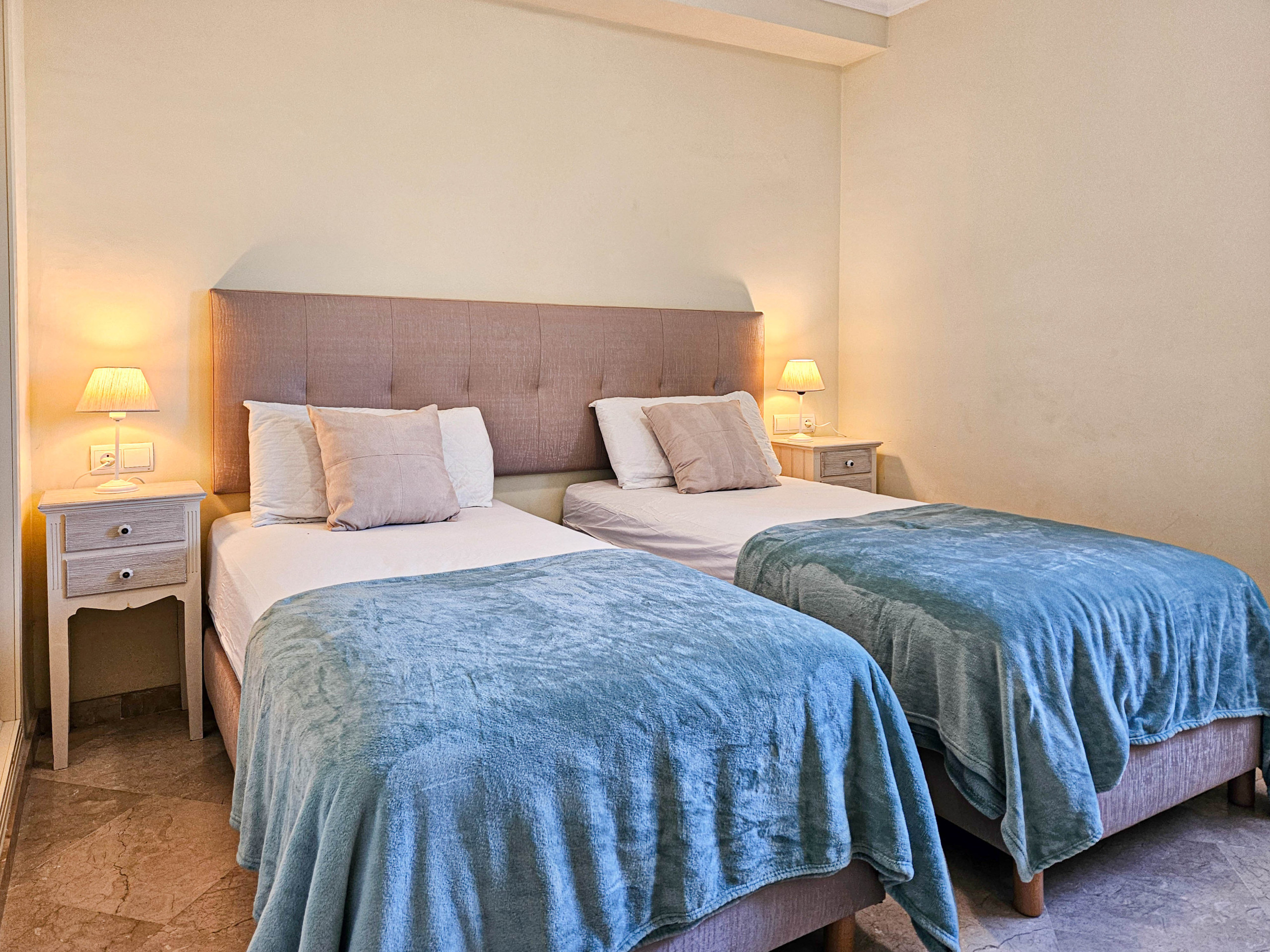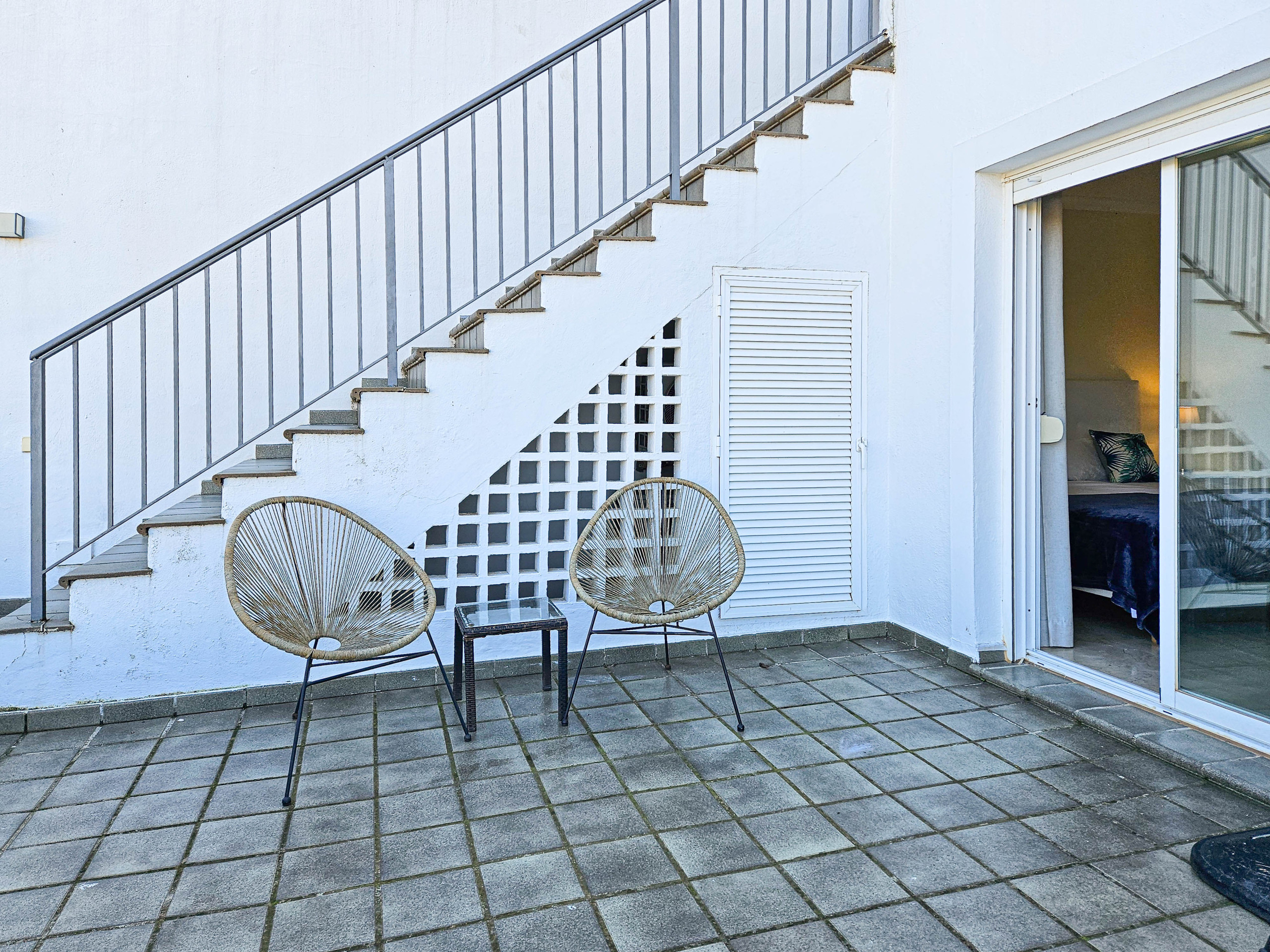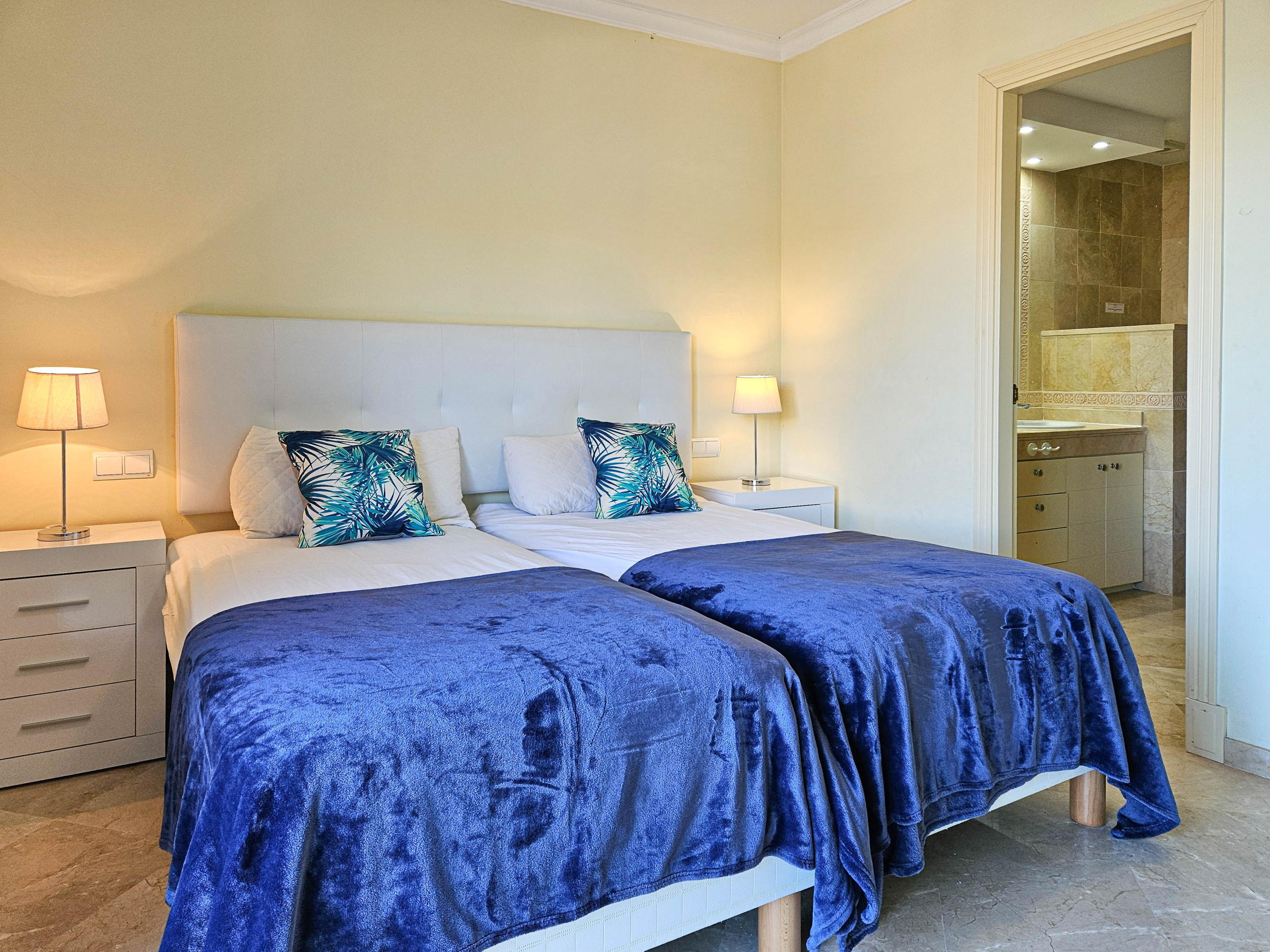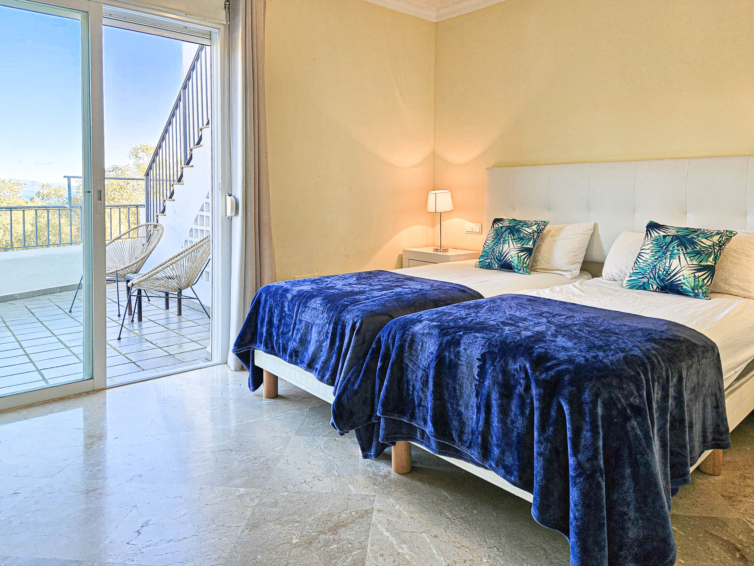A stairwell leads down to the lower bedroom level and the bedroom terrace fitted with sun loungers and a double framed hammock bed. The first bedroom is fitted with twin beds and benefits from an ensuite bathroom and access to the terrace. The two other bedrooms are also fitted with twin beds and share a full guest shower room. The townhouse is equipped with A/C and free WiFi.