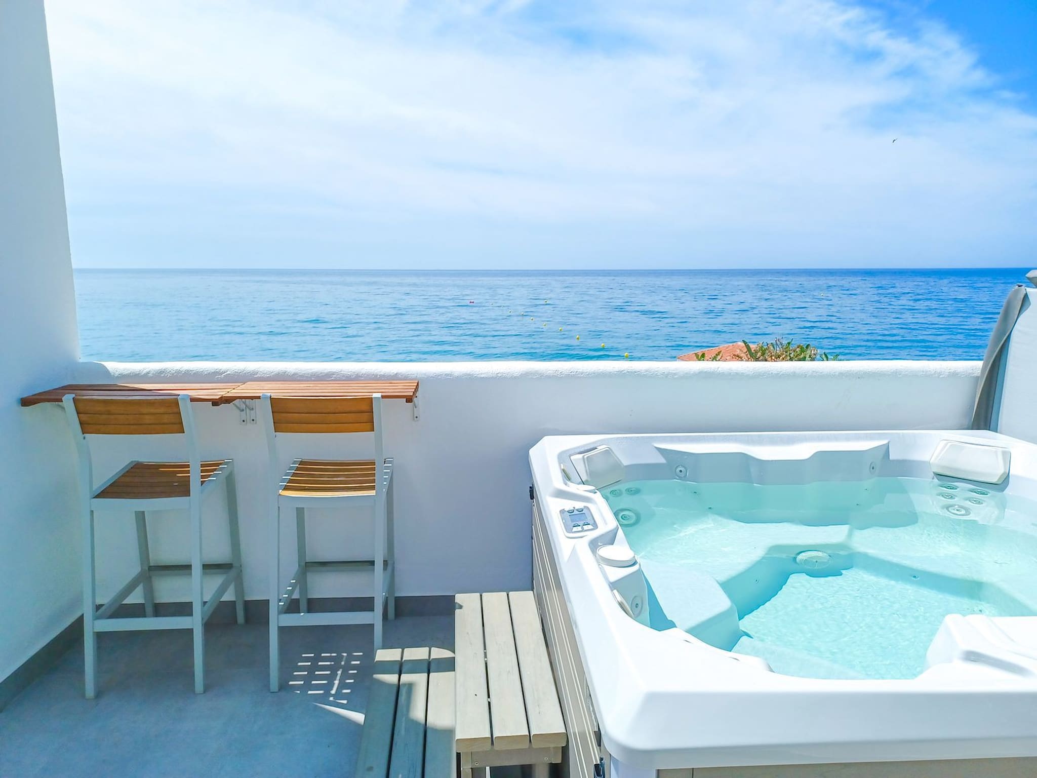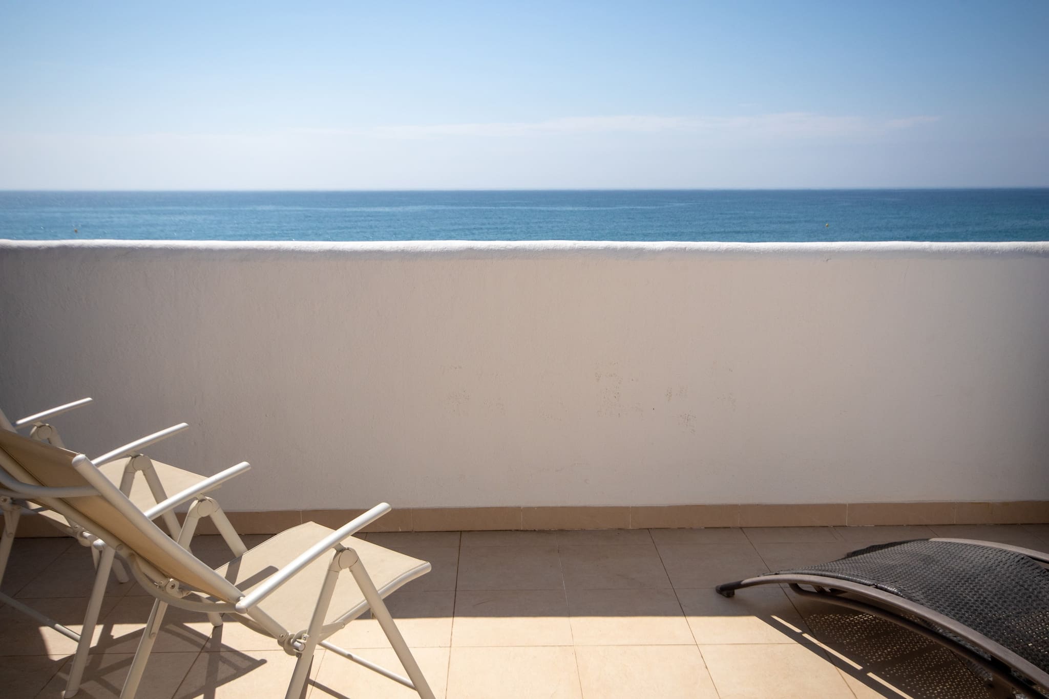 Take the stairs to the upper level and there are 2 of the bedrooms. One is fitted with a double bed and enjoys its own private, south facing terrace with views over the Mediterranean sea and beach and en suite bathroom. The 2nd bedroom is furnished with 2 single beds and has use of the guest shower room. Take a further set of stairs up to the master bedroom. This room is furnished with a super king size bed and benefits from a separate dressing room, en suite shower room and a private, south facing terrace again with uninterrupted sea and beach views.