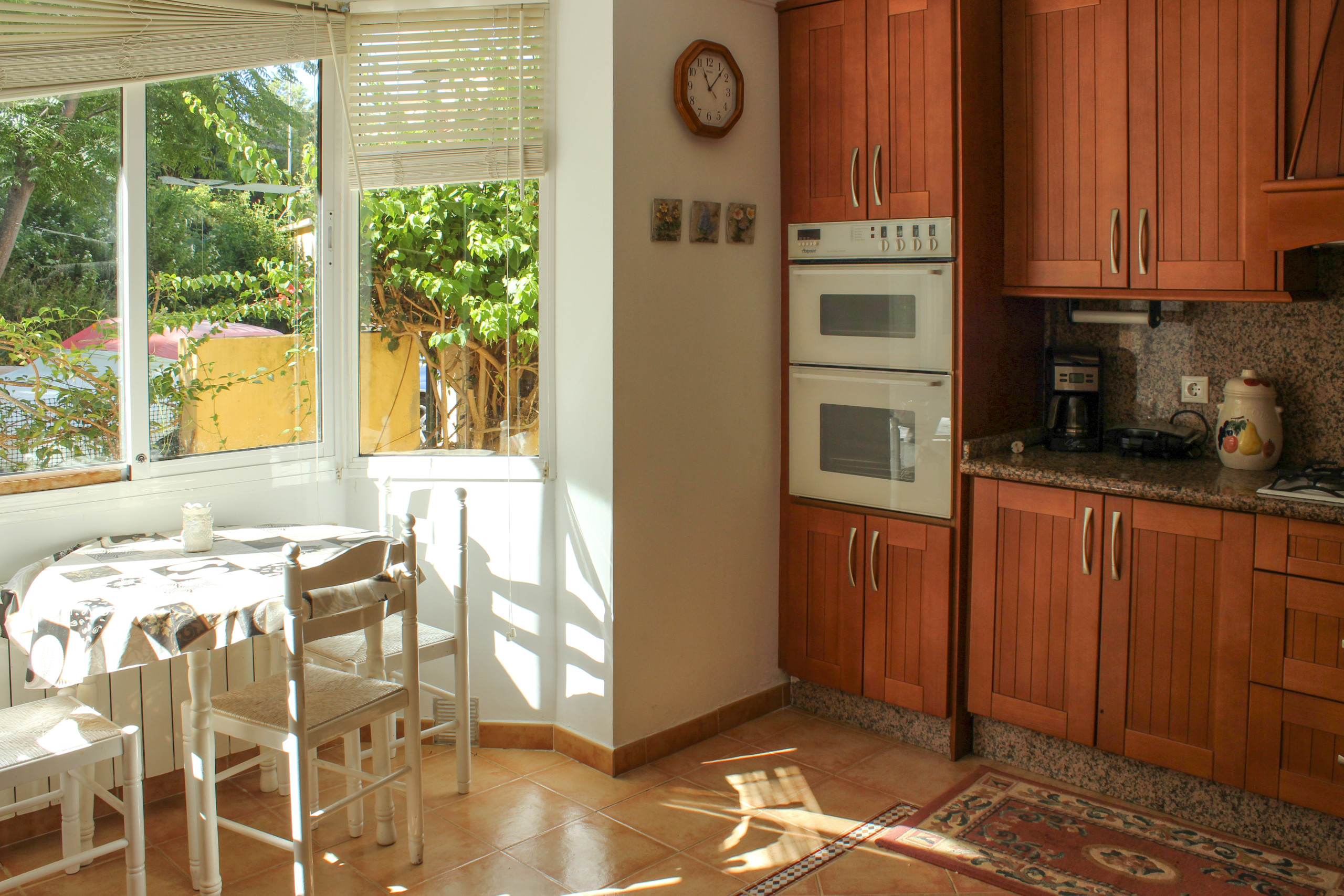 This spacious and comfortable townhouse is arranged over 3 floors and benefits from a roof terrace which offers all day sun and lovely views over the tennis club and mountains with private parking. The ground floor consists of a large lounge furnished with comfortable sofas and seating area, TV, DVD. The lounge leads out onto a terrace, fitted with a dining table and chairs, and to the private, fenced garden. Also on the ground floor is the large kitchen, fitted with a breakfast table and chairs and all necessary appliances. There is also a guest WC located on this floor.