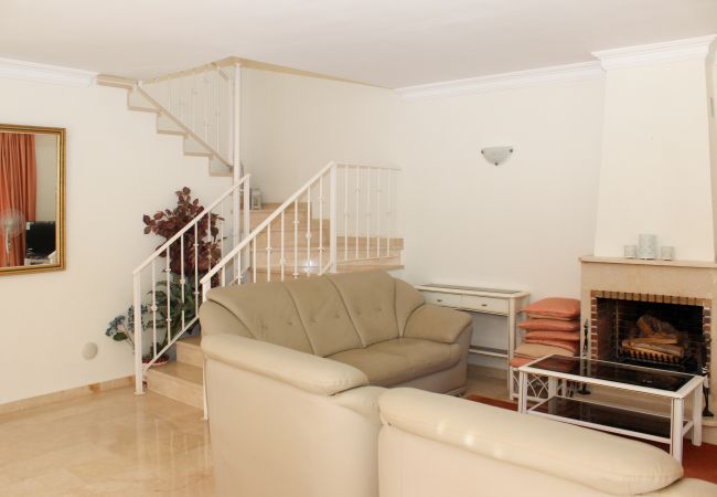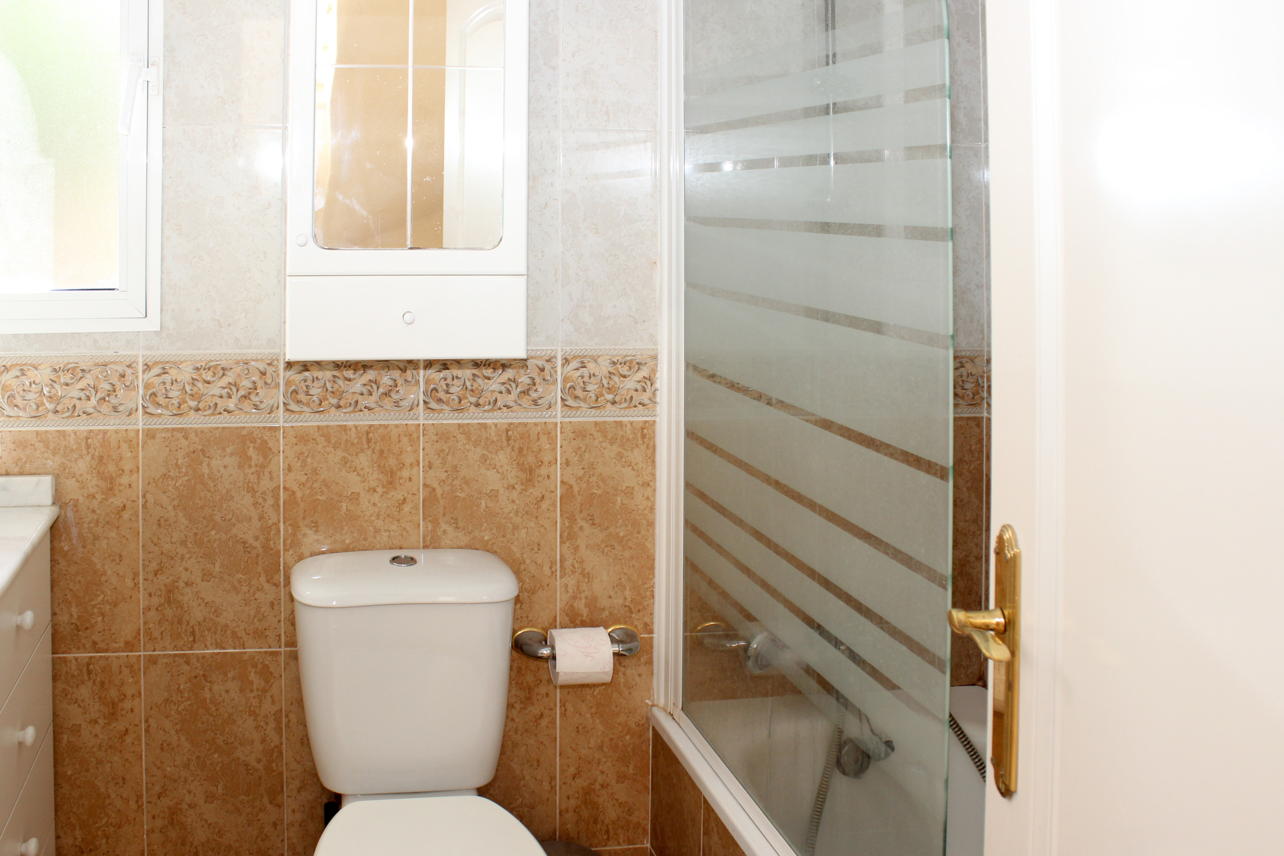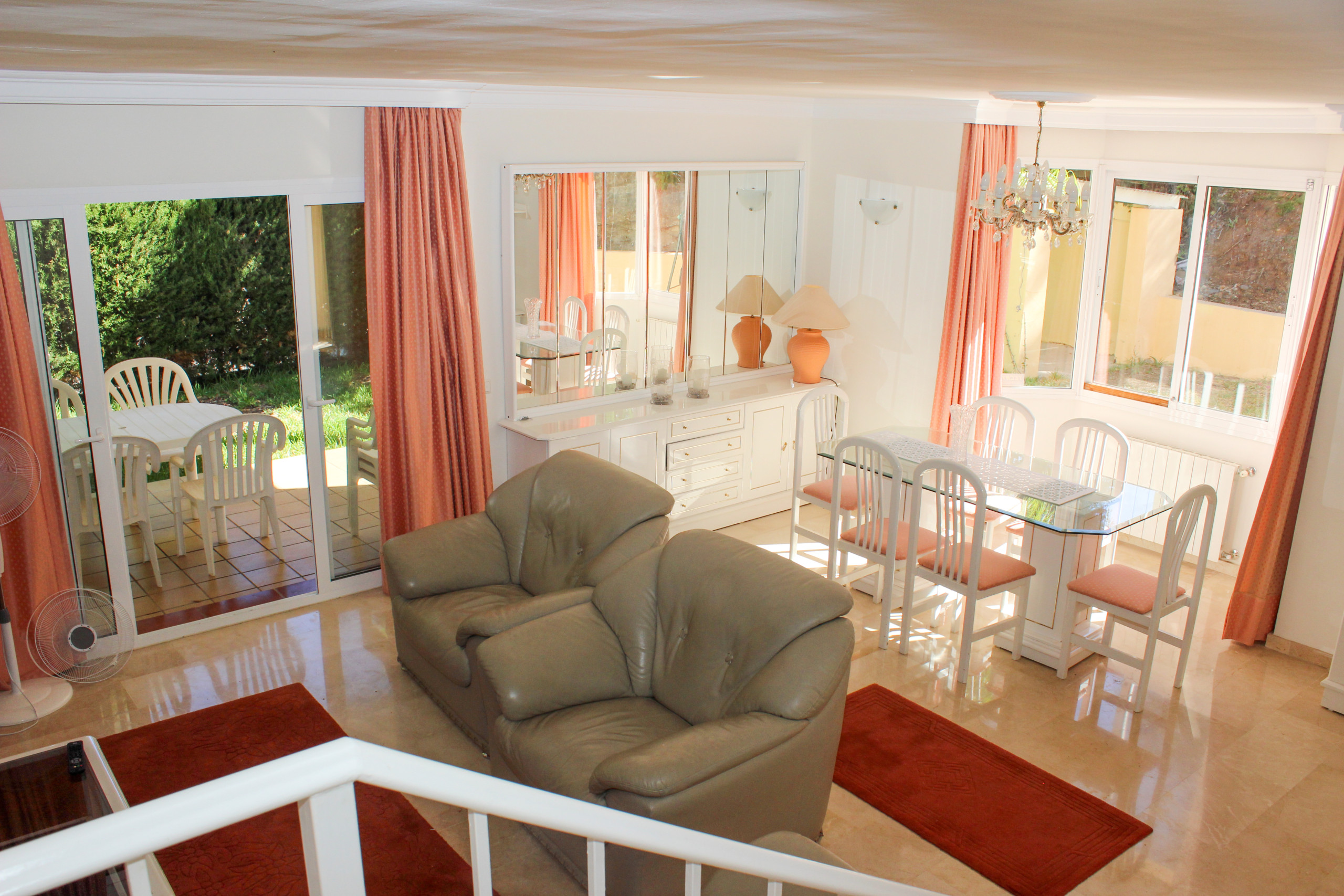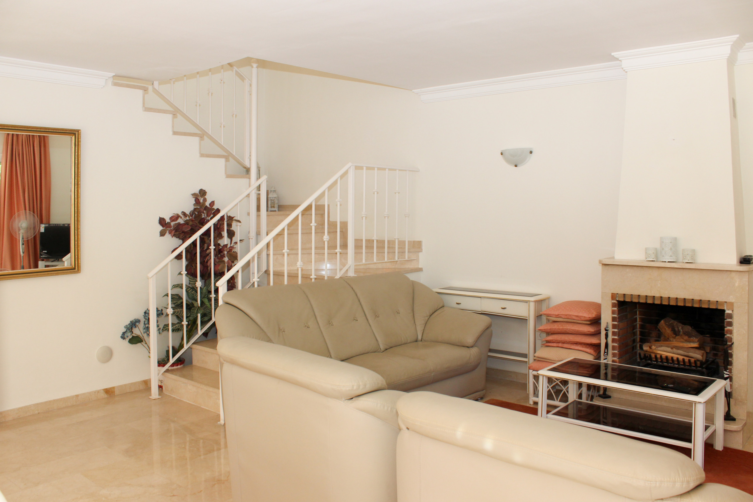 This townhouse is arranged over 3 floors and is well-maintained to a high standard. On the entrance level is the lounge/diner, furnished with comfy sofas, TV and dining table and chairs. There is also a guest toilet and the spacious, fully-equipped kitchen fitted with a breakfast table and chairs. From the lounge there is access to the tiled terrace and the steps down to the communal areas and swimming pool. The terrace is furnished with terrace table and chairs for outdoor dining.