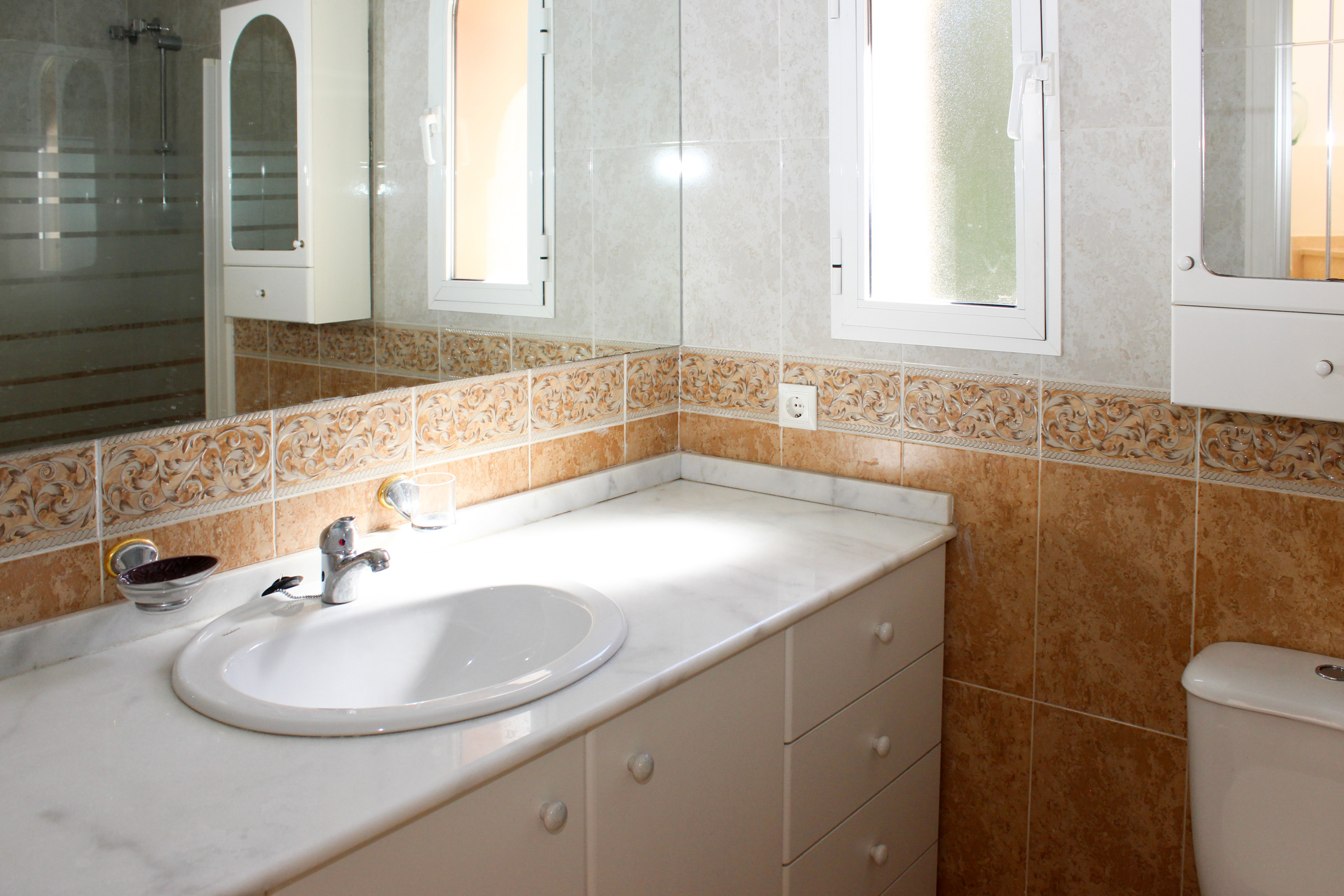 The three bedrooms are located on the first floor. The master bedroom is furnished with a king size bed, fitted wardrobes and has access to a private terrace with views of the pool and also an ensuite bathroom, with a bath and shower attachment. The second bedroom is furnished with two single beds with the option of a super king size topper being added to the bed to make it a super king size bed. The third bedroom has twin beds and fitted wardrobes. The guest bedrooms have access to the guest bathroom, which benefits from a bath and shower attachment.