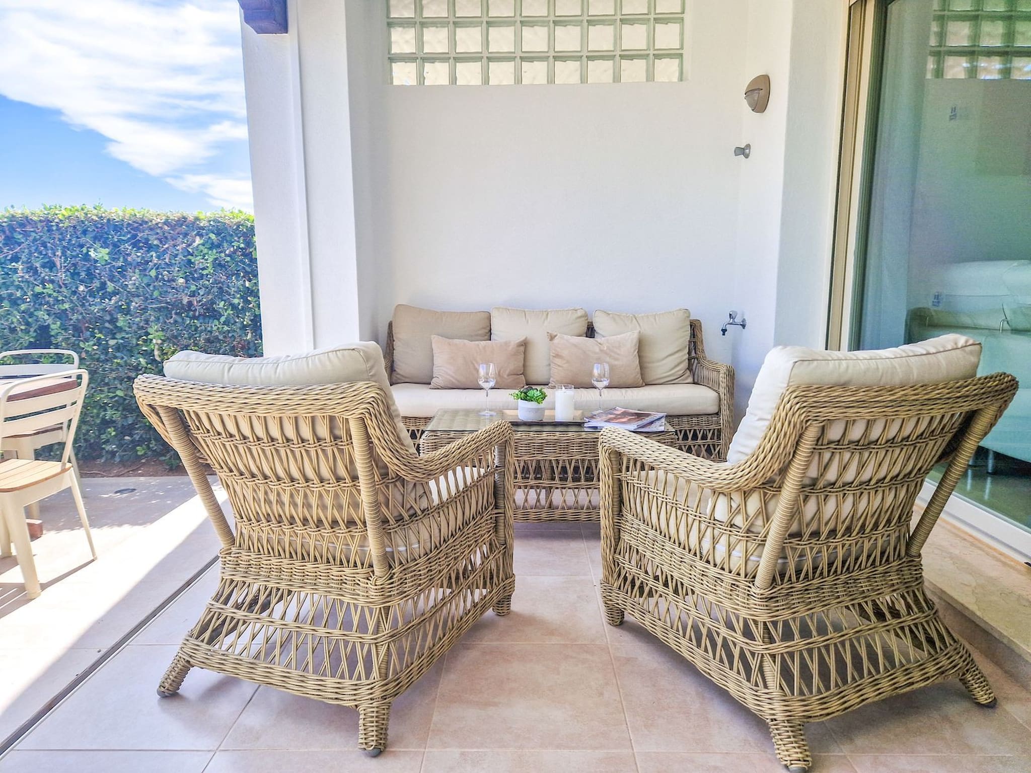 Located up the open staircase are the bedrooms and family bathroom. The master bedroom is furnished with a king size bed, fitted wardrobes and dressing table. This room has access onto a private terrace, furnished with a table and two chairs. The guest bedroom benefits from a double size bed and fitted wardrobes. Both bedrooms have access to the family bathroom, fitted with a bath and shower attachment.