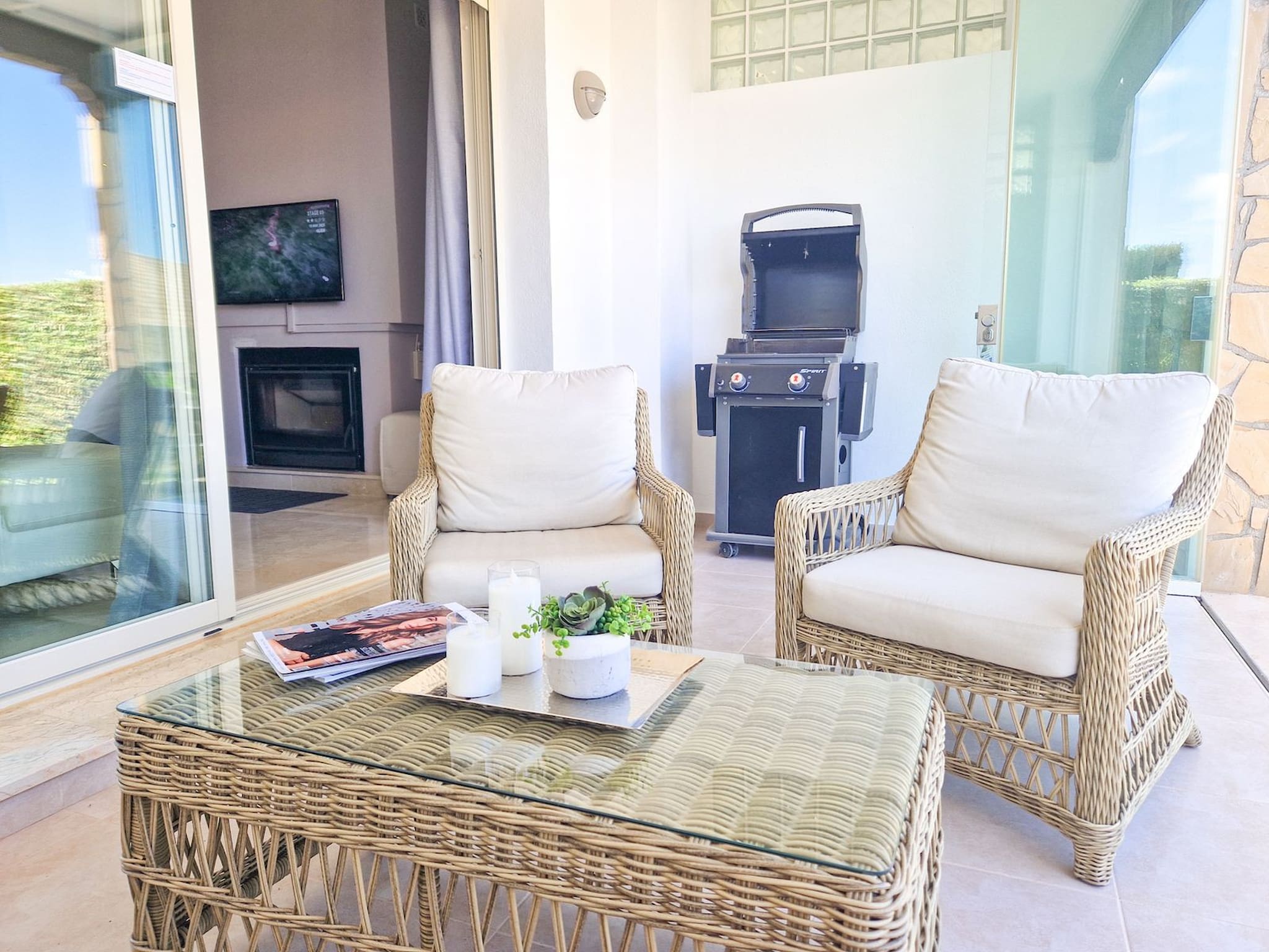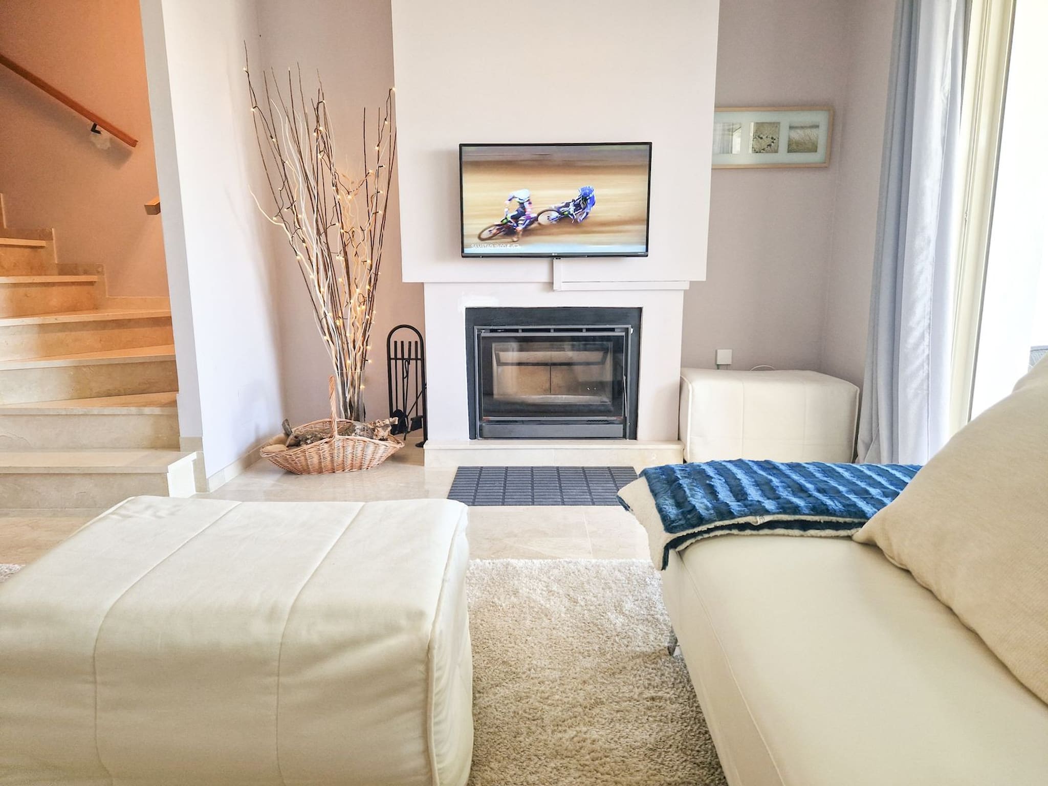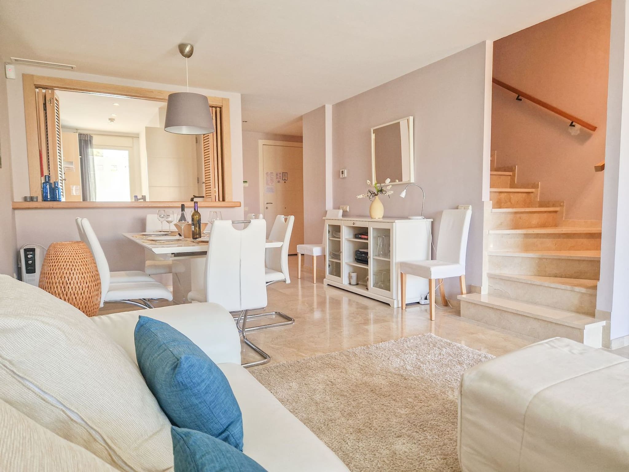 This tastefully furnished townhouse is arranged over three levels. To the front of the property there is a car port with an adjoining terrace, furnished with a dining table and chairs, which can be accessed via the kitchen. Inside the property the separate kitchen is well equipped. The spacious, open plan living room benefits from an L-shaped sofa, a recliner armchair, a 43” smart TV and a dining seating area. Leading out from the lounge, you will find the partly covered terrace, which features a lounge sofa and chairs and a charcoal BBQ. There is also a WC on this level.