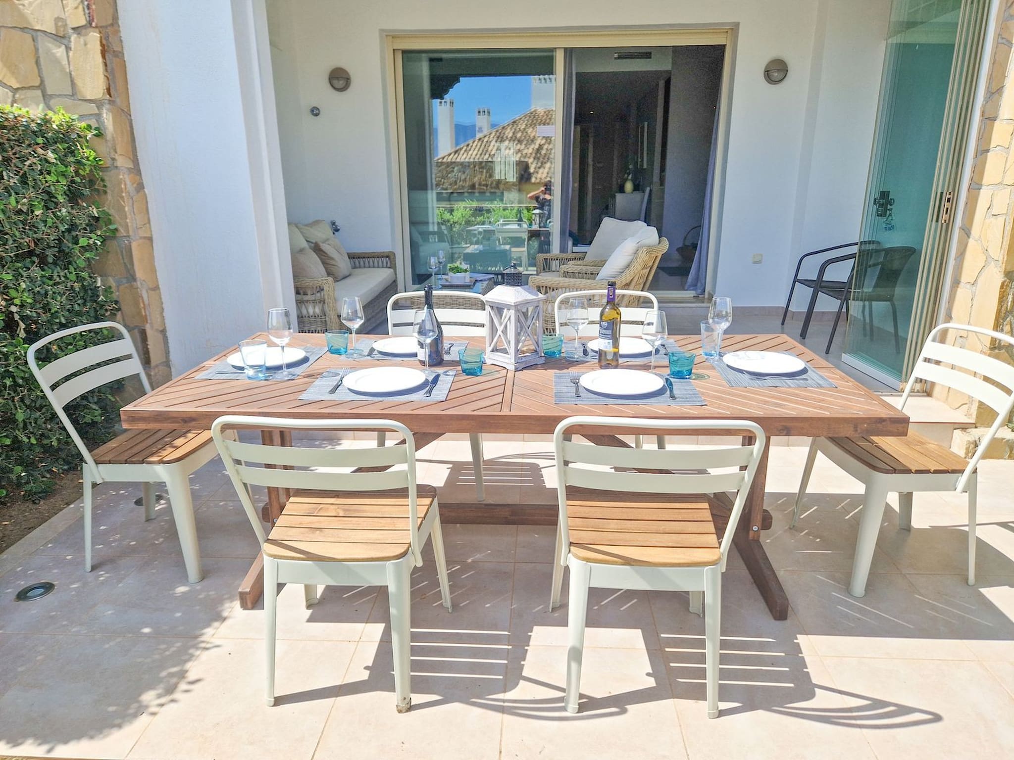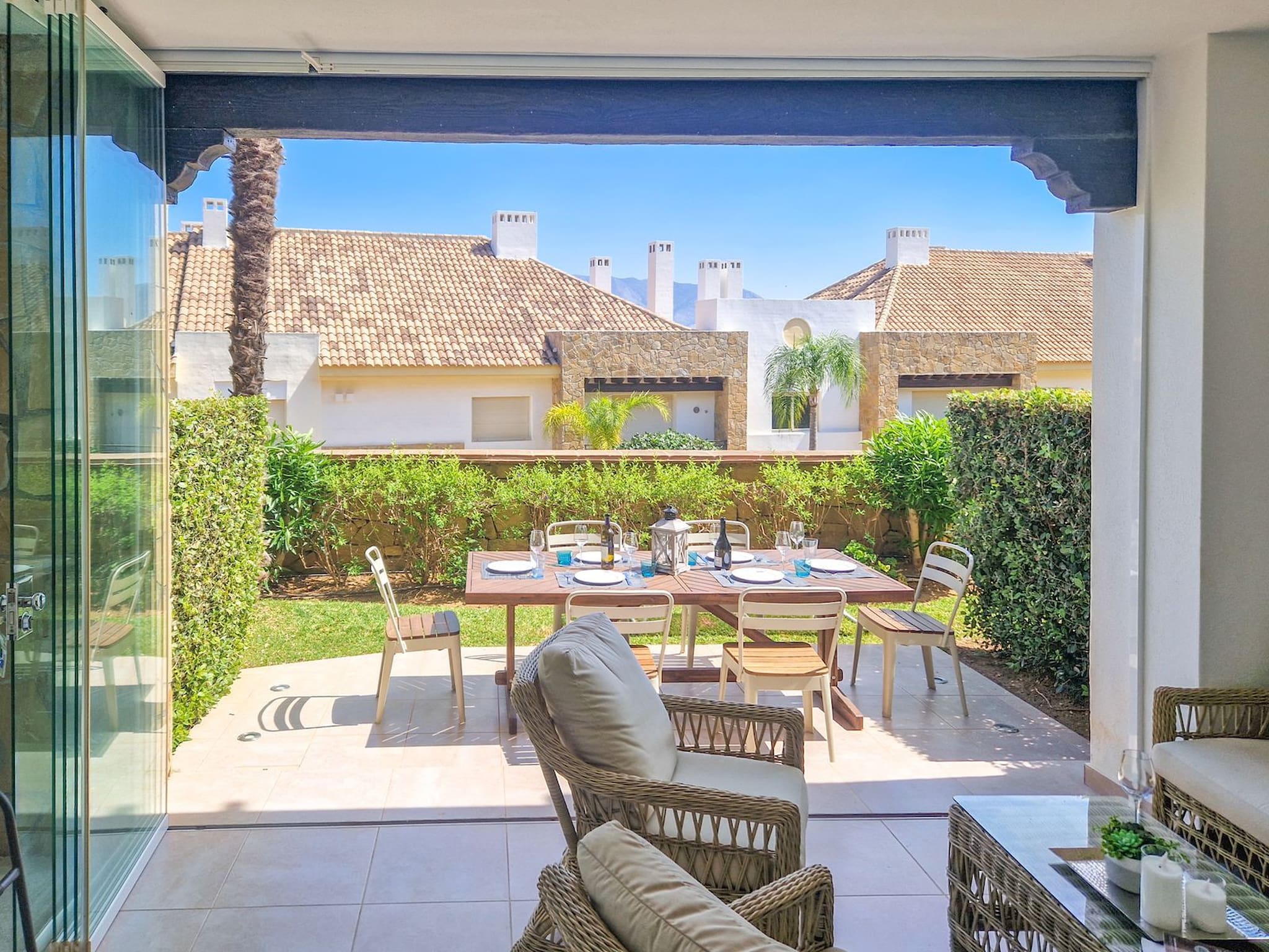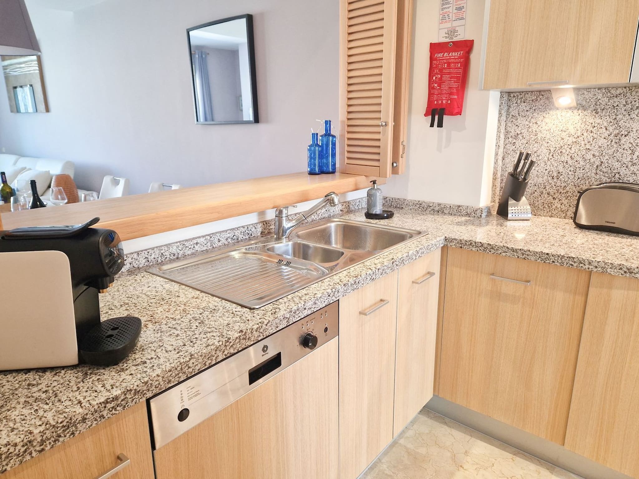 This tastefully furnished townhouse is arranged over three levels. To the front of the property there is a car port with an adjoining terrace, furnished with a dining table and chairs, which can be accessed via the kitchen. Inside the property the separate kitchen is well equipped. The spacious, open plan living room benefits from an L-shaped sofa, a recliner armchair, a 43” smart TV and a dining seating area. Leading out from the lounge, you will find the partly covered terrace, which features a lounge sofa and chairs and a charcoal BBQ. There is also a WC on this level.