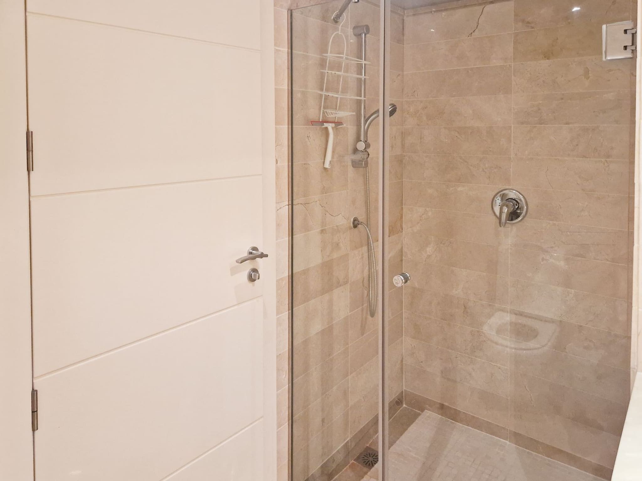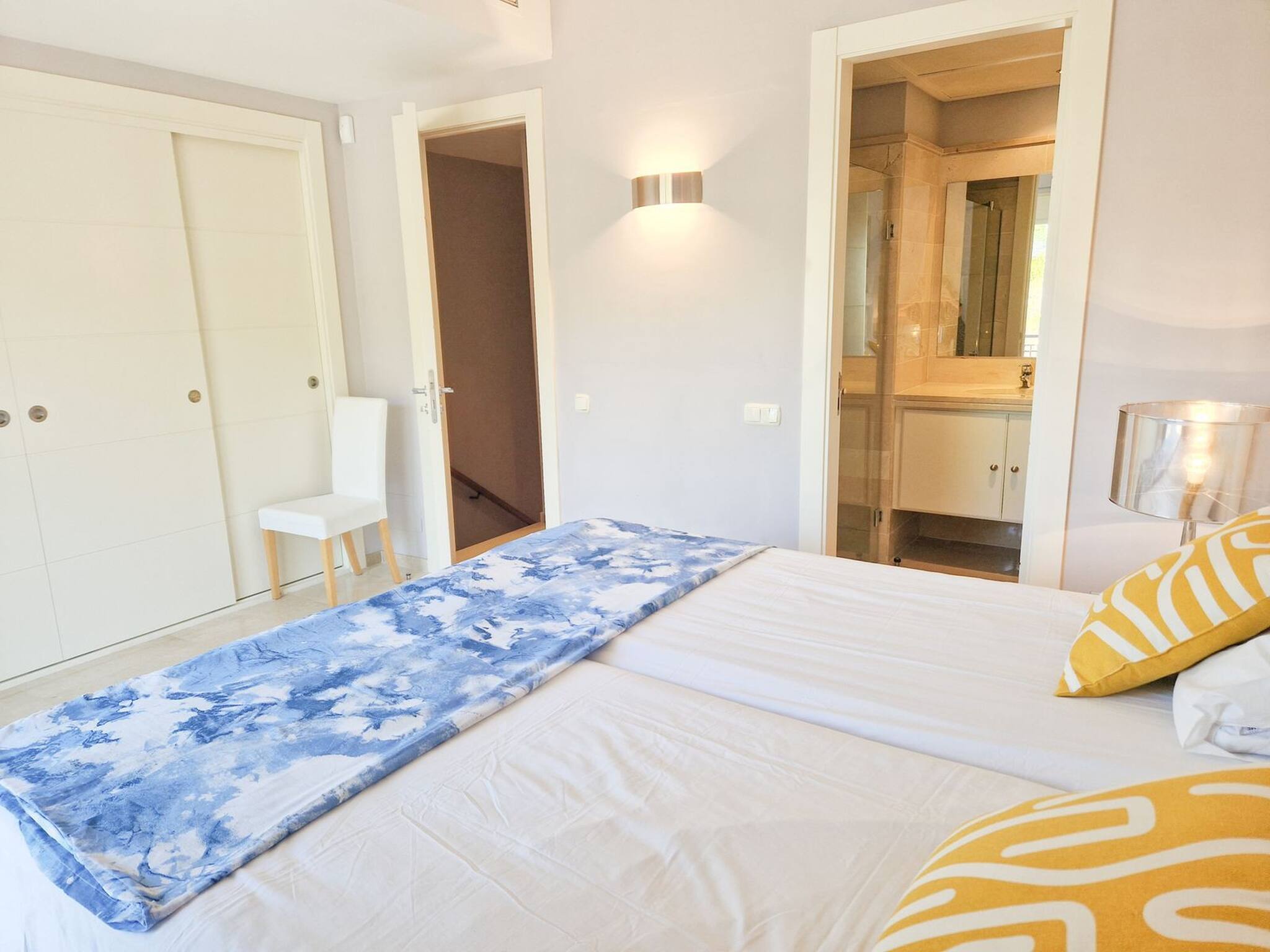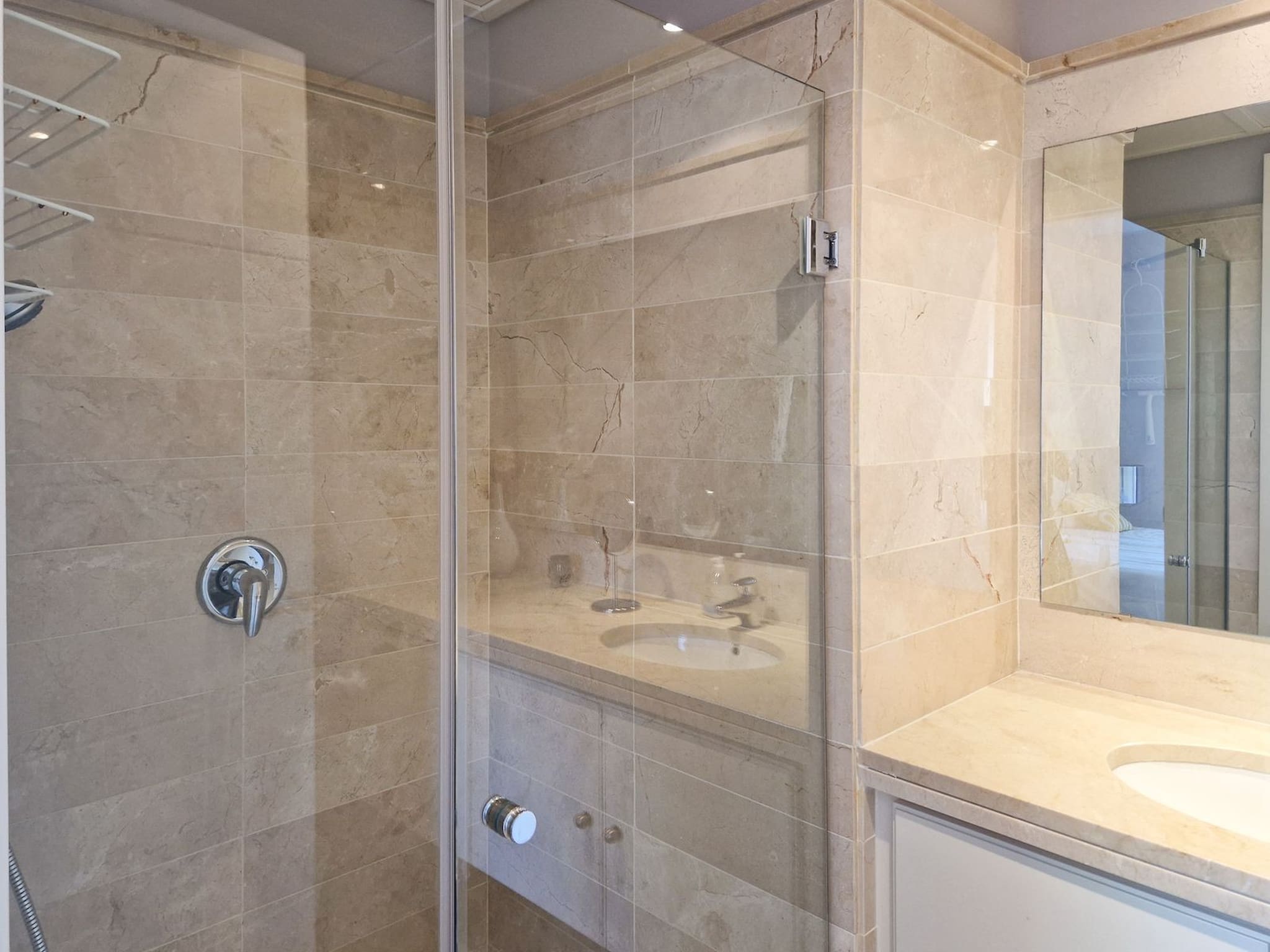 Up to the 1st floor you can find the 2 bedrooms. The master bedroom has a king size bed, fitted wardrobes, en suite bathroom with Jacuzzi bath and shower attachment and access to a private terrace. The guest bedroom benefits from 2 single beds, fitted wardrobes, an en suite shower room and access to a small terrace area.