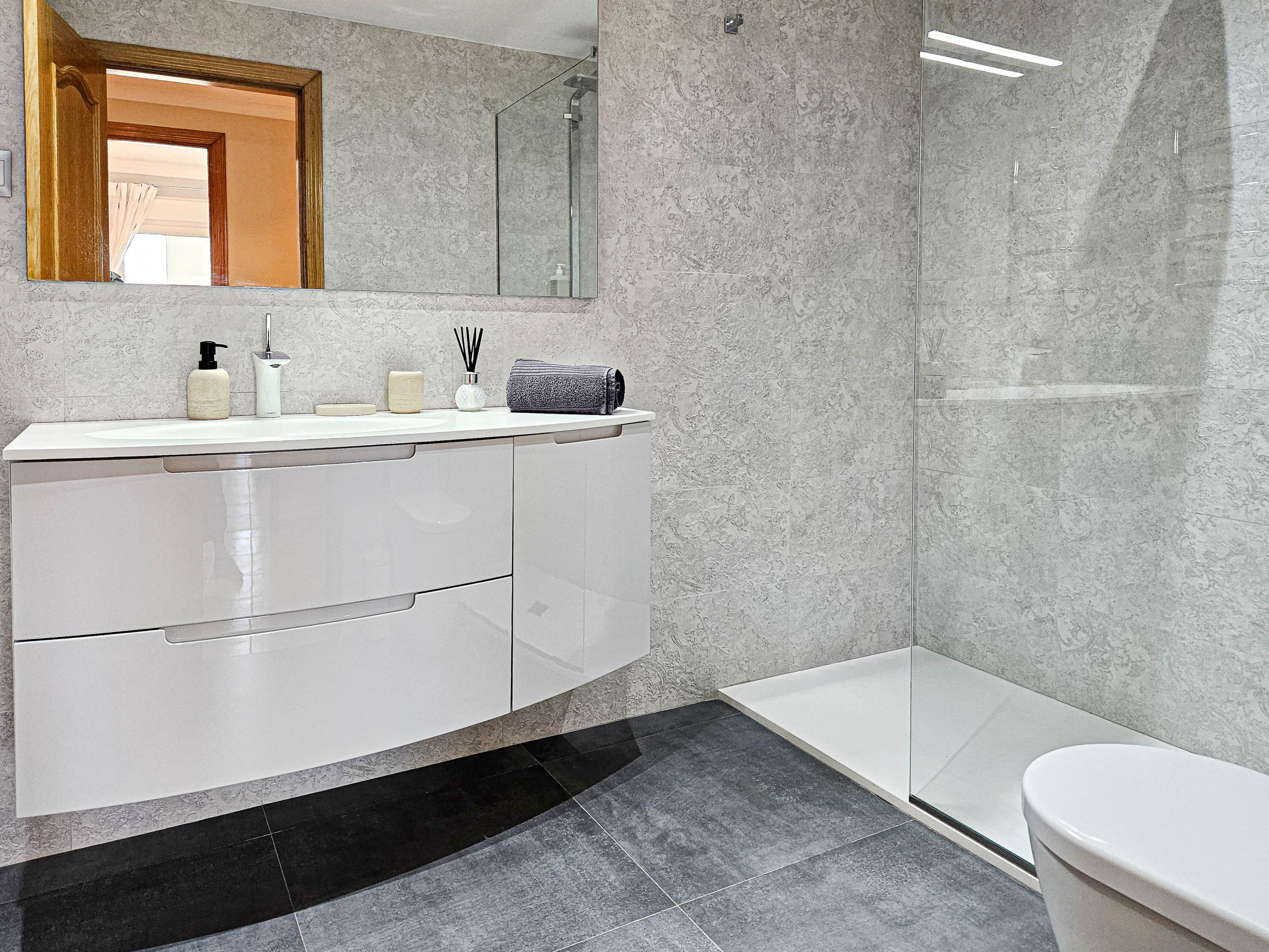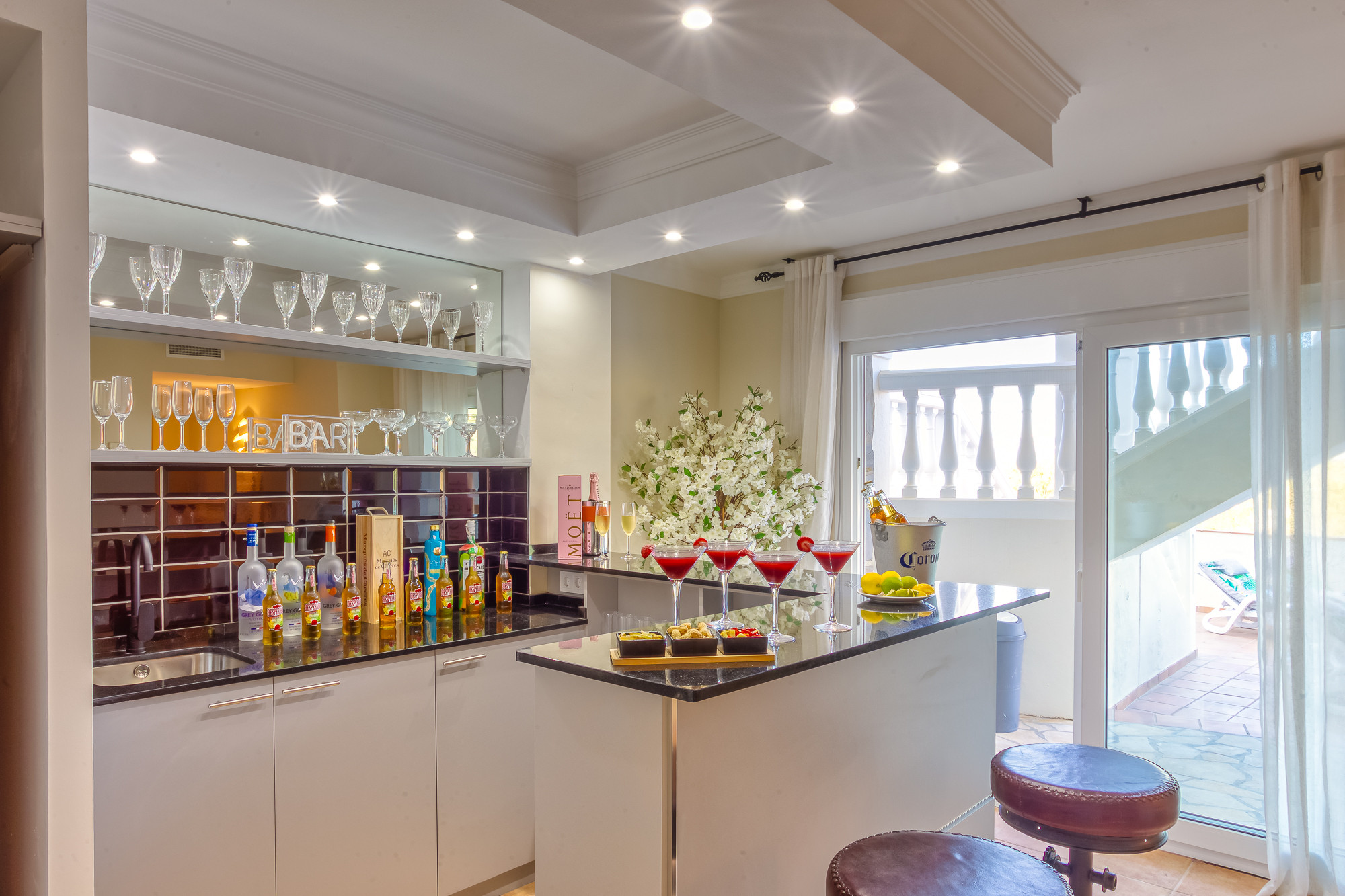The villa is tastefully furnished throughout and is arranged over two levels. The entrance hall gives access to the separate, fully equipped kitchen, which benefits from an American style fridge freezer, a kitchen island with breakfast bar and stools and a separate utility room, with a washing machine and tumble dryer. The spacious split level living room is furnished with a dining seating area, leading down to the lounge, where you can enjoy the comfortable L-shaped sofa, armchair and smart TV, with international channels. The covered terrace, garden and pool can be accessed from the lounge and dining areas.