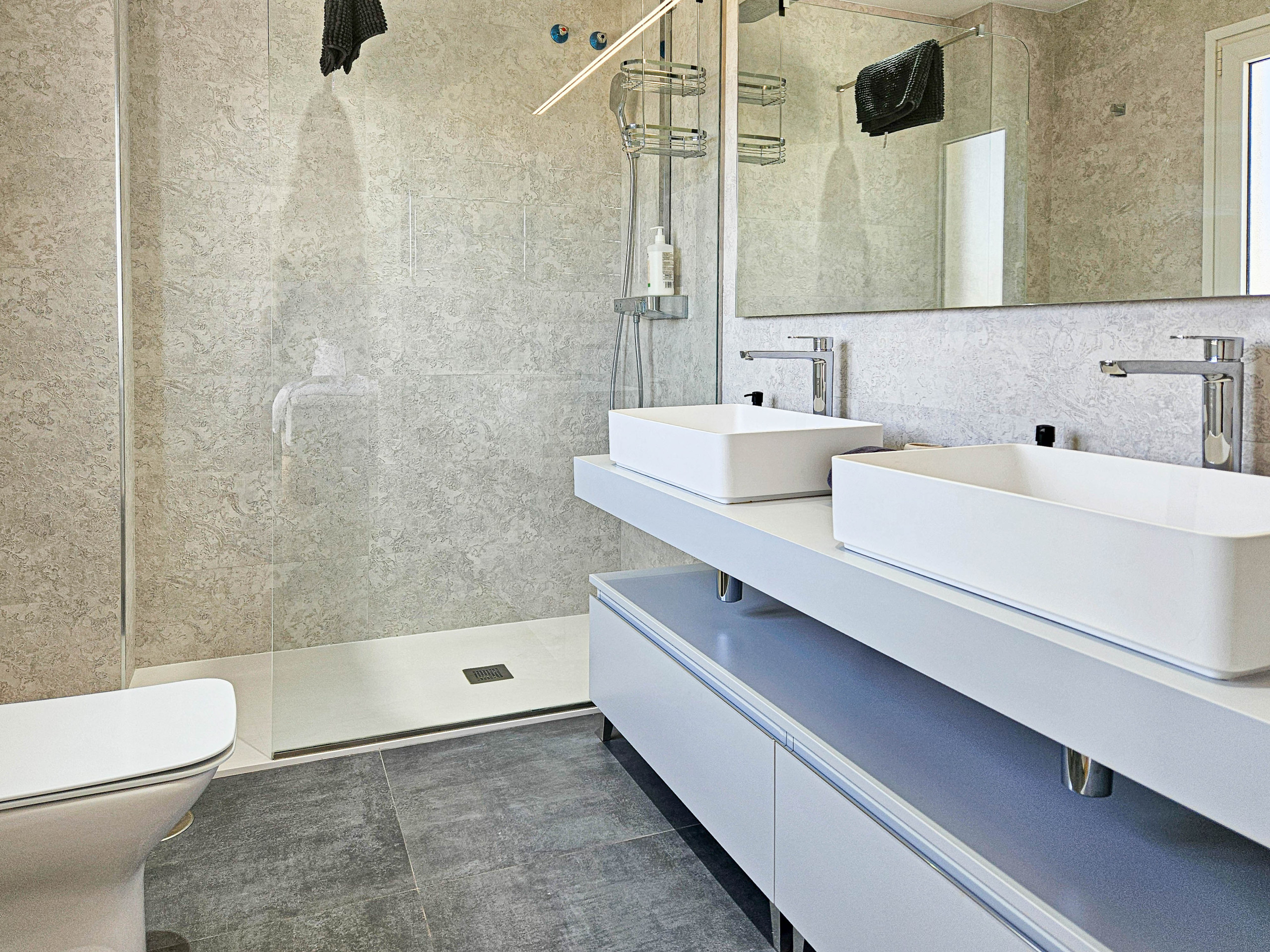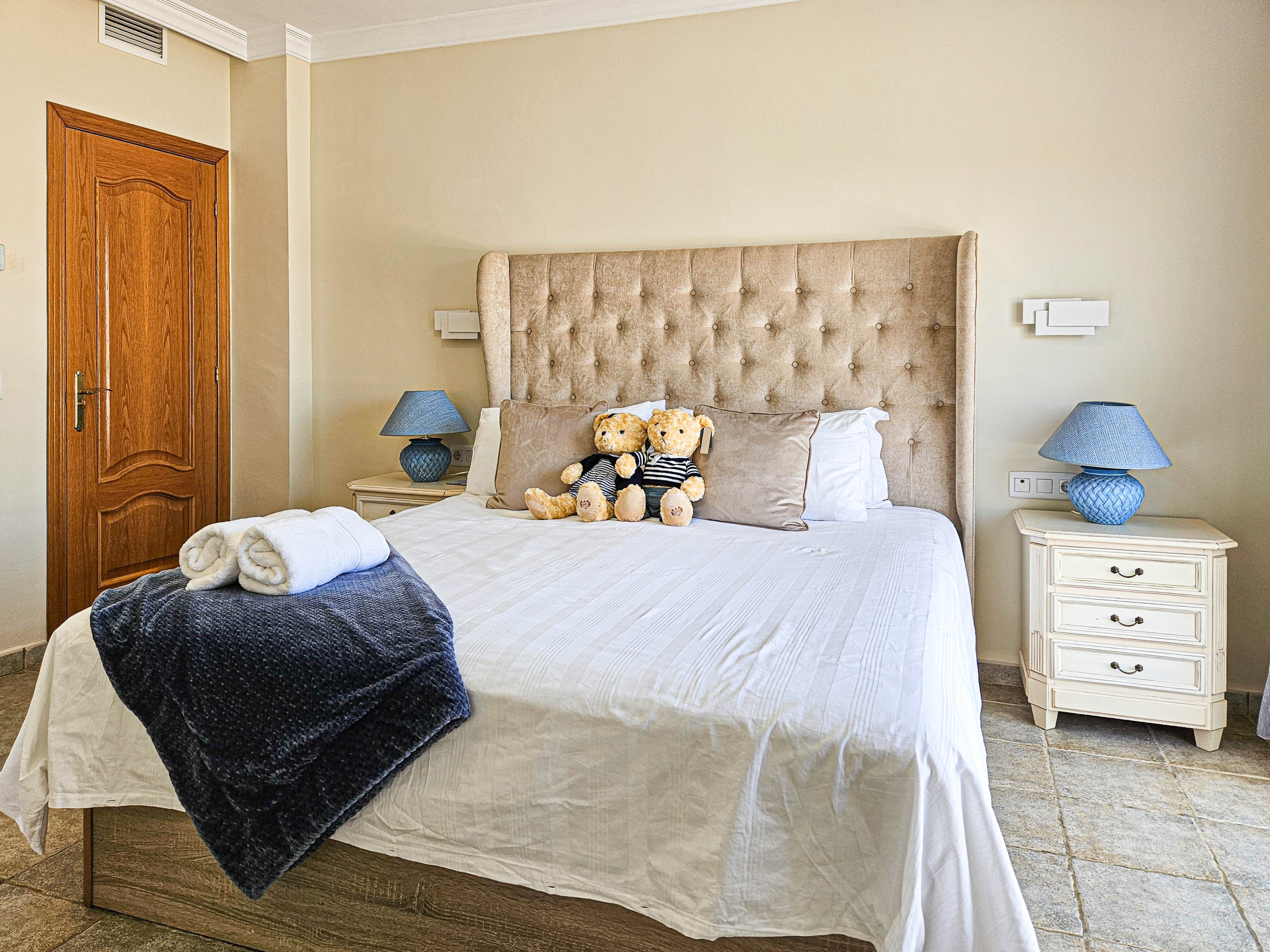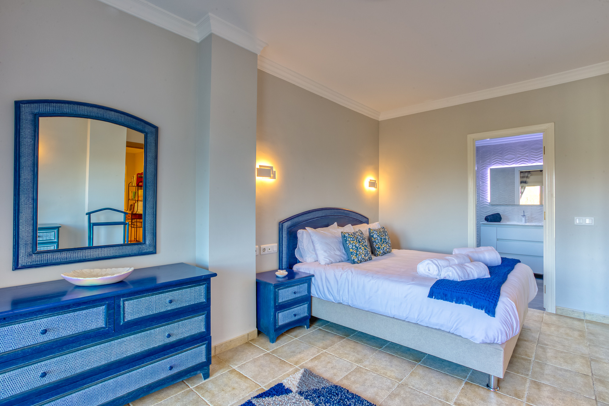 There are two bedrooms located on the ground floor. Both bedrooms offer a super king size bed, ensuite bathrooms, fitted wardrobes and shutters. The spacious master bedroom also offers a cot and benefits from direct access onto the covered terrace, pool and garden. The master ensuite bathroom is fitted with a bath with a shower attachment, a separate shower cubicle, a bidet and double sinks. The second bedroom offers an ensuite shower room. There is also a WC on this level. Two further guest bedrooms can be found on the first floor. Both spacious bedrooms are furnished with twin beds, fitted wardrobes and shutters. There is also a guest bathroom on this level, fitted with a bath with a shower attachment.
