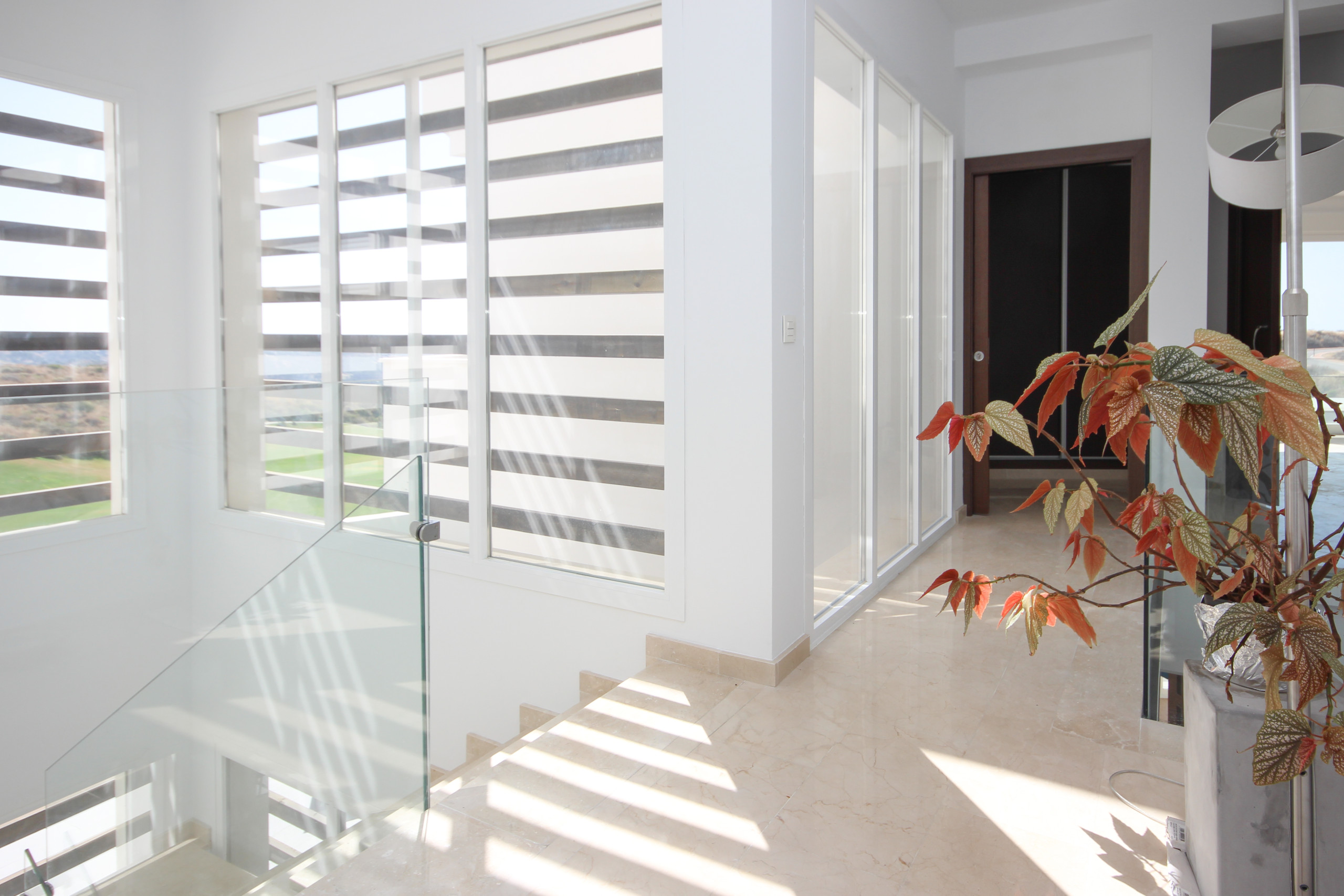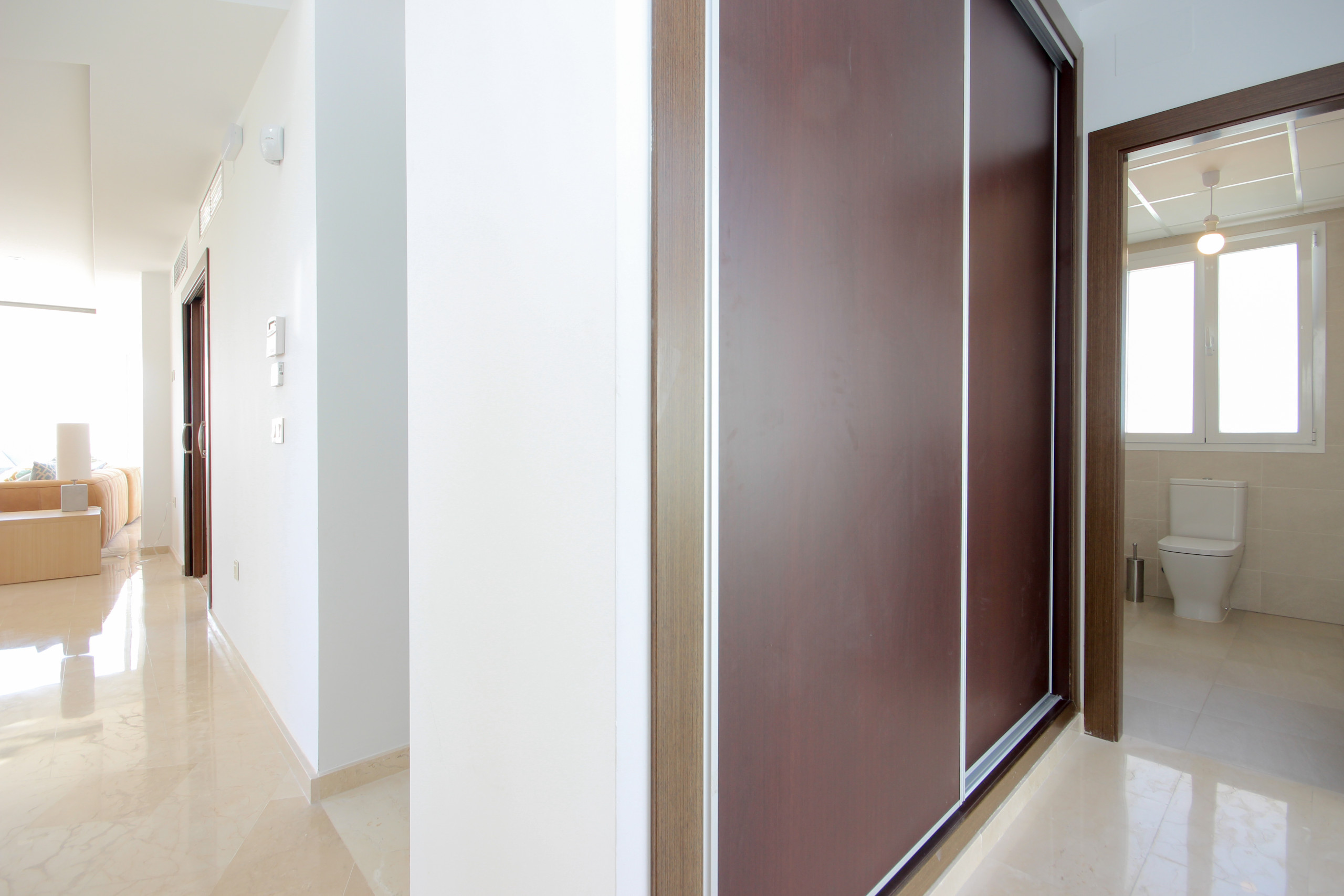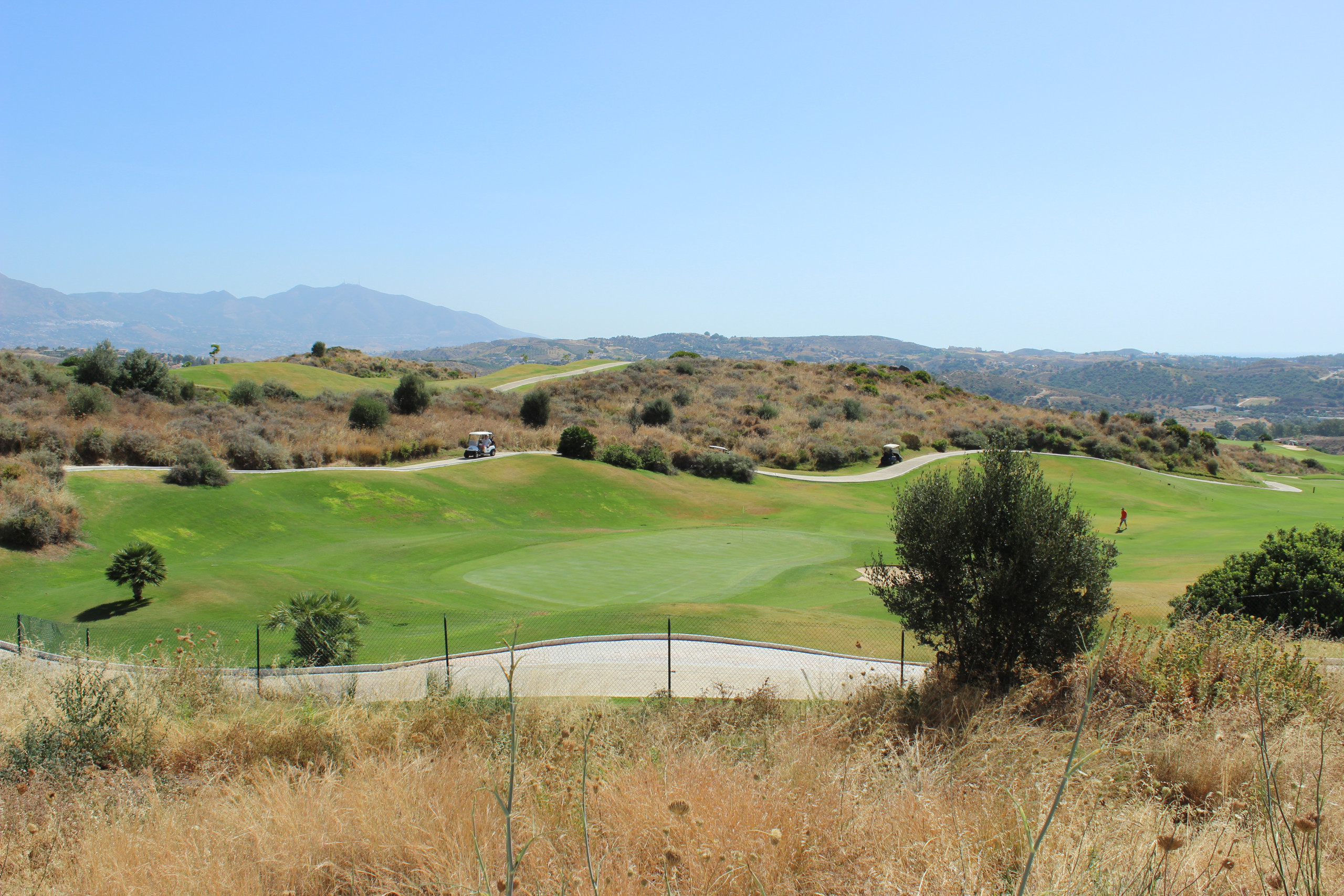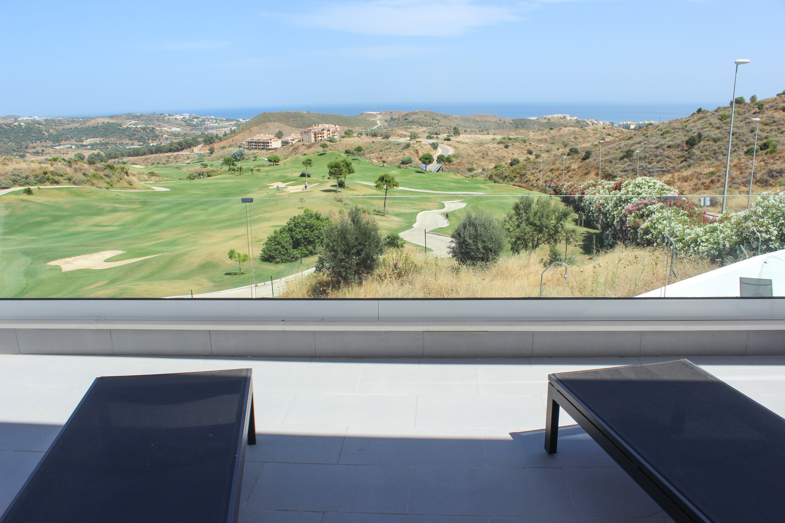 Take the stairs to the upper floor and the 3 further bedrooms. The master suite has a super king size bed, walk in dressing room and benefits from a south facing terrace furnished with sun beds offering some spectacular views down the fairway to the sea. This master has its own full bathroom with separate WC, an elevated whirlpool bath with views to the sea, large shower and twin sinks. The 2 other large bedrooms are both furnished with super king size beds, fitted wardrobes and enjoy en suite bathrooms with walk in showers as well as their own small terraces.