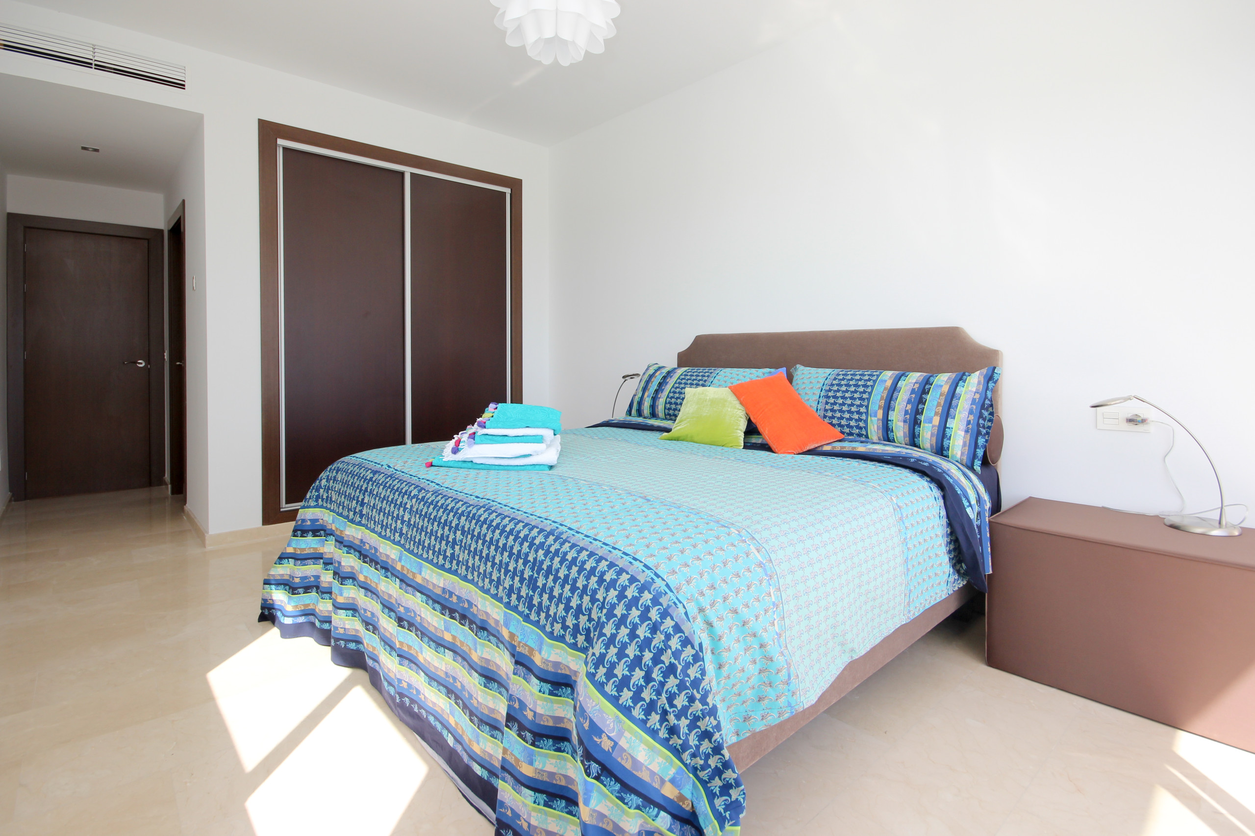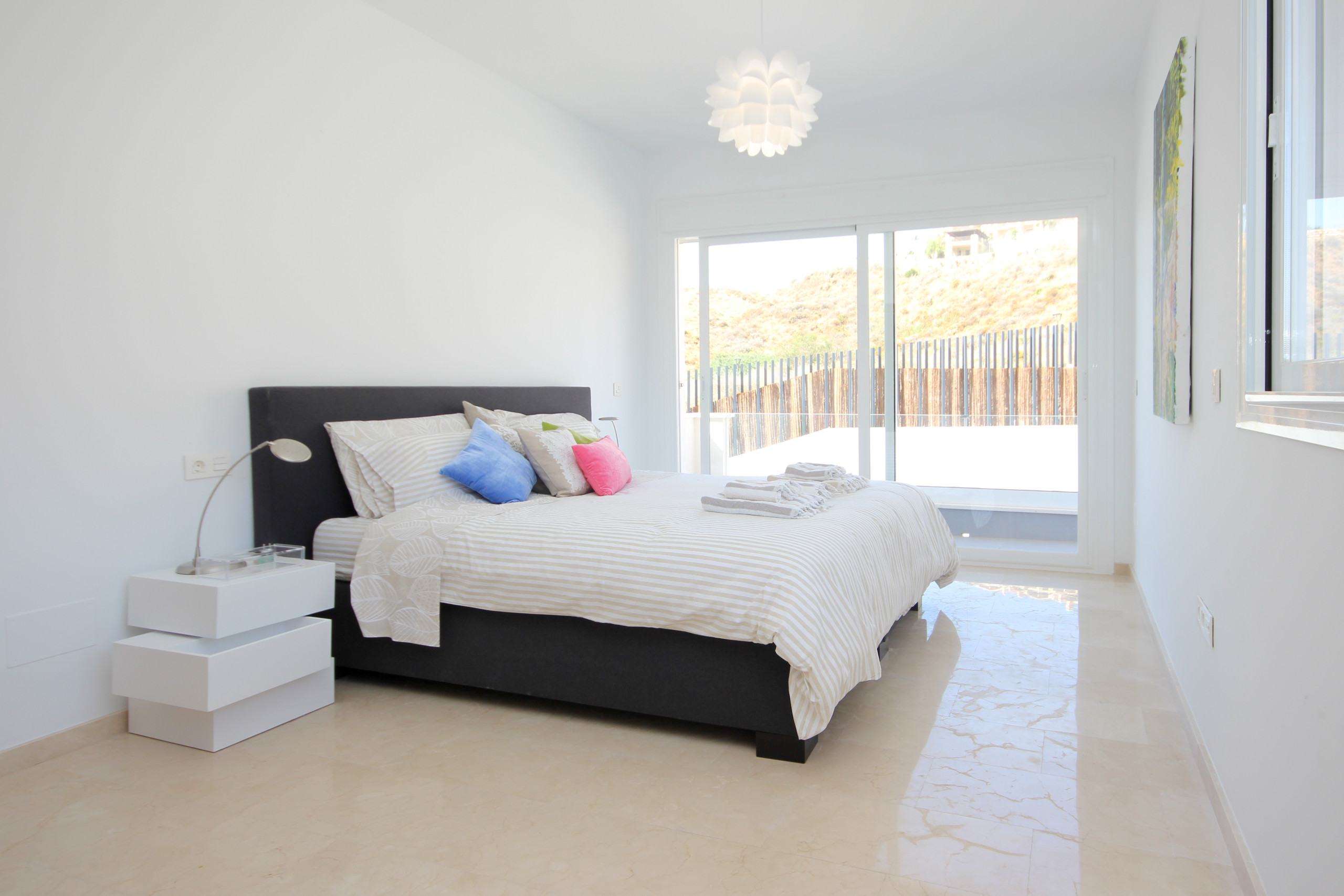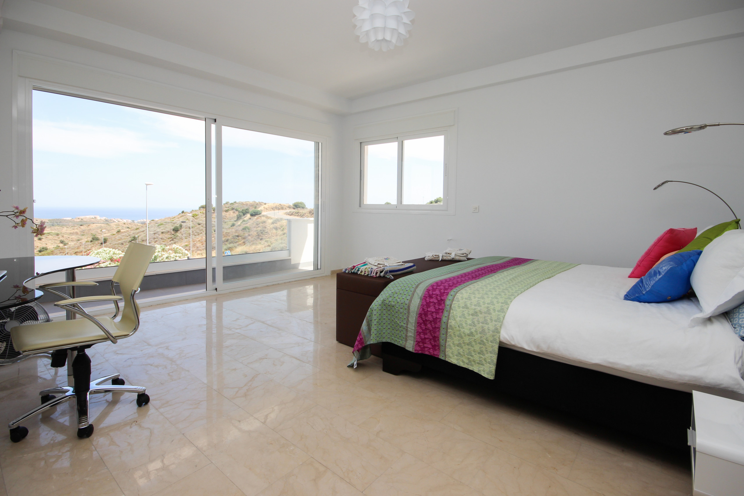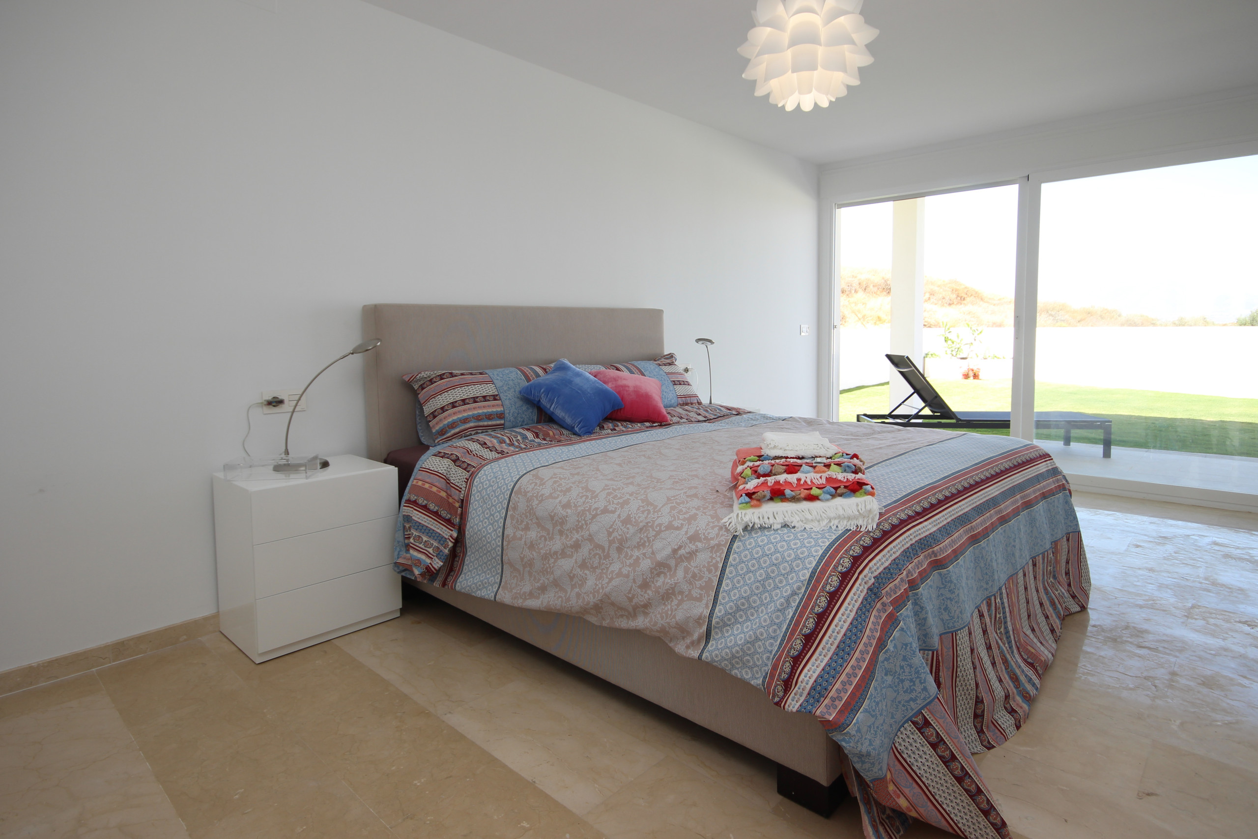 The spacious open kitchen is off the lounge and is equipped with top of the range appliances, a breakfast bar and access to the main pool area terrace. Off the kitchen is a laundry room with washing machine. One of the large bedrooms is located on this floor with fitted wardrobes and large super king size bed (The option of a cot, high chair and car seat on request when booking), en suite bathroom with walk in shower and direct access to terrace and gardens.