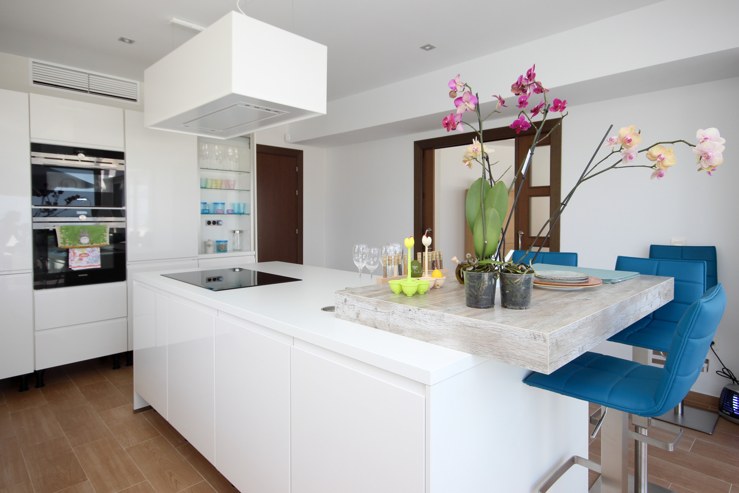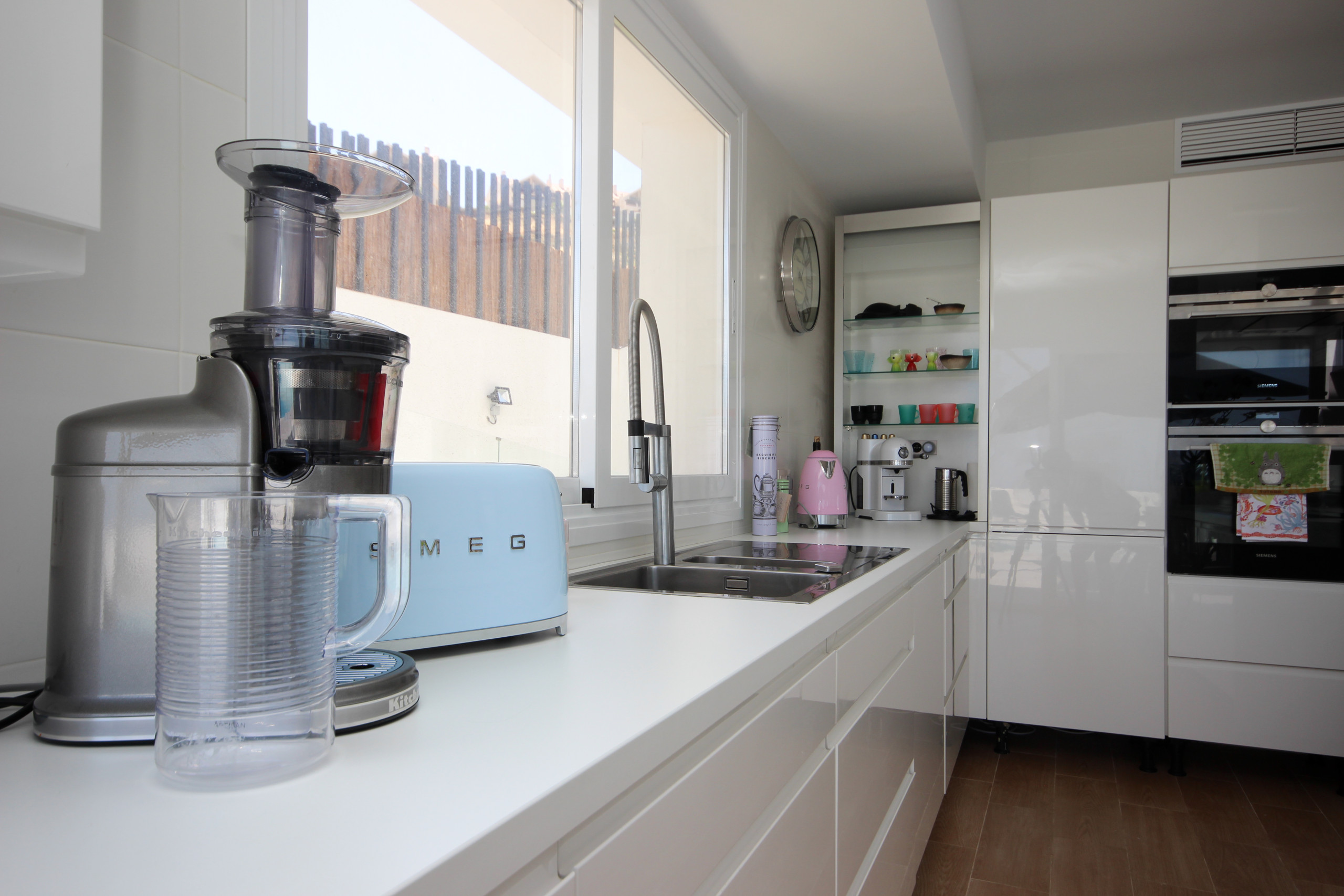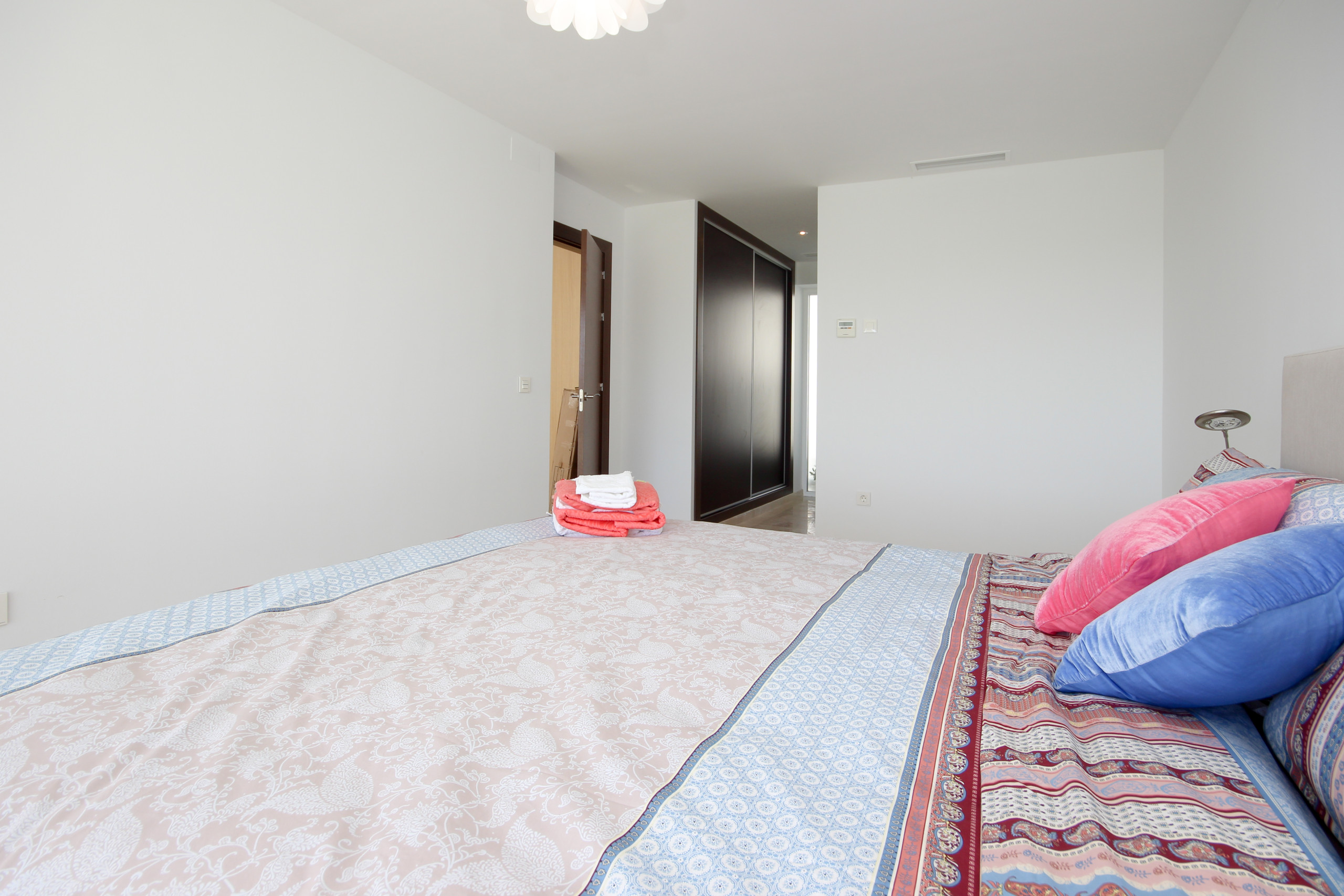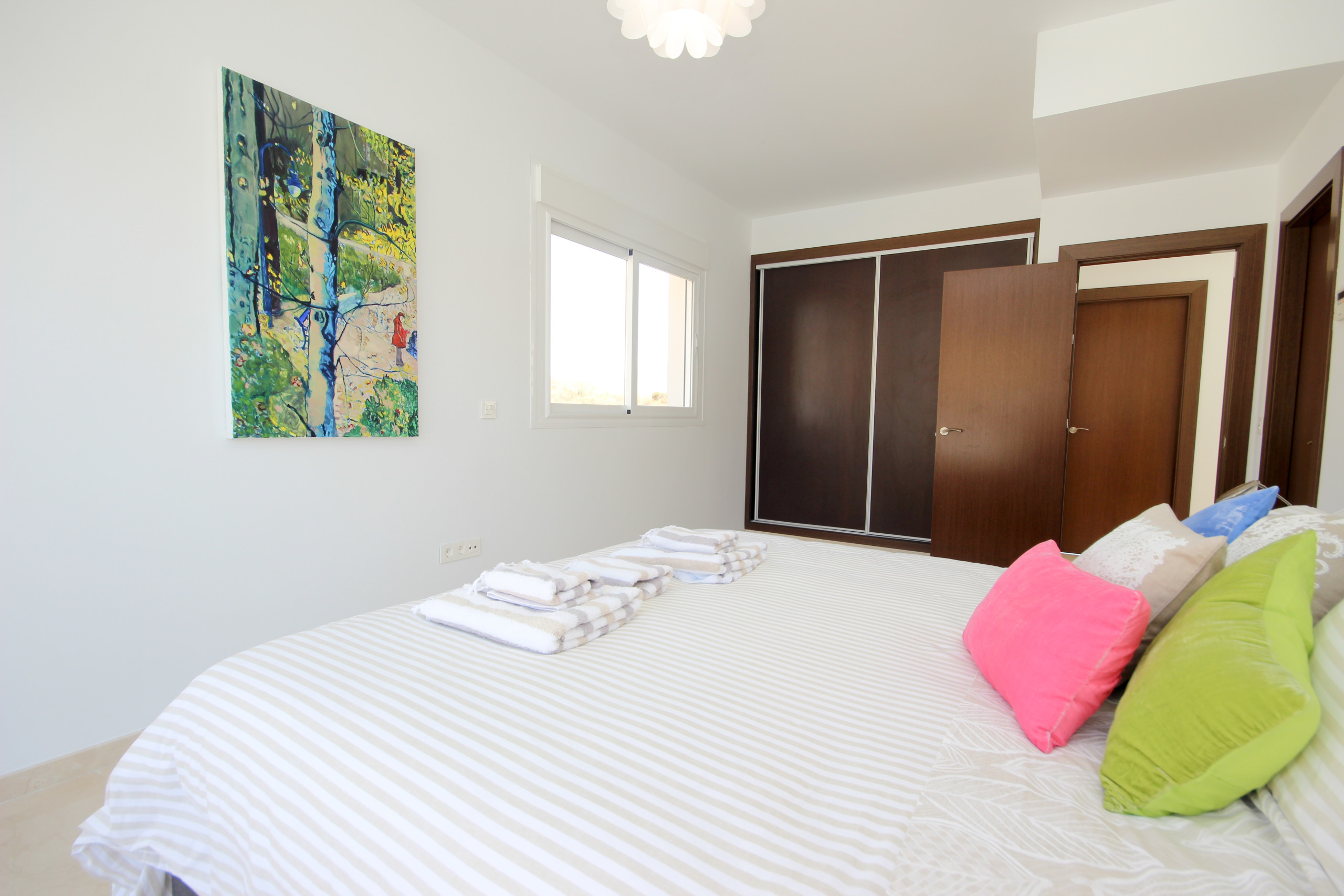 The spacious open kitchen is off the lounge and is equipped with top of the range appliances, a breakfast bar and access to the main pool area terrace. Off the kitchen is a laundry room with washing machine. One of the large bedrooms is located on this floor with fitted wardrobes and large super king size bed (The option of a cot, high chair and car seat on request when booking), en suite bathroom with walk in shower and direct access to terrace and gardens.