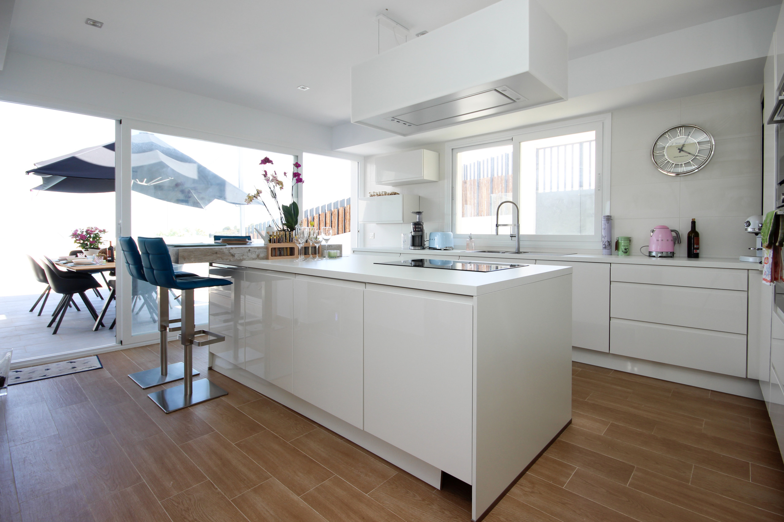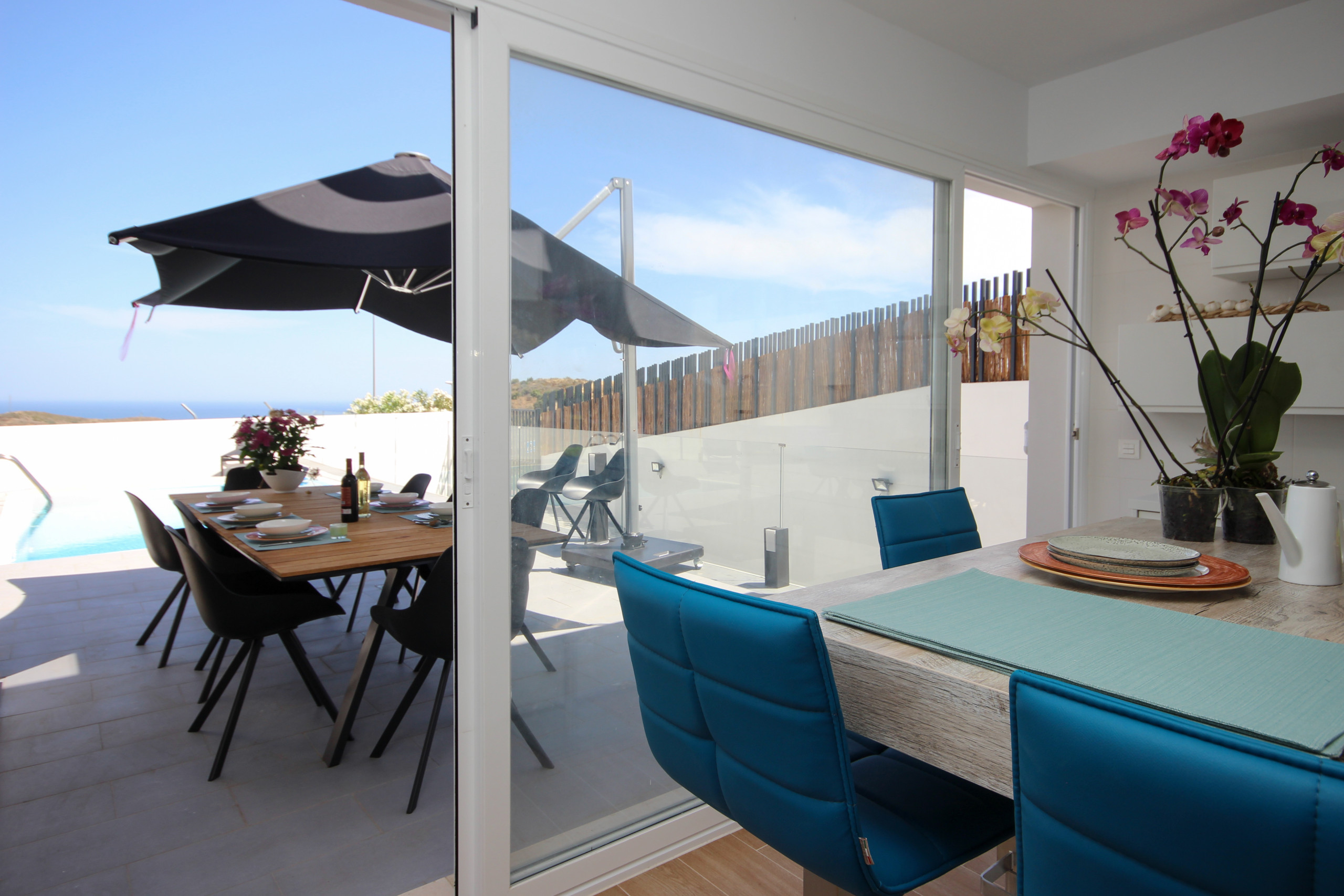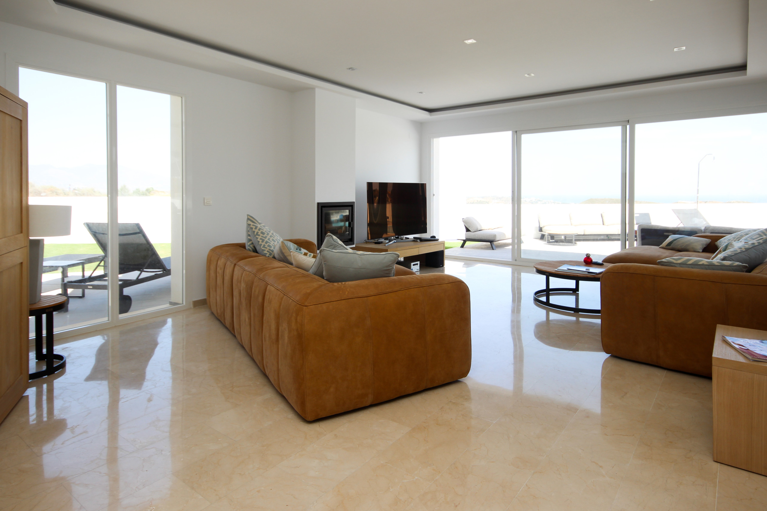 Enter the property into the spacious, open plan hallway with elevated ceilings and floor to ceiling windows making this area light and airy. Continue through into the large lounge area with its huge comfortable sofas, a 68' curved TV, wifi and a wood burning chimney. From the lounge you gain direct access to the pool terrace area and side lawn area. The terrace has a seating area, sun loungers, large dining area with parasol and access to the side terraces and a large lawn.