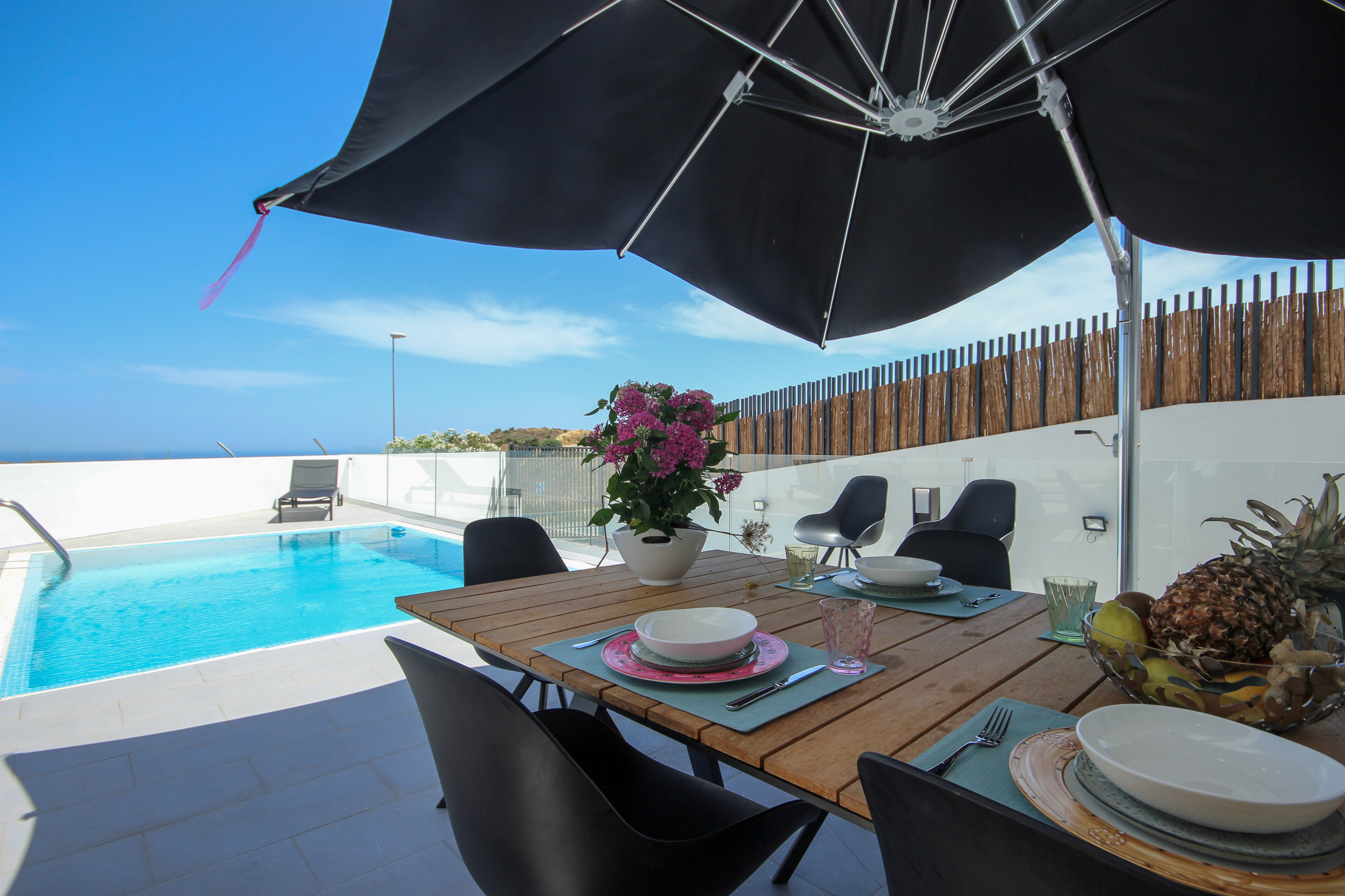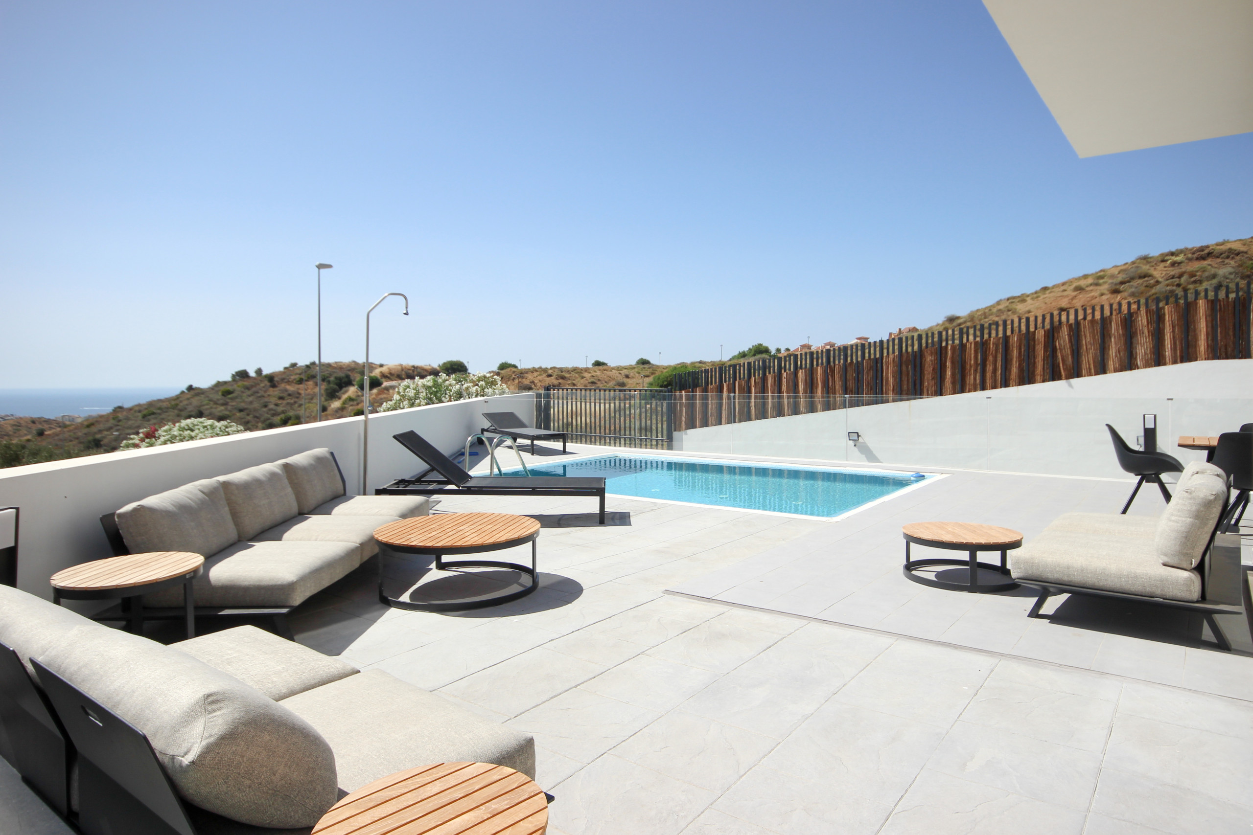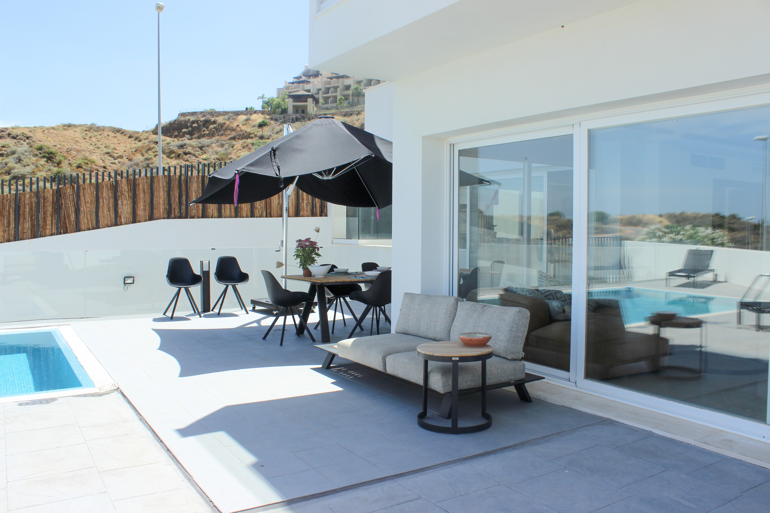 The covered terrace offers a lounge seating area, a dining seating area, with awnings available to escape the sun or cooler weather and a gas BBQ. Take the steps down to enjoy the sun loungers, large private garden and pool area.