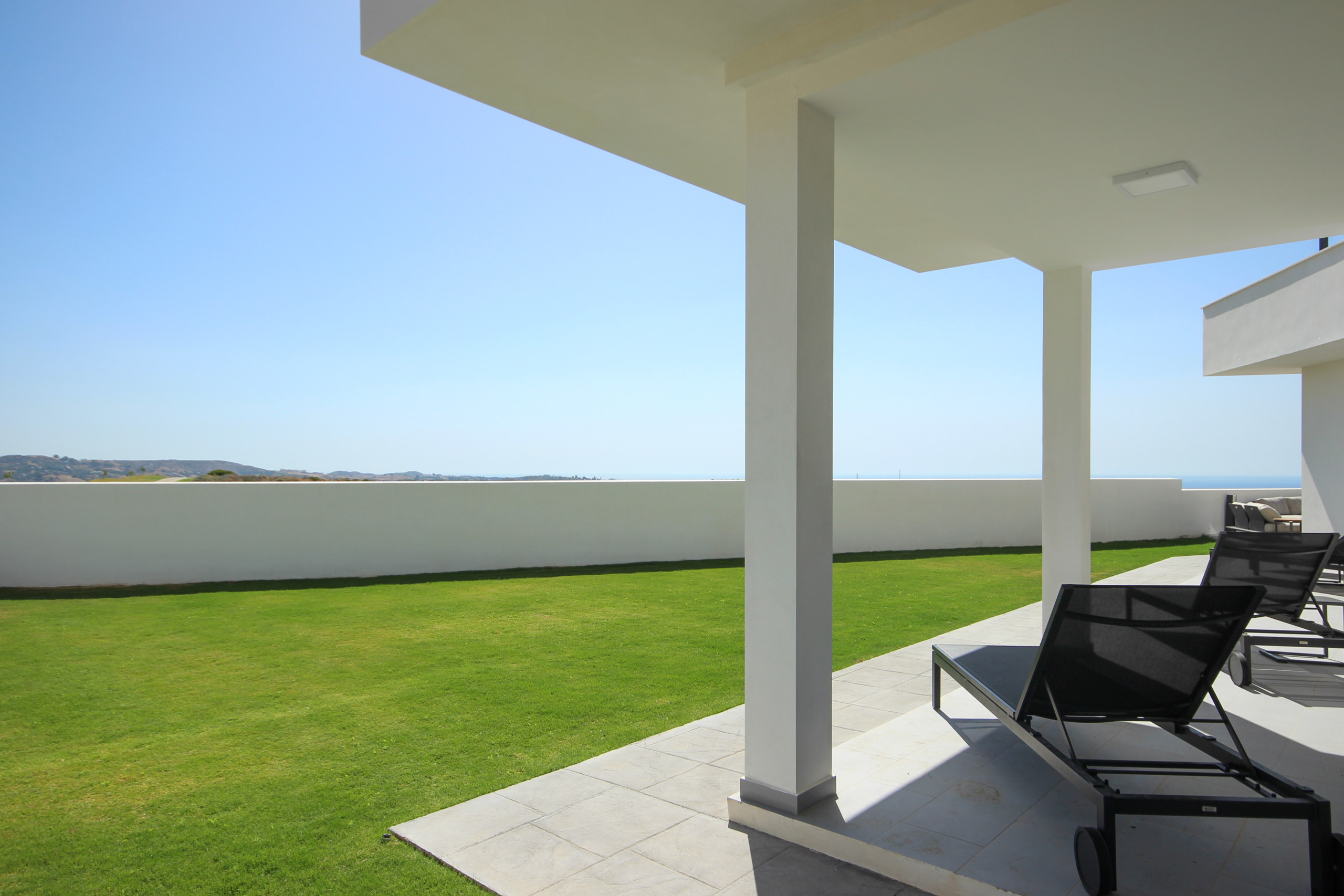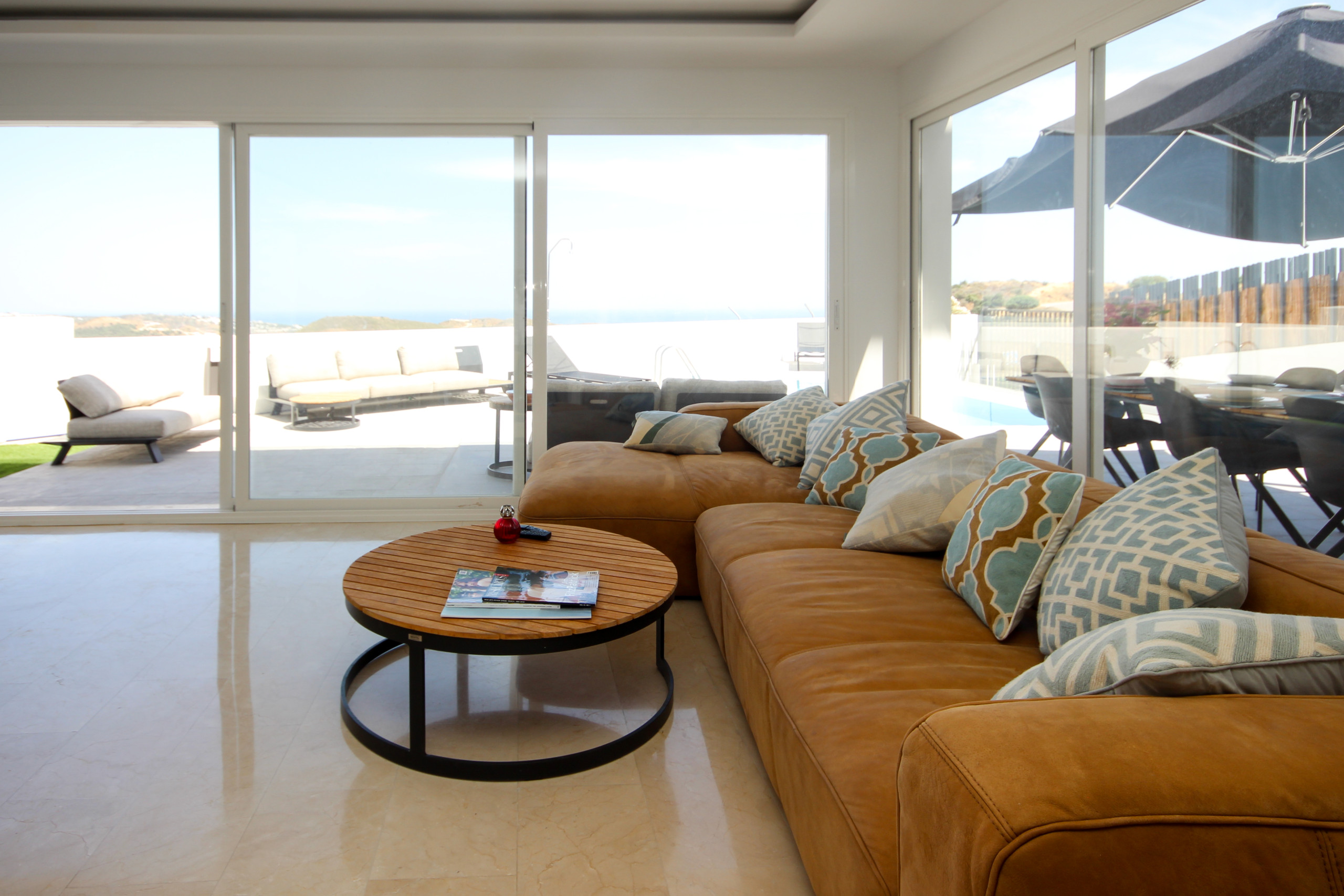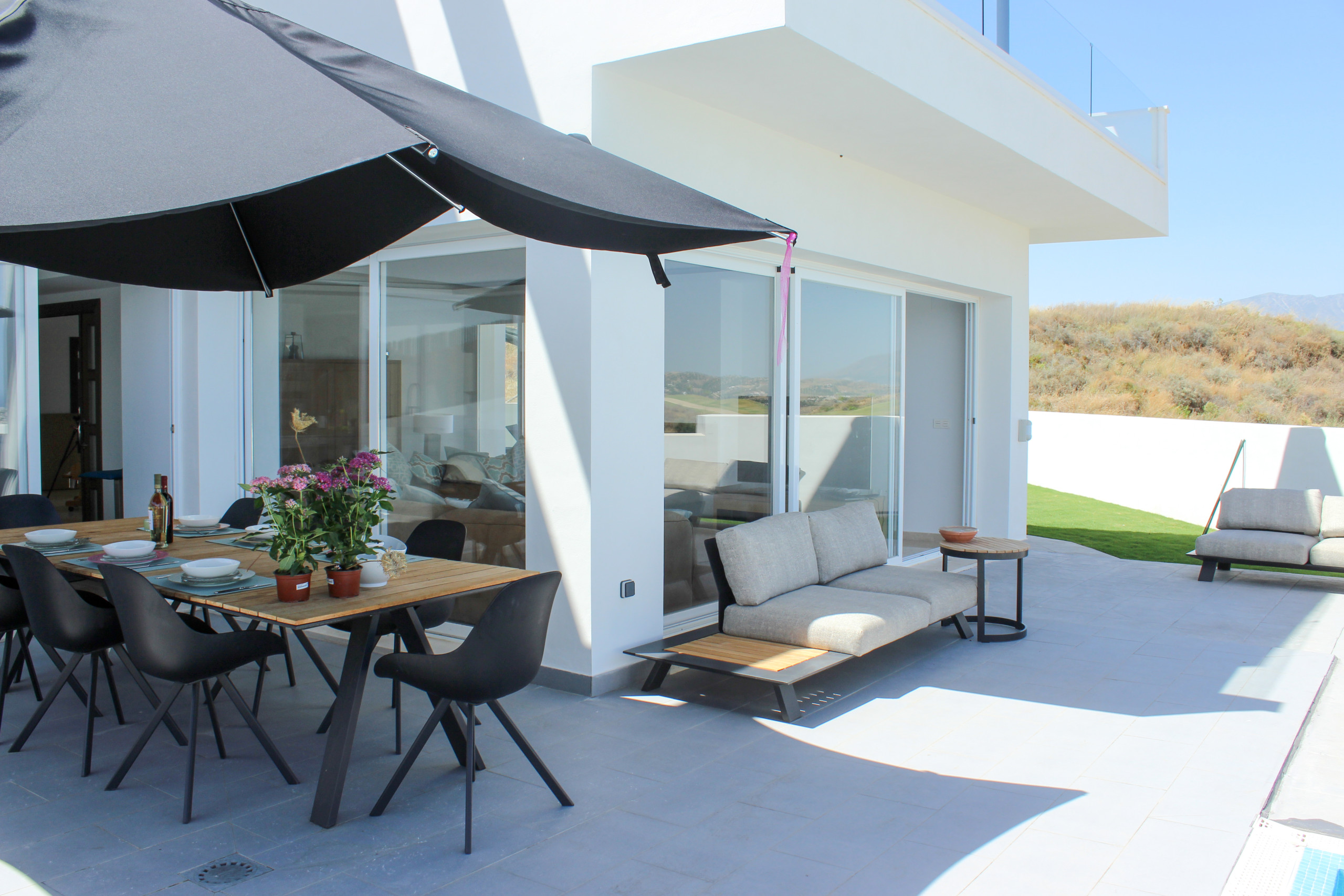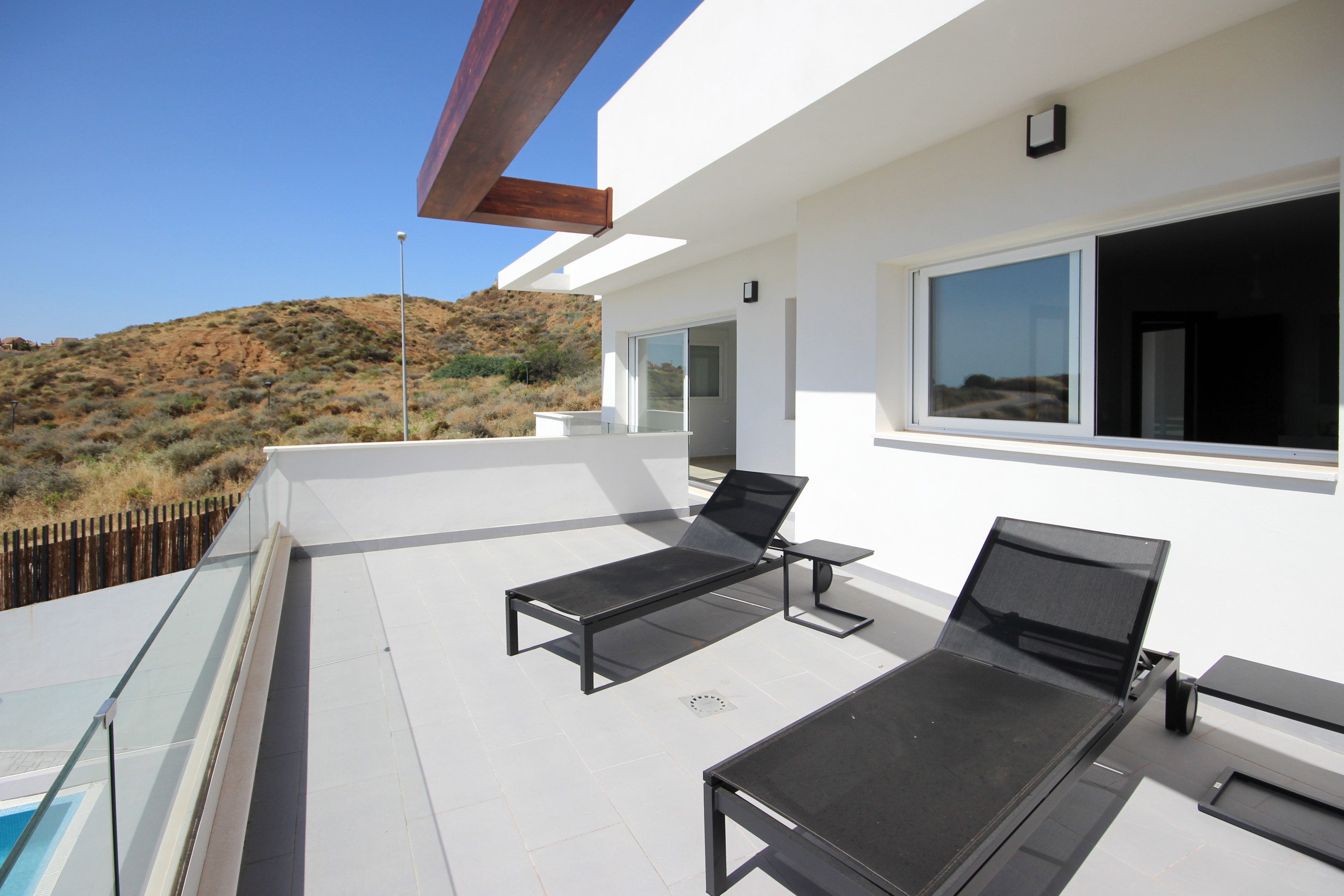 The covered terrace offers a lounge seating area, a dining seating area, with awnings available to escape the sun or cooler weather and a gas BBQ. Take the steps down to enjoy the sun loungers, large private garden and pool area.
