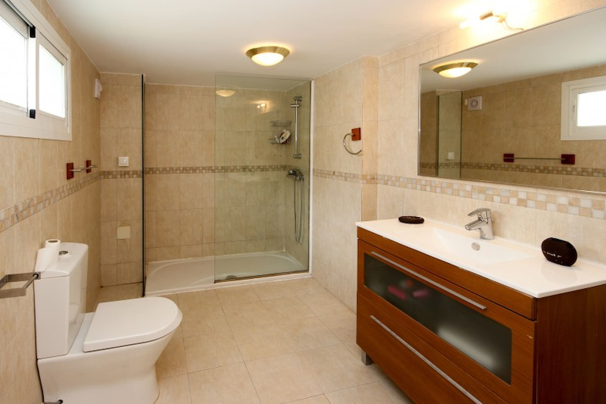 There are two bedrooms located on the ground floor. Both bedrooms offer a super king size bed, ensuite bathrooms, fitted wardrobes and shutters. The spacious master bedroom also offers a cot and benefits from direct access onto the covered terrace, pool and garden. The master ensuite bathroom is fitted with a bath with a shower attachment, a separate shower cubicle, a bidet and double sinks. The second bedroom offers an ensuite shower room. There is also a WC on this level. Two further guest bedrooms can be found on the first floor. Both spacious bedrooms are furnished with twin beds, fitted wardrobes and shutters. There is also a guest bathroom on this level, fitted with a bath with a shower attachment.